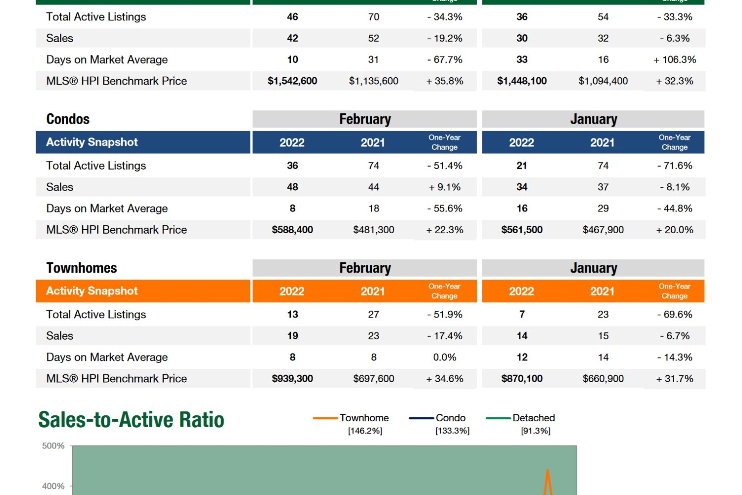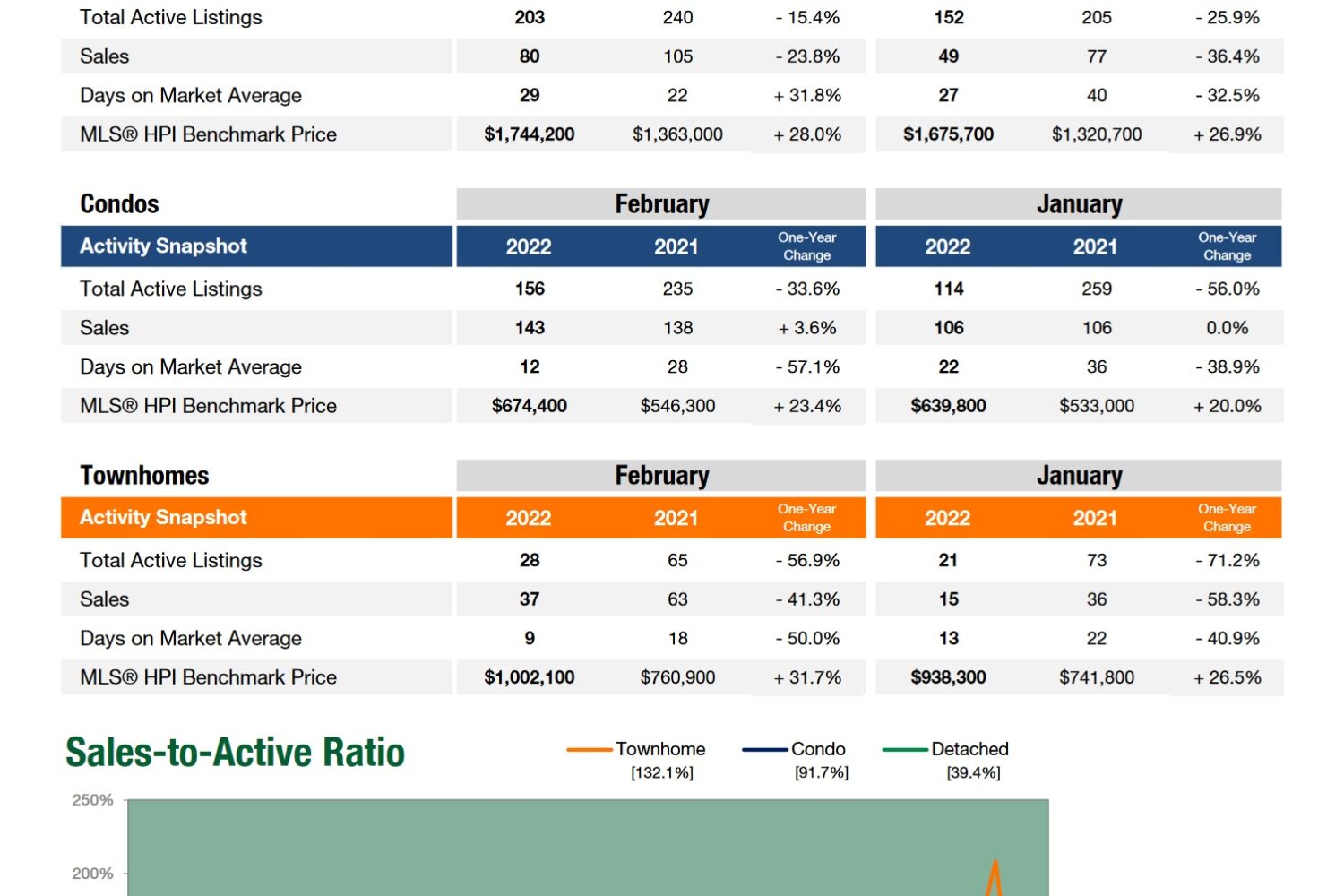 Benchmark prices up accross the board, between 31.8% - 42.1% compared to February 2021.The February benchmark for detached homes was $389,000 higher than its 2021 counterpart. …
