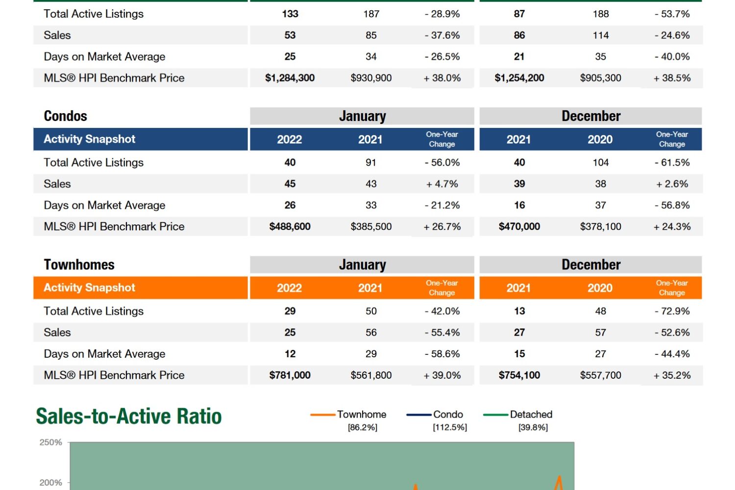 Benchmark prices are up across the board in Port Coquitlam between 20-32.3% over thier 2021 counterparts. The January benchmark for detached homes was $353,700 higher than …