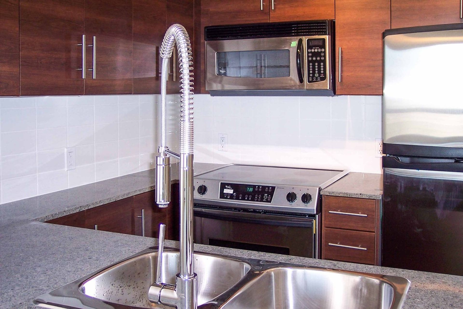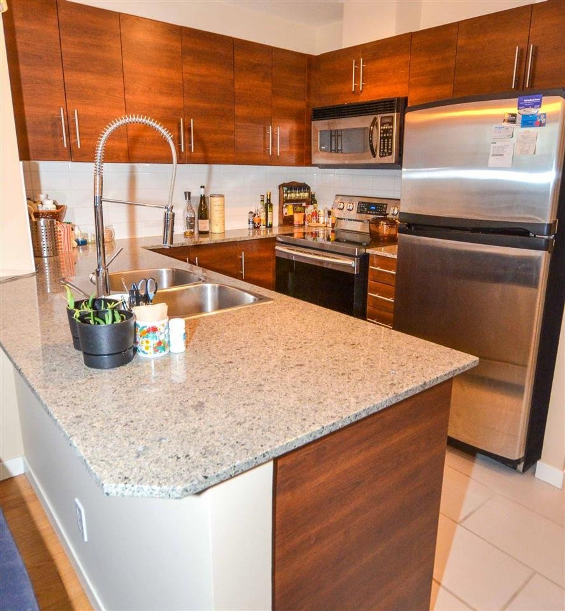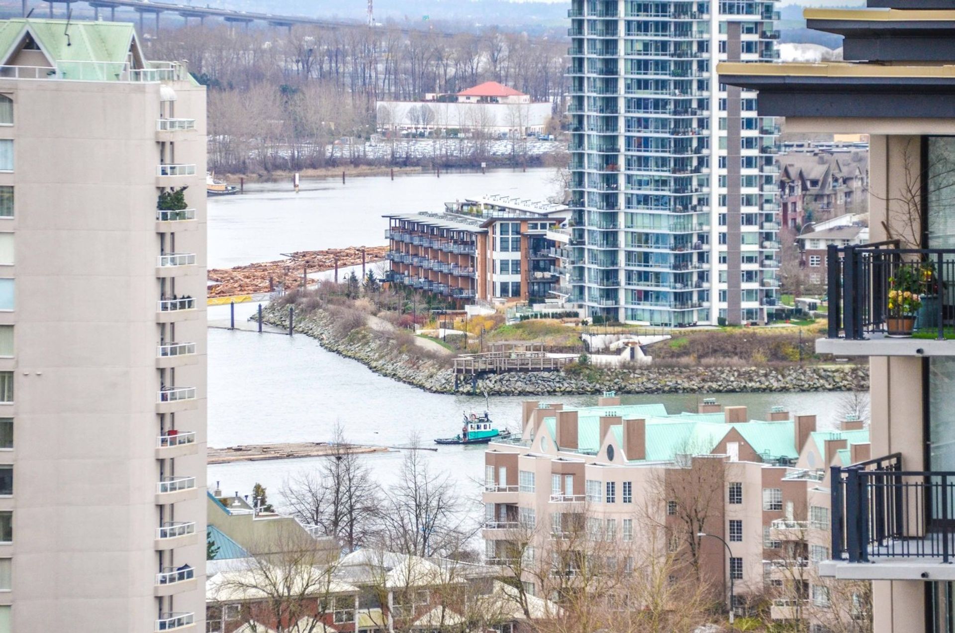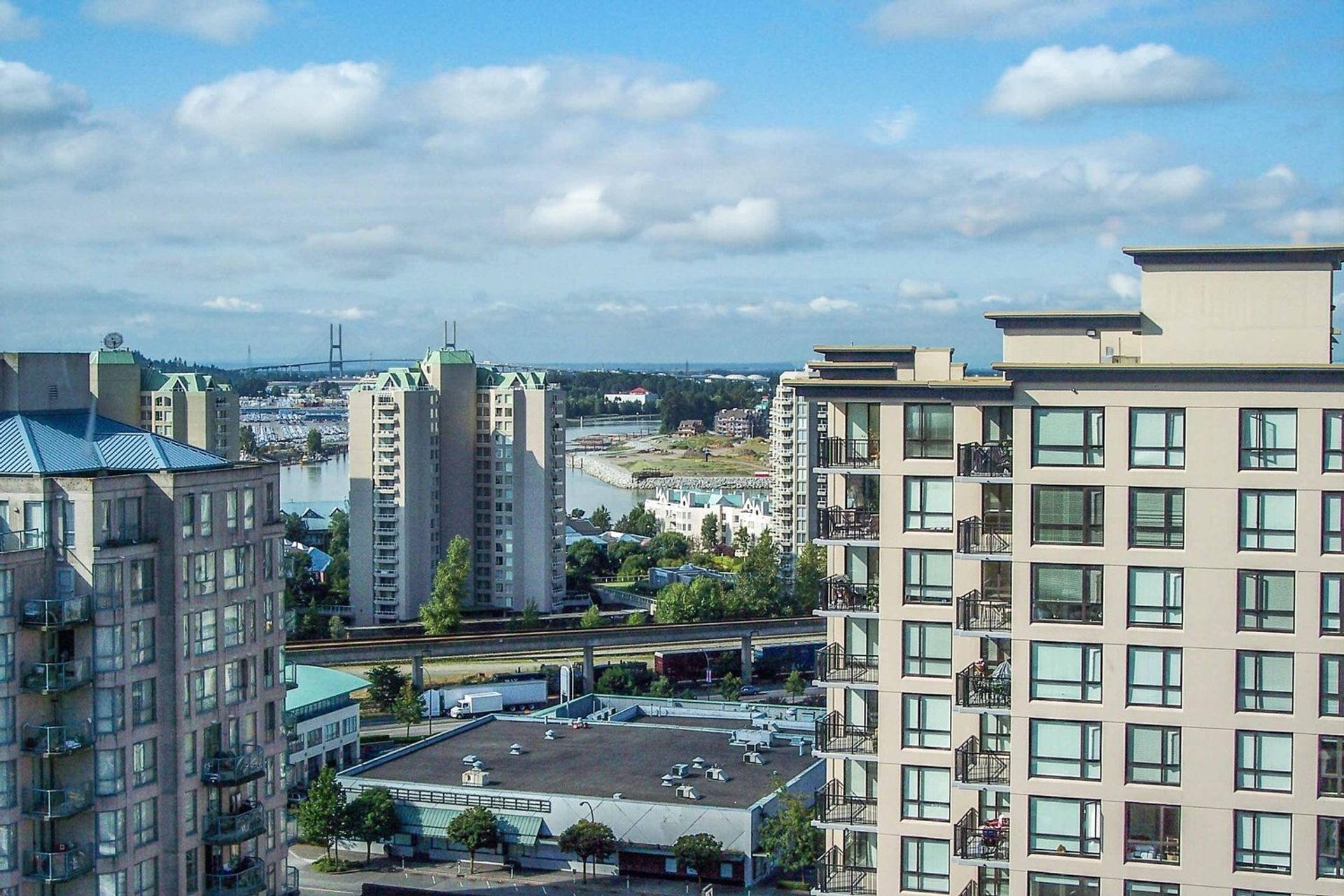 WOW two bedroom & media room and a fantastic layout utilizing every square foot. BONUS two parking spots. Kitchen eating bar with vintage accent lighting, new stainless steel stove, subway tiling, builtin microwave, tile backsplash, ample cupboard space. Laminate floor stretch through homes open concept dinrm & into living rm. Check out the oversized windows with water VIEW to Alex Fraser. Bedrooms have blackout blinds for a great sleep. Master bddrm includes generous windows for abundance natural light, 2 closets & 4 piece cheater ensuite w/ stone counter & tile surround soaker tub. Sliding glass door to large covered view deck w/ rm for BBQ/patio equip means summer FUN. Building includes gym, playground, garden area w/ patios. Walk to all of your needs including transit, no car needed!