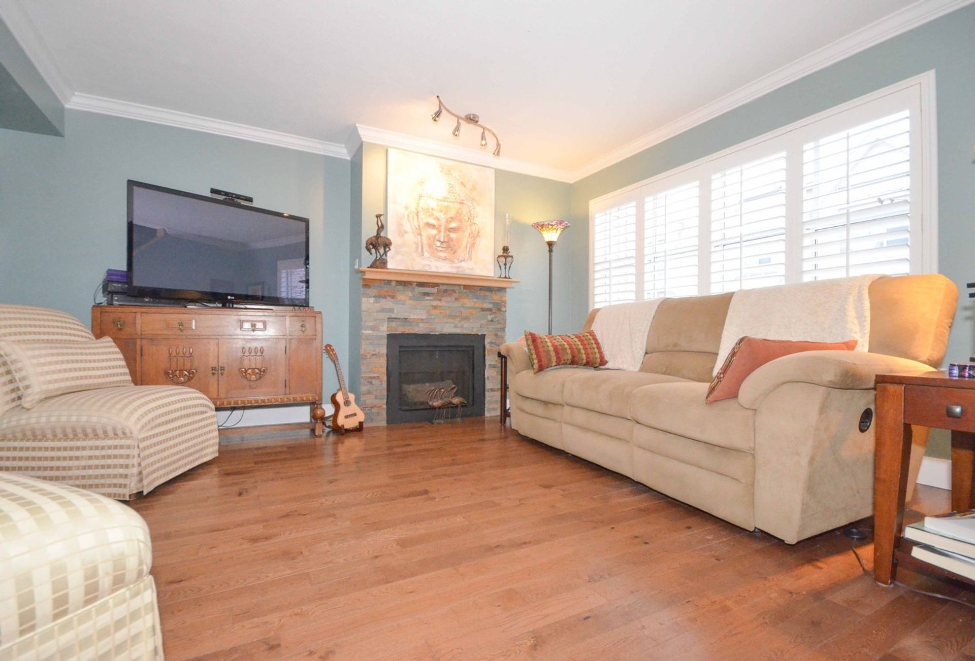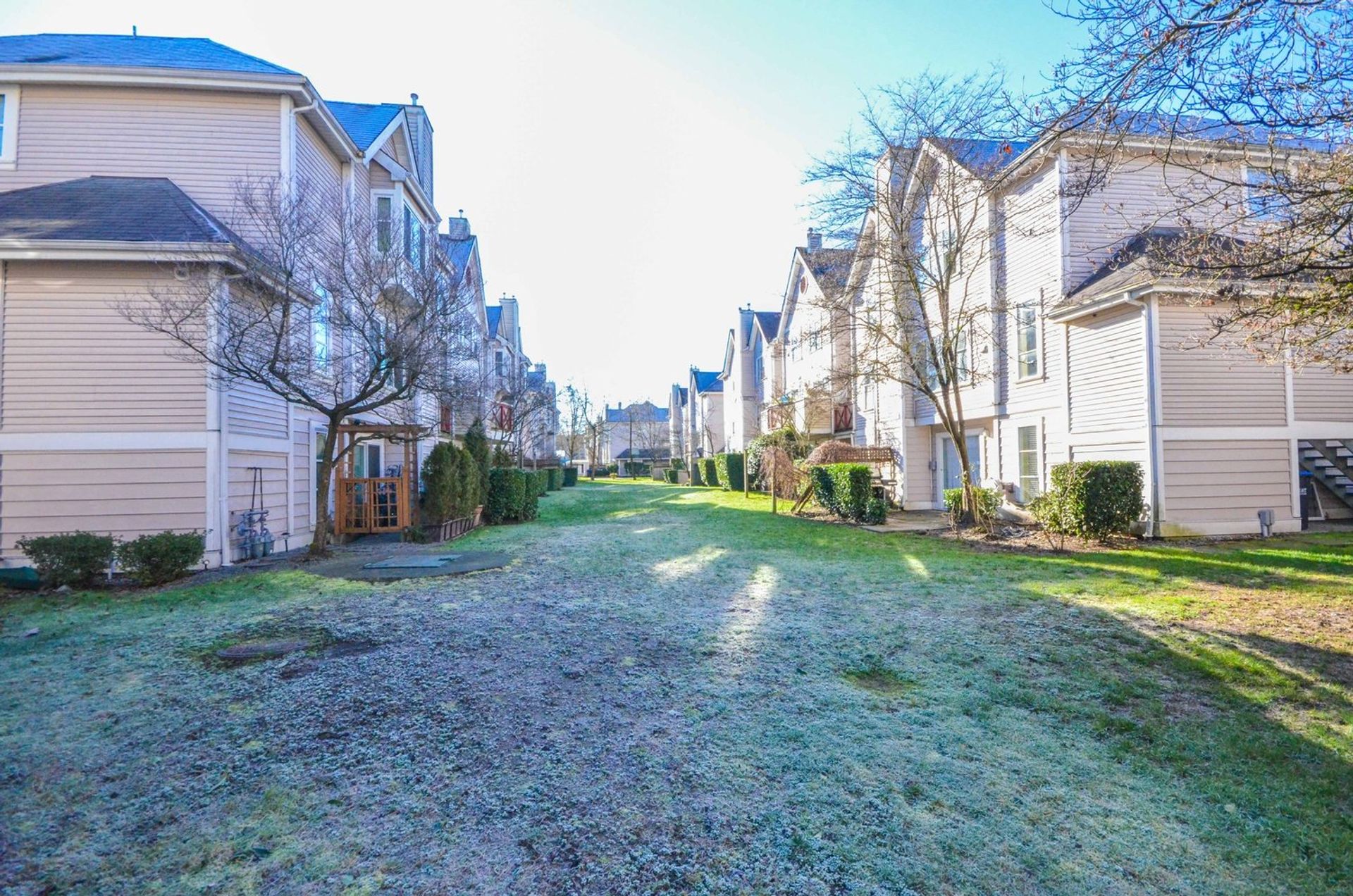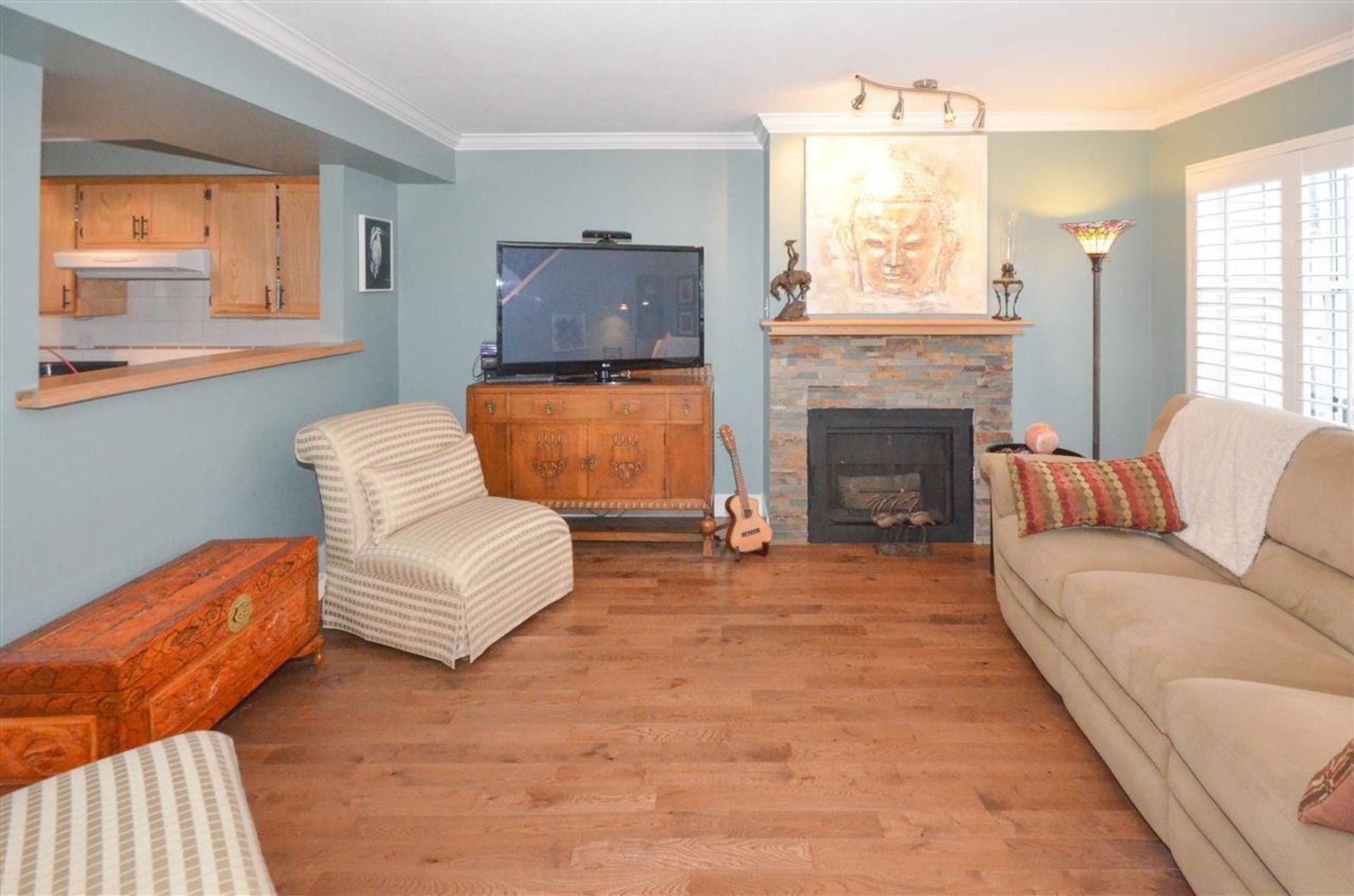Hardwood stairs (matching hardwood throughout dinning/living rooms, and all bedrooms) lead to the homes main level which features a large living room including a gas fire place with a slate hearth and a solid wood mantle. The living room also contains a large window with a view of the complex's green space, and an oversized pass through to the kitchen. An abundance of solid wood cabinets line the kitchen providing for extra storage space; the room also includes subway tiling, a double sink, a tile backsplash, stacked washer and dryer, and multiple large windows spanning the length of a dedicated eating area. Rounding out the main floor is the homes dining room which includes a sliding glass door on to a covered deck which affords enough space for a full BBQ set up.