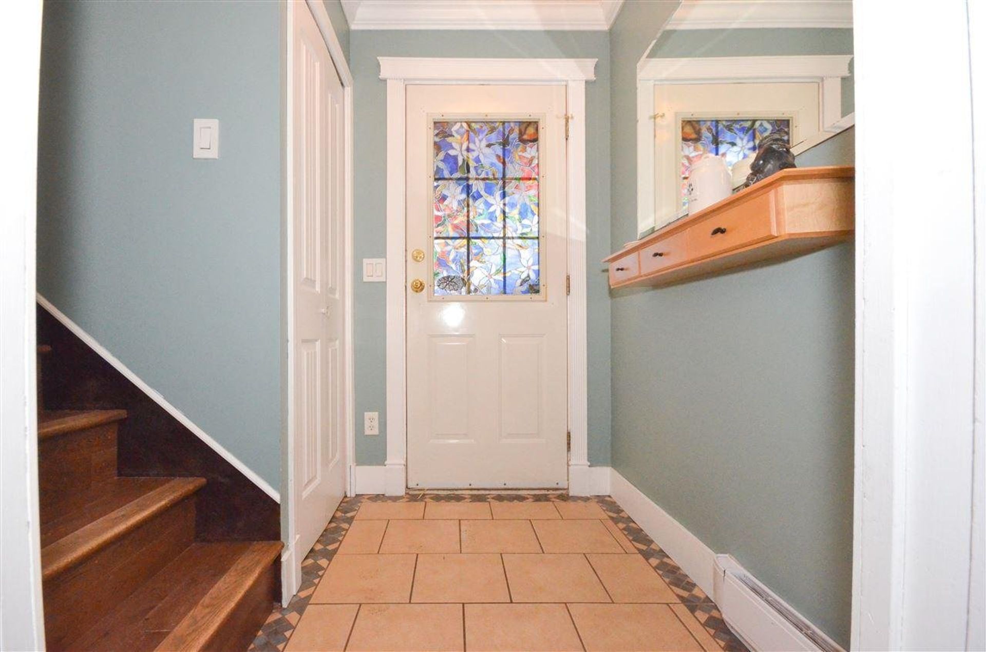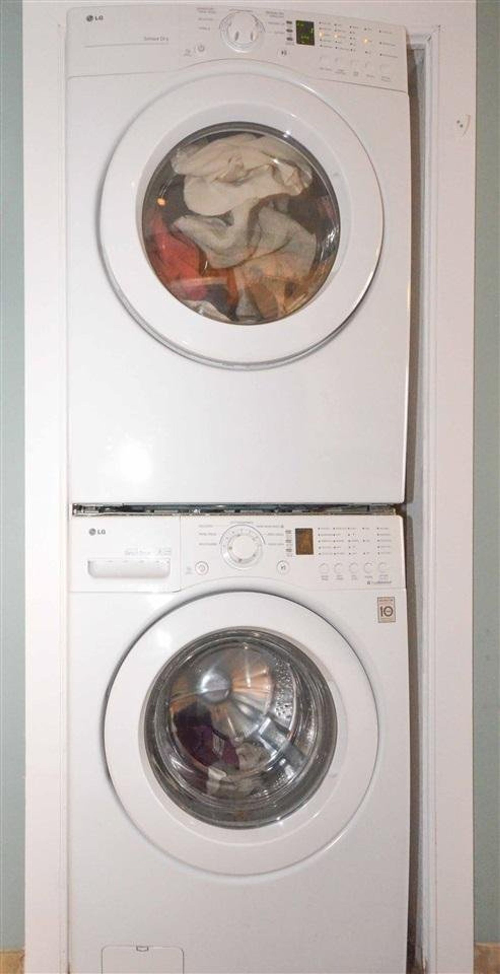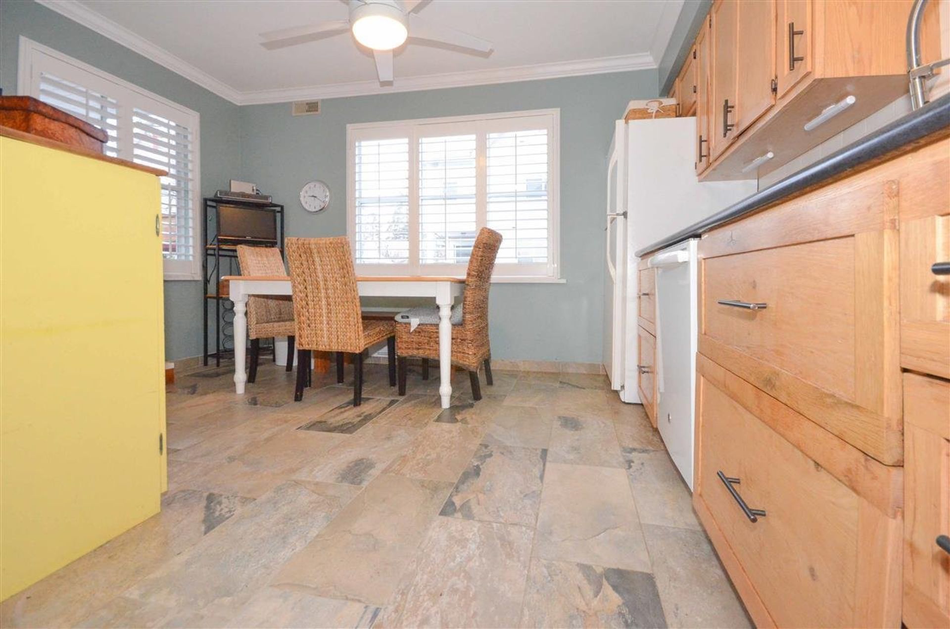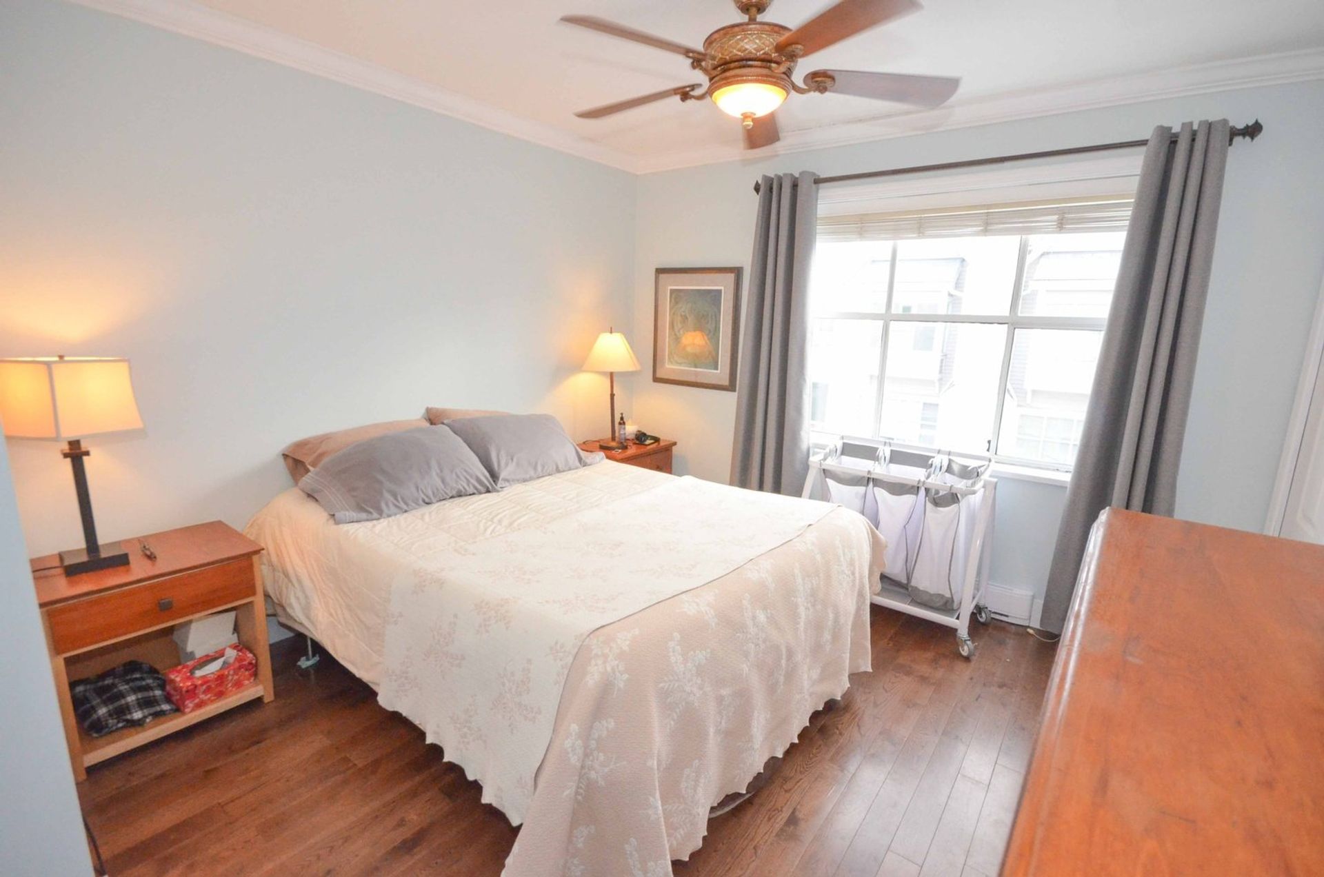 Hardwood stairs (matching hardwood throughout dinning/living rooms, and all bedrooms) lead to the homes main level which features a large living room including a gas fire place with a slate hearth and a solid wood mantle. The living room also contains a large window with a view of the complex's green space, and an oversized pass through to the kitchen. An abundance of solid wood cabinets line the kitchen providing for extra storage space; the room also includes subway tiling, a double sink, a tile backsplash, stacked washer and dryer, and multiple large windows spanning the length of a dedicated eating area. Rounding out the main floor is the homes dining room which includes a sliding glass door on to a covered deck which affords enough space for a full BBQ set up.