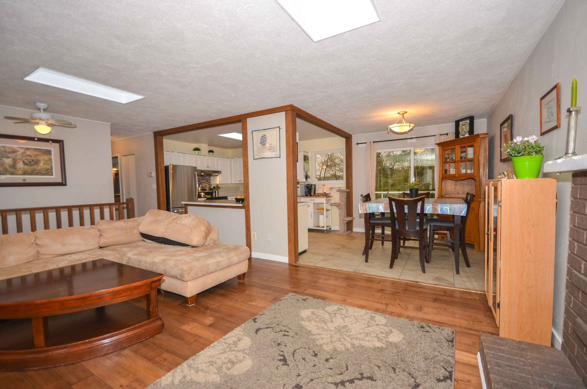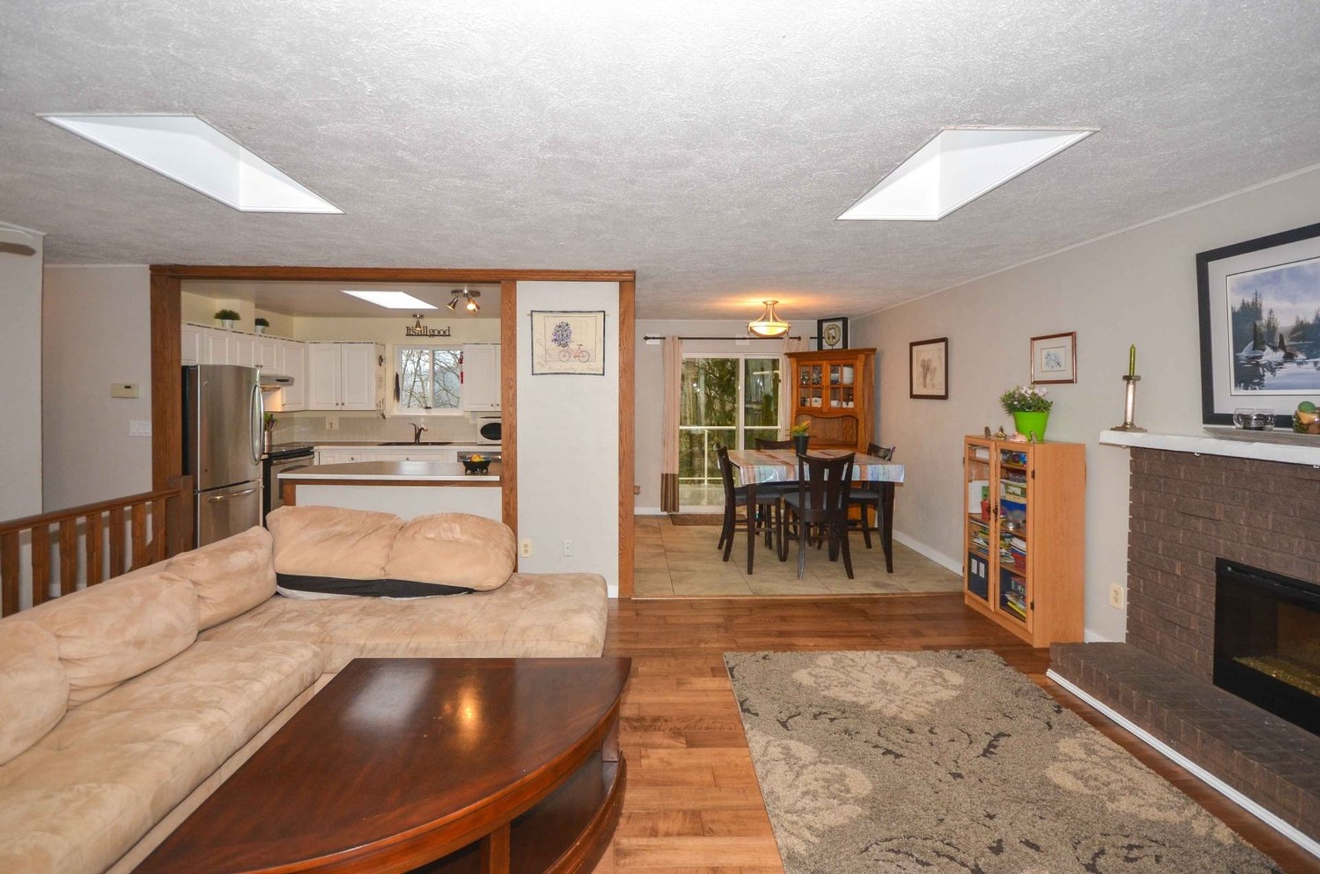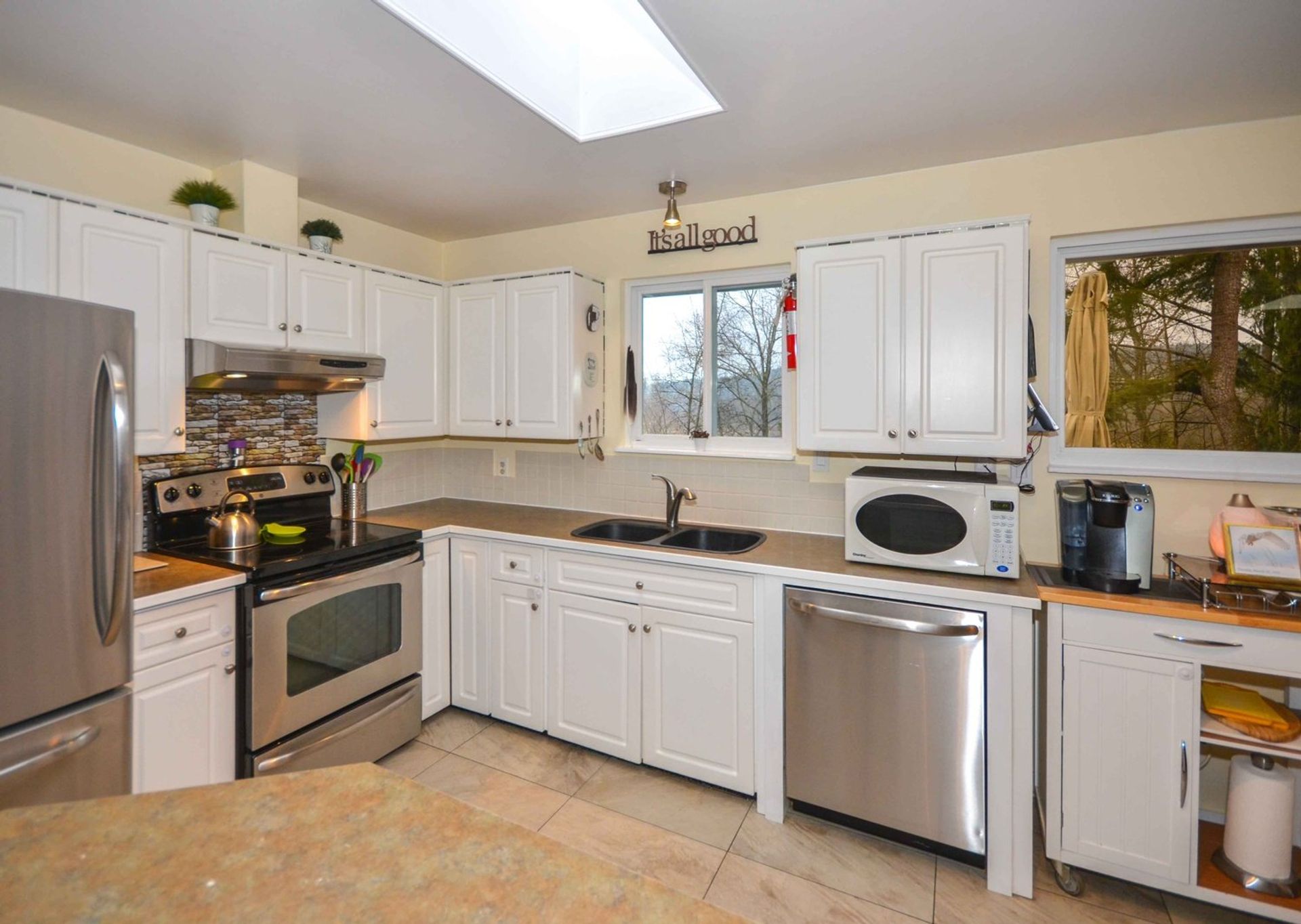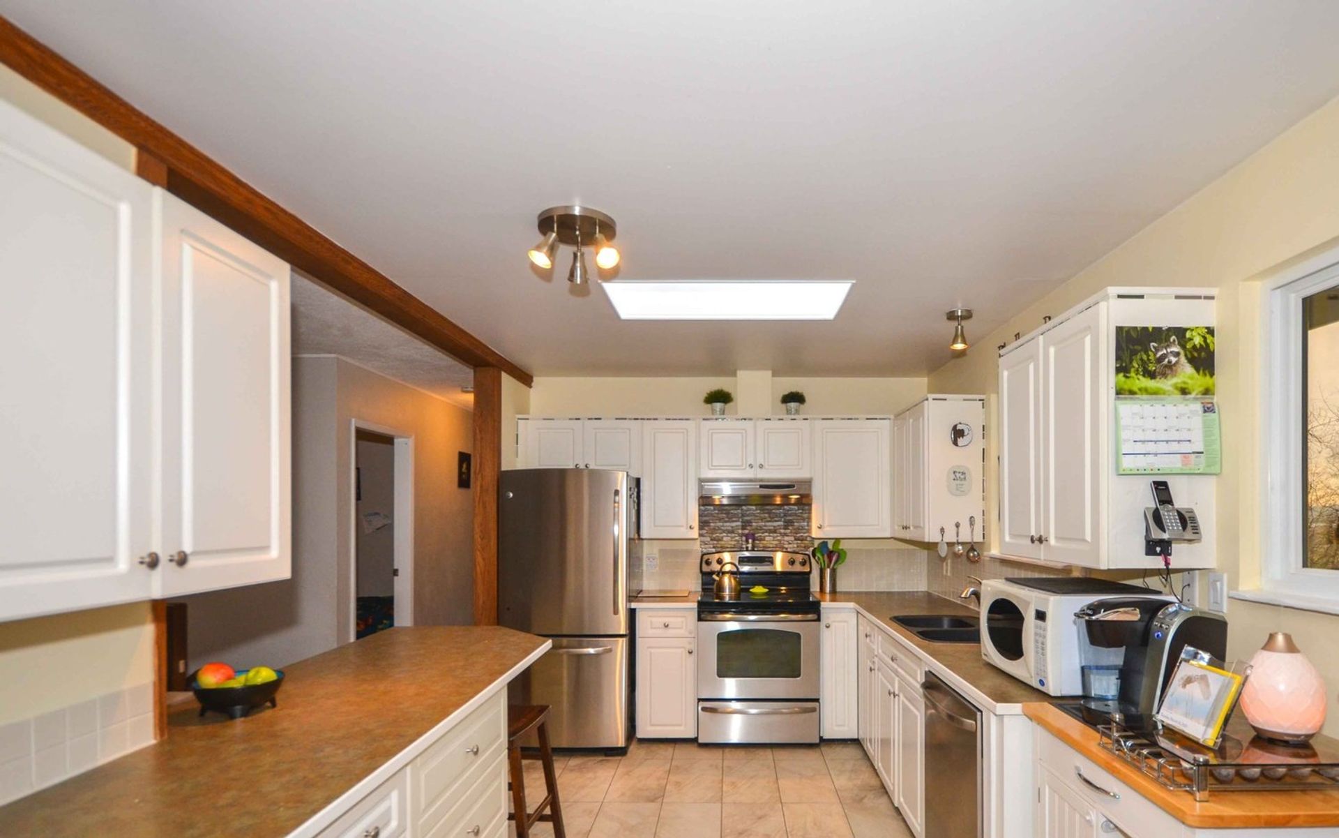 An open concept kitchen includes an island with built in storage, all stainless steel appliance, abundant storage space, modern subway tiling, and a double sink with a lovely mountain view. The dining room is situated off of the kitchen and features a glass sliding door on to the home's deck, with access to the back yard. With large bay windows and two skylights (there is also one in the kitchen) the home's living room is flush with natural light; it also includes a gas fireplace. The master bedroom is tucked away with a three piece ensuite. Two remaining bedrooms and a four piece main bathroom complete the upper floor; all three bedrooms offer a mountain or greenbelt view.