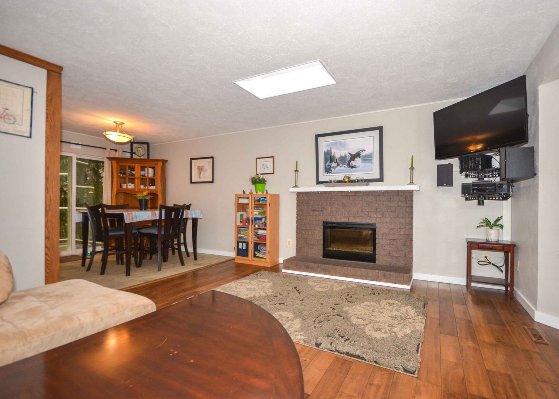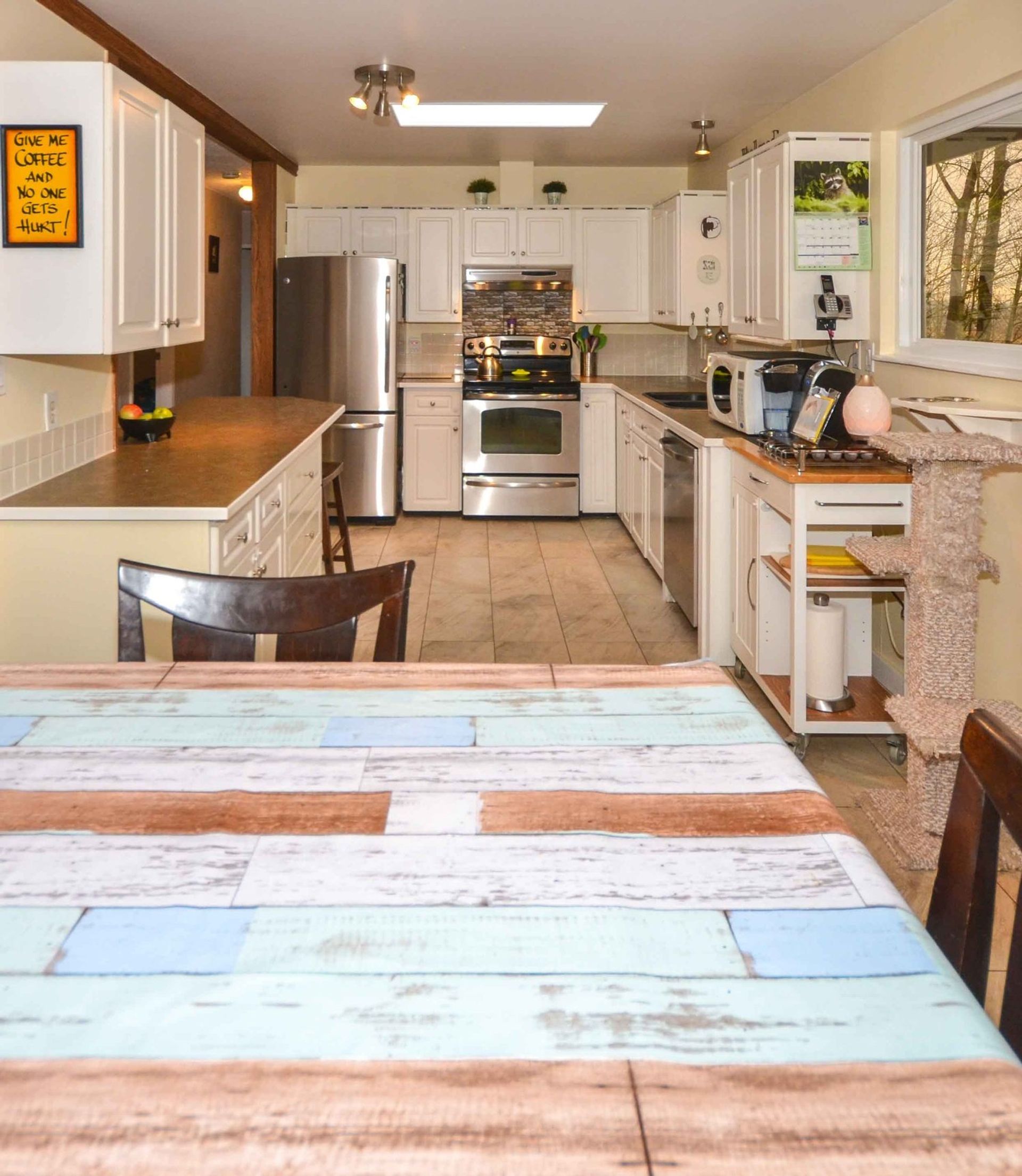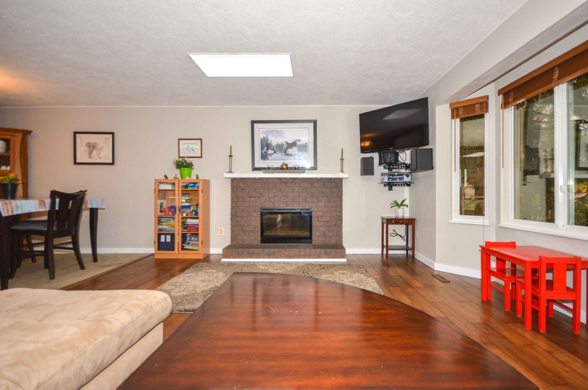 An open concept kitchen includes an island with built in storage, all stainless steel appliance, abundant storage space, modern subway tiling, and a double sink with a lovely mountain view. The dining room is situated off of the kitchen and features a glass sliding door on to the home's deck, with access to the back yard. With large bay windows and two skylights (there is also one in the kitchen) the home's living room is flush with natural light; it also includes a gas fireplace. The master bedroom is tucked away with a three piece ensuite. Two remaining bedrooms and a four piece main bathroom complete the upper floor; all three bedrooms offer a mountain or greenbelt view.