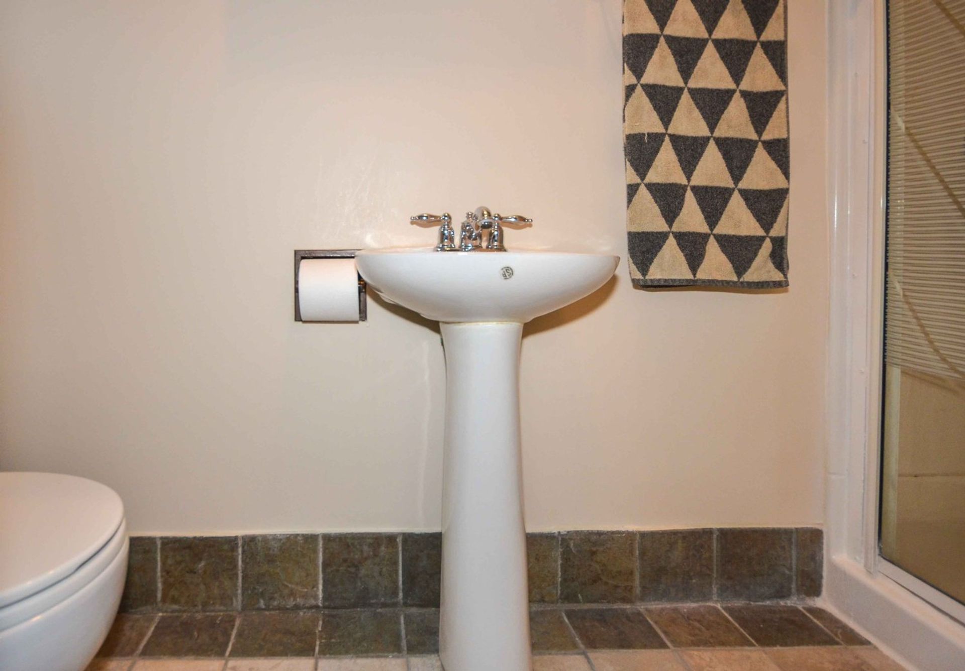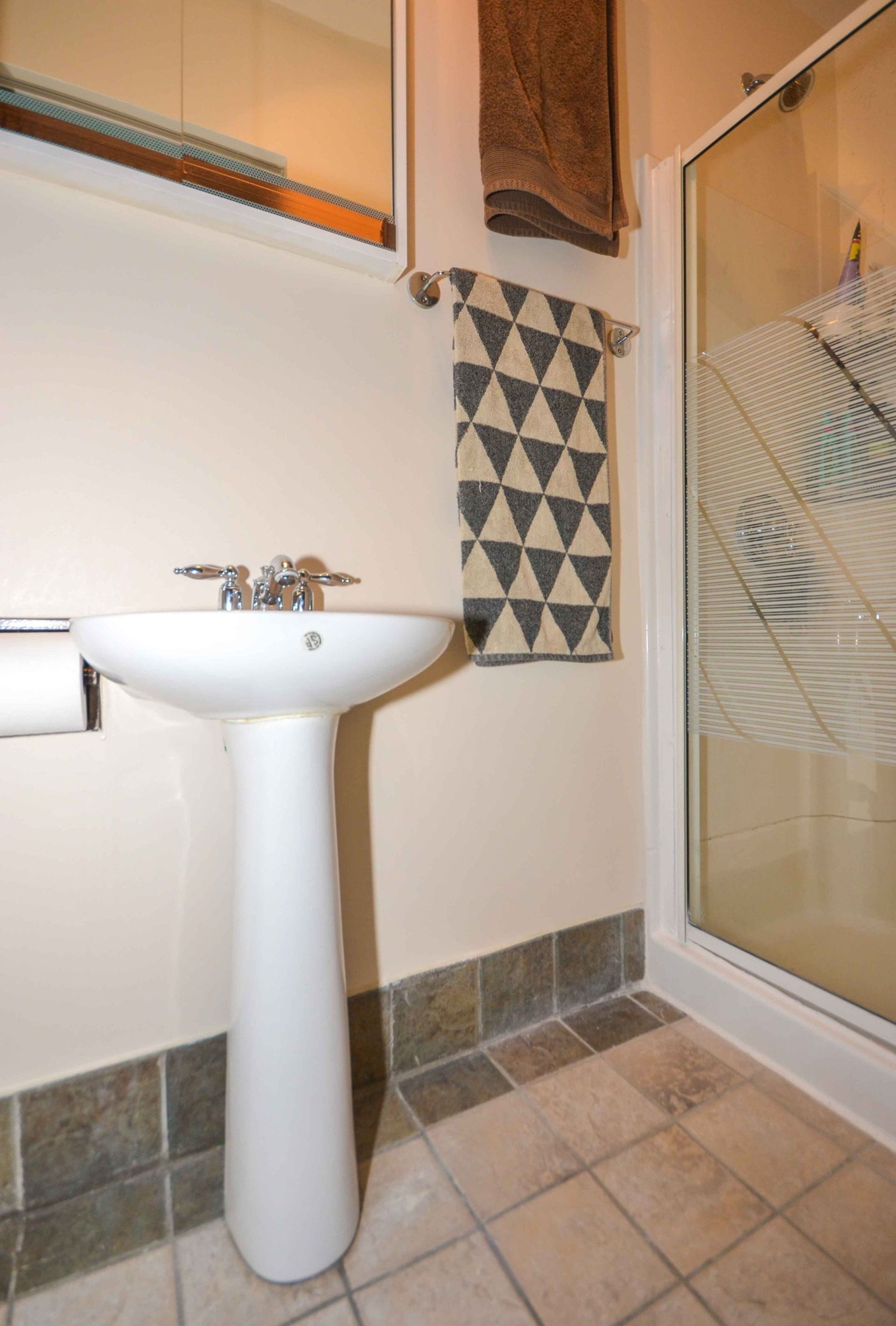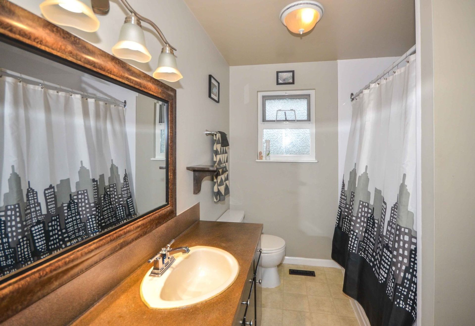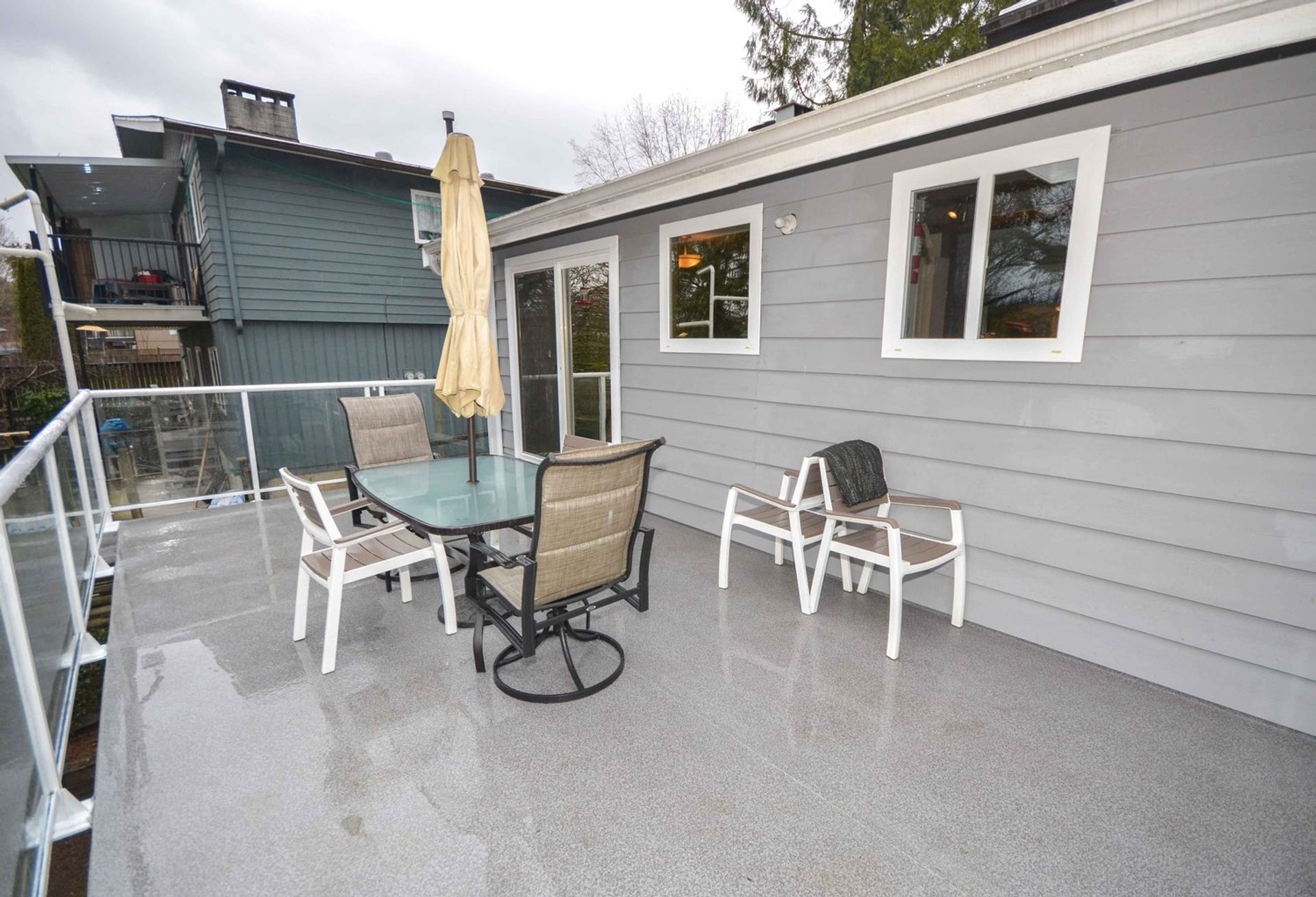An open concept kitchen includes an island with built in storage, all stainless steel appliance, abundant storage space, modern subway tiling, and a double sink with a lovely mountain view. The dining room is situated off of the kitchen and features a glass sliding door on to the home's deck, with access to the back yard. With large bay windows and two skylights (there is also one in the kitchen) the home's living room is flush with natural light; it also includes a gas fireplace. The master bedroom is tucked away with a three piece ensuite. Two remaining bedrooms and a four piece main bathroom complete the upper floor; all three bedrooms offer a mountain or greenbelt view.