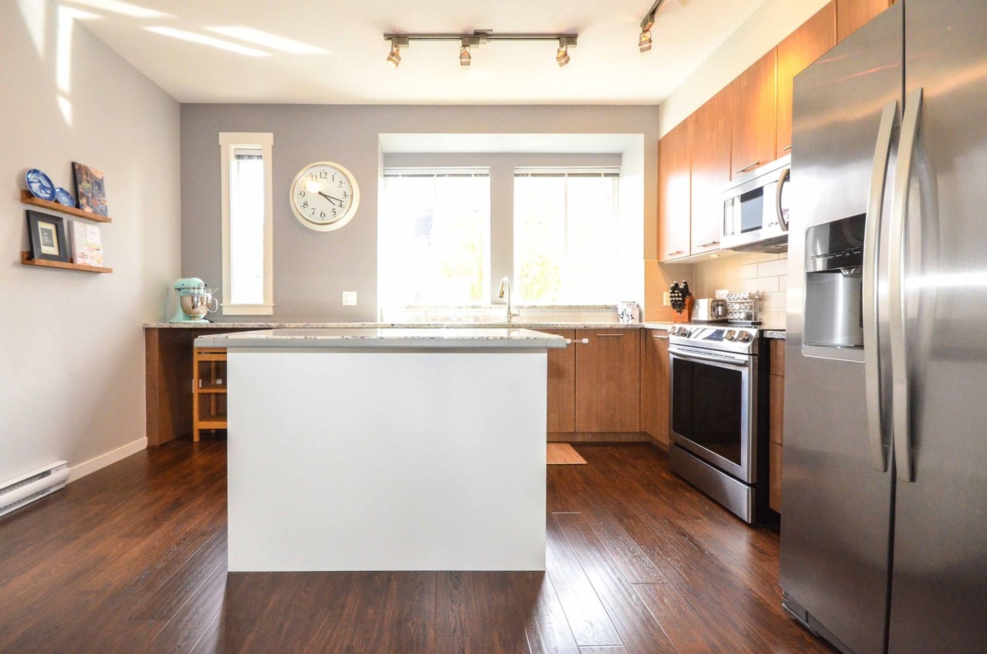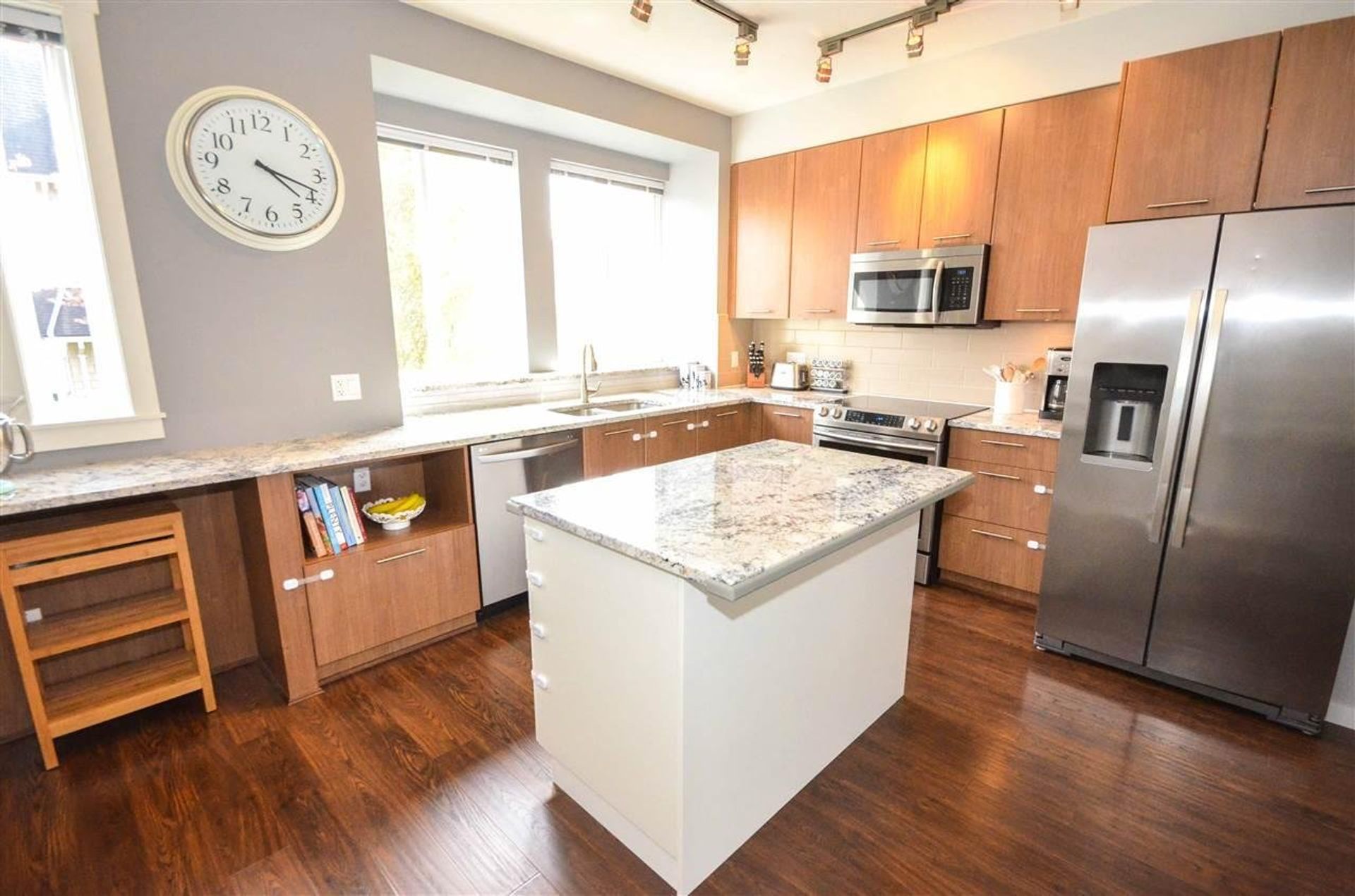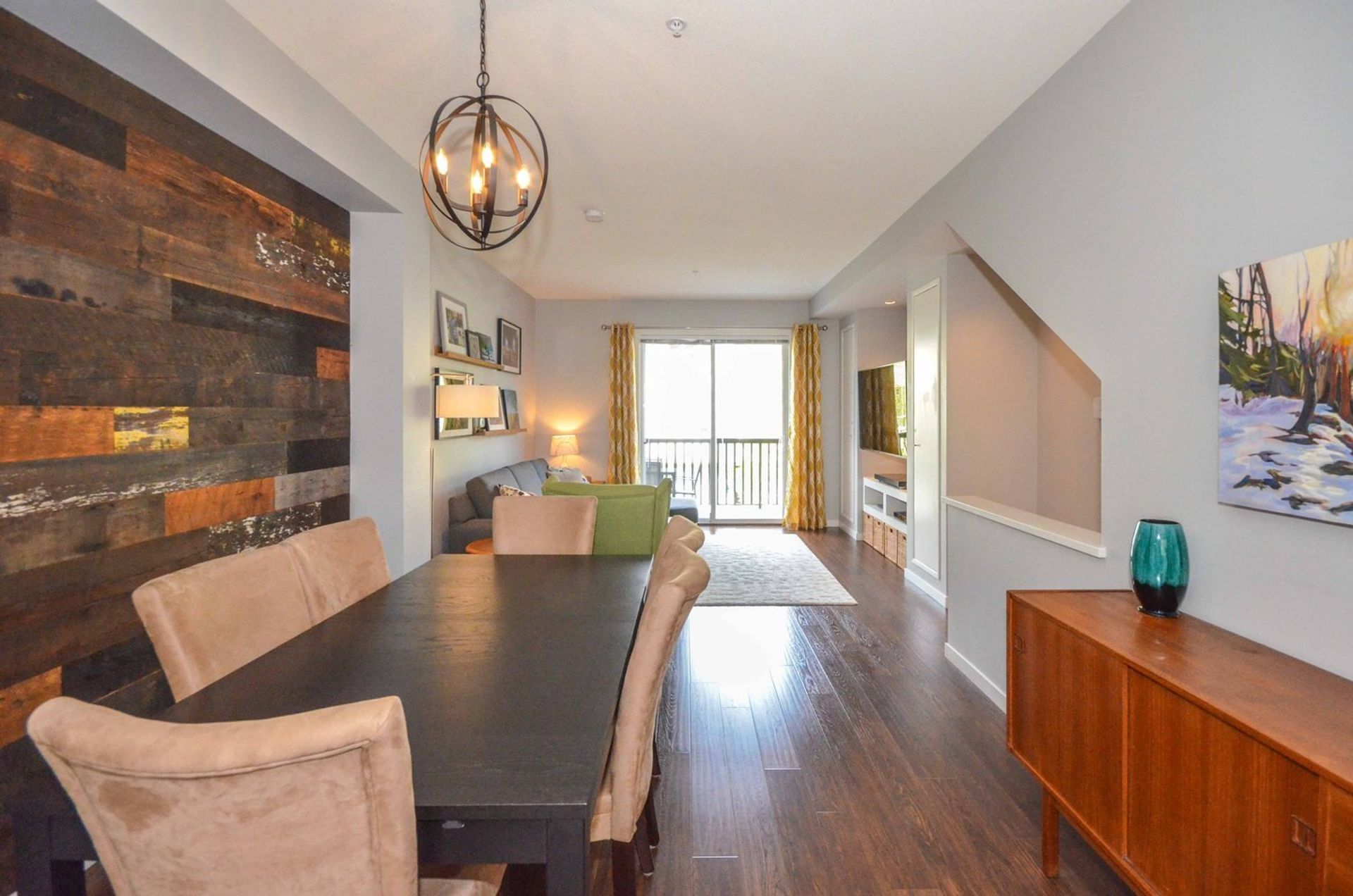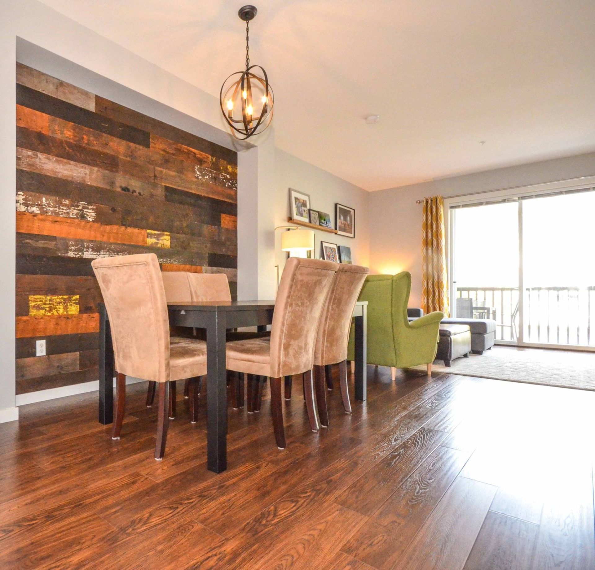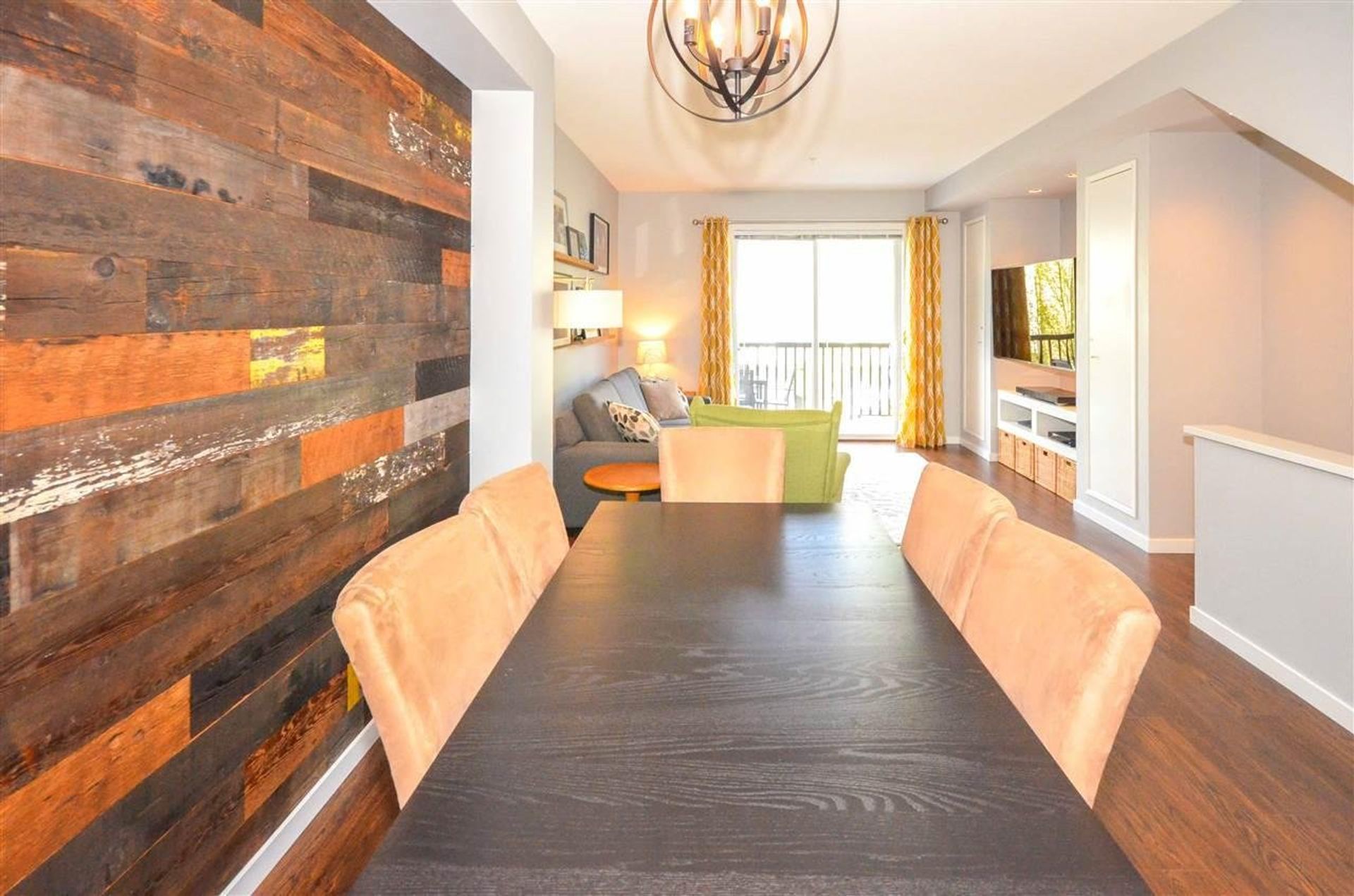 The main level features an open concept living/dining room, and kitchen with all new laminate flooring. Updates to the kitchen include granite counters, a large island with built in storage and an eating bar, a deep double undermount sink with a view of the complex's green space, and a tile backsplash. Completing the gourmet kitchen; all stainless-steel appliances including a five-burner stove, a side-by-side fridge/freezer, a built-in microwave, inlaid accent pot lighting, and abundant cabinet/counter space. A formal dining room area includes an inlaid nook with a reclaimed wood accent wall creating a contemporary atmosphere for hosting. The living room offers an expansive area perfect for housing a large entertainment centre with extra room for storage and two large deep cabinets that blend perfectly with the wall unit. A sliding glass door leads to the home’s deck. With no other deck directly facing yours, privacy is increased and there is room for a full patio and BBQ set up. It is the perfect place to unwind during those long Spring/Summer nights.