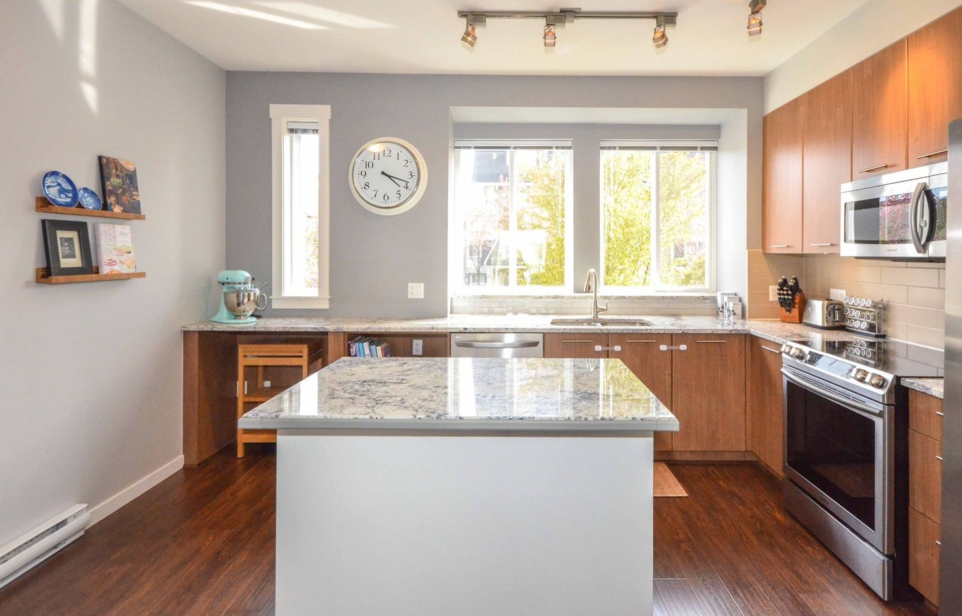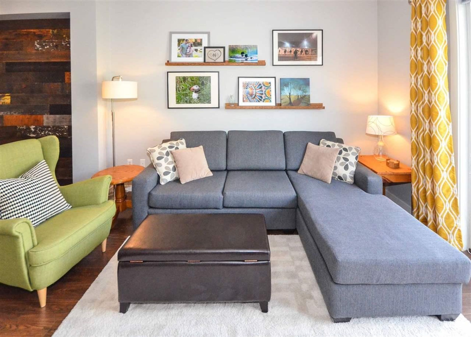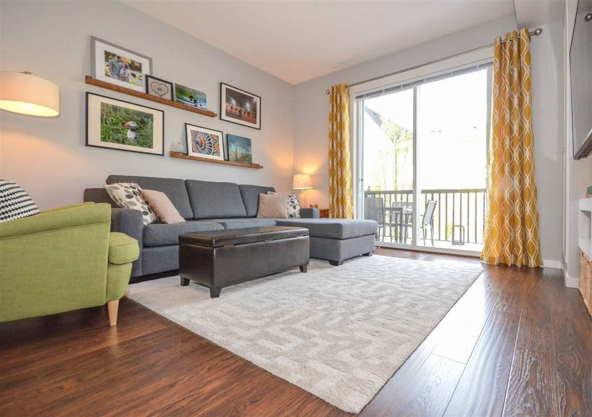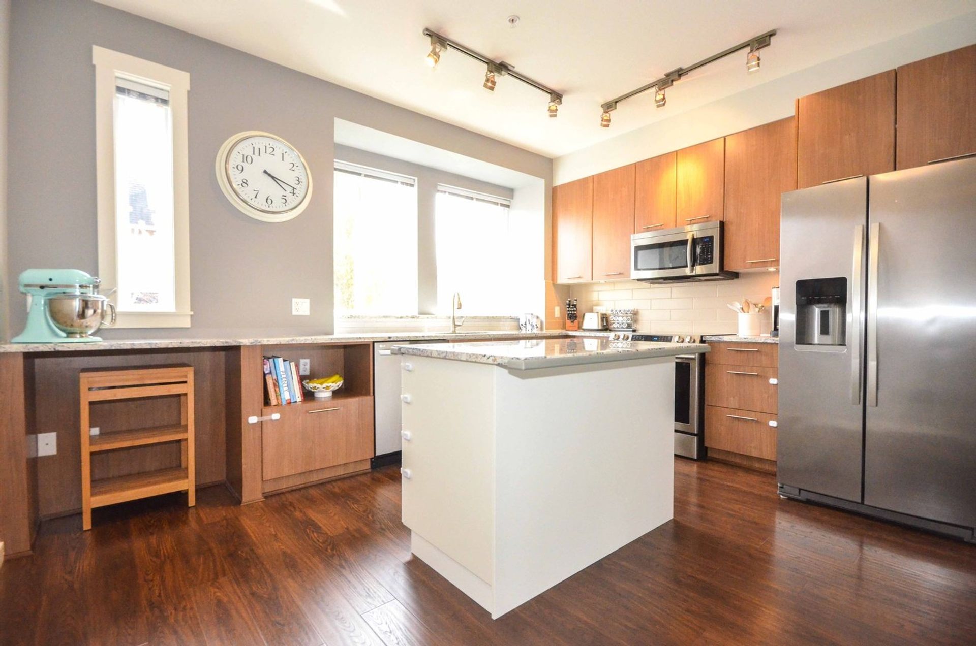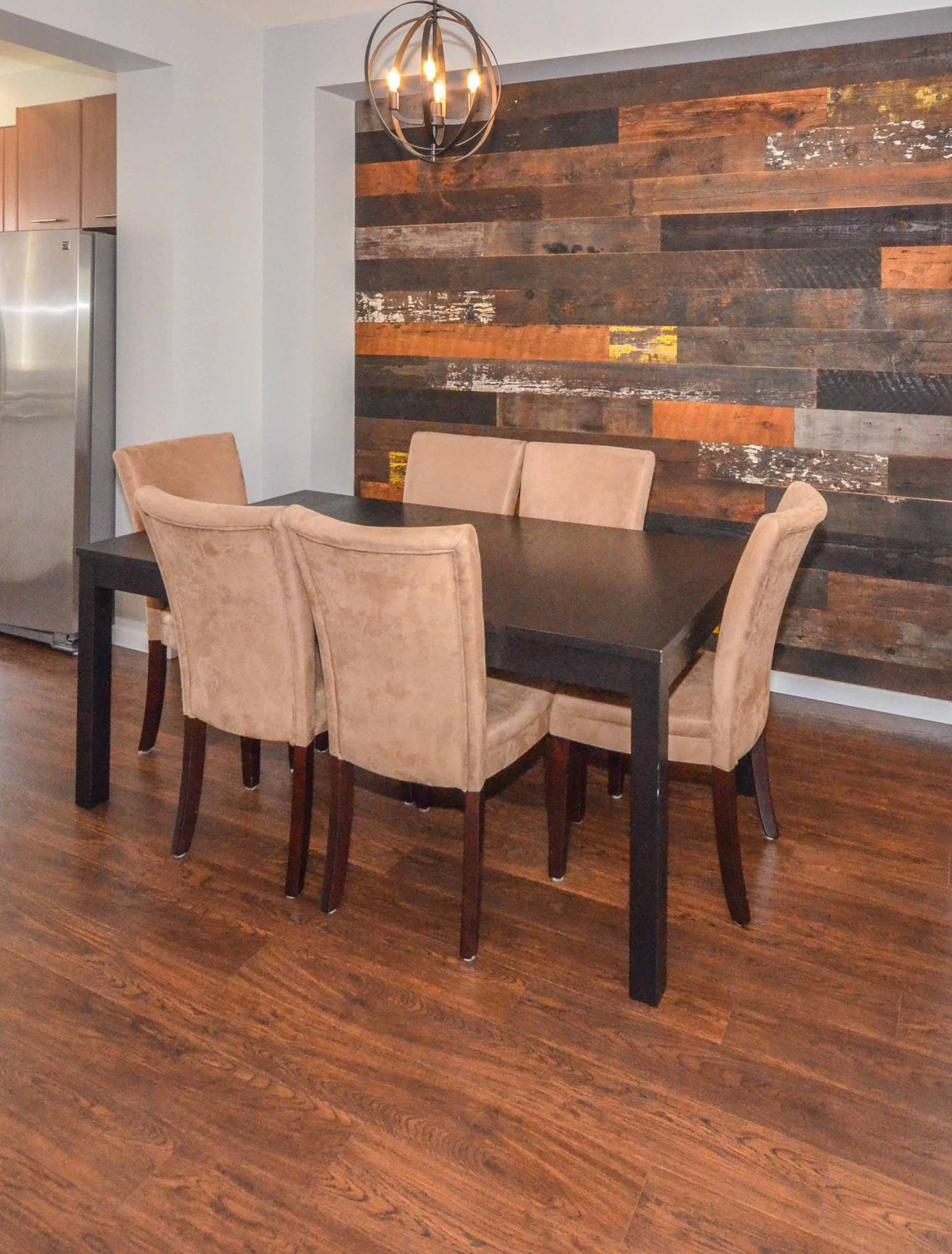 The main level features an open concept living/dining room, and kitchen with all new laminate flooring. Updates to the kitchen include granite counters, a large island with built in storage and an eating bar, a deep double undermount sink with a view of the complex's green space, and a tile backsplash. Completing the gourmet kitchen; all stainless-steel appliances including a five-burner stove, a side-by-side fridge/freezer, a built-in microwave, inlaid accent pot lighting, and abundant cabinet/counter space. A formal dining room area includes an inlaid nook with a reclaimed wood accent wall creating a contemporary atmosphere for hosting. The living room offers an expansive area perfect for housing a large entertainment centre with extra room for storage and two large deep cabinets that blend perfectly with the wall unit. A sliding glass door leads to the home’s deck. With no other deck directly facing yours, privacy is increased and there is room for a full patio and BBQ set up. It is the perfect place to unwind during those long Spring/Summer nights.