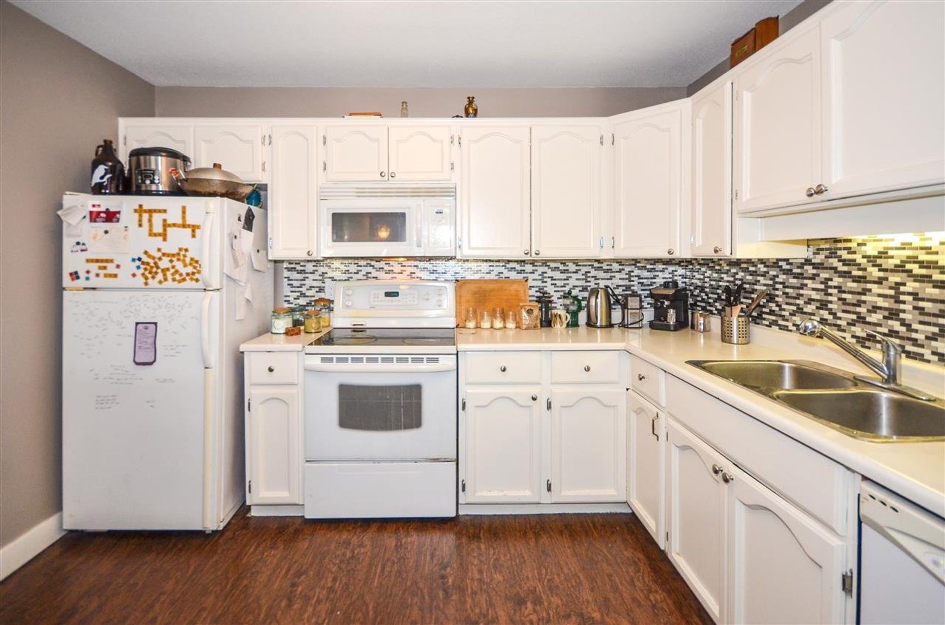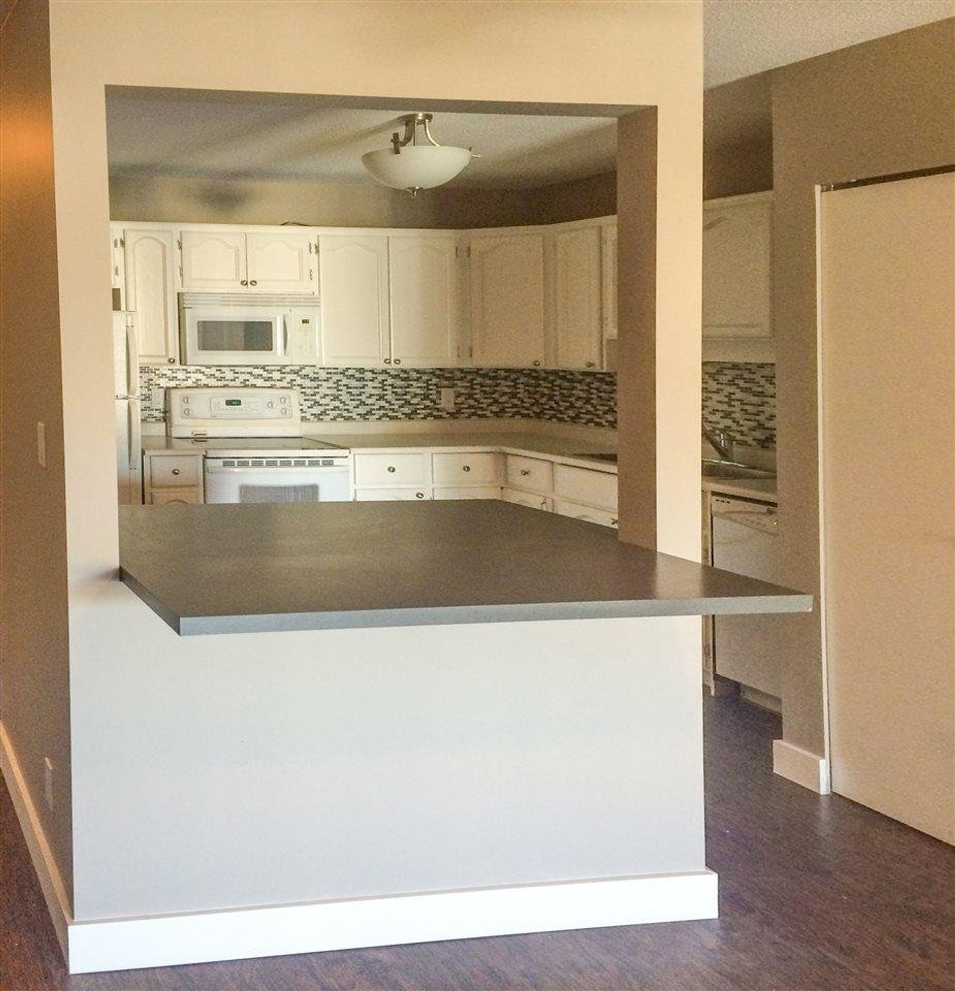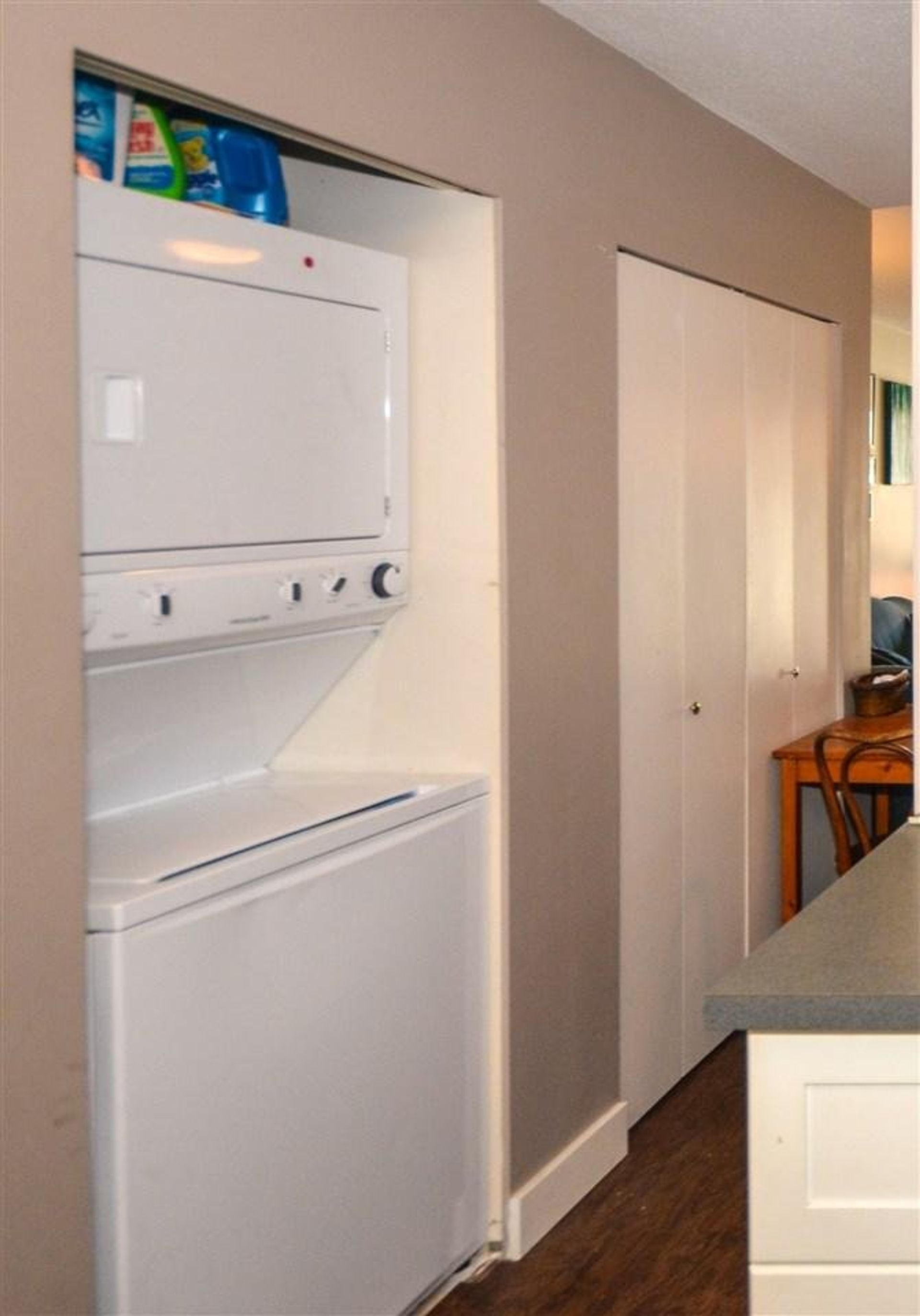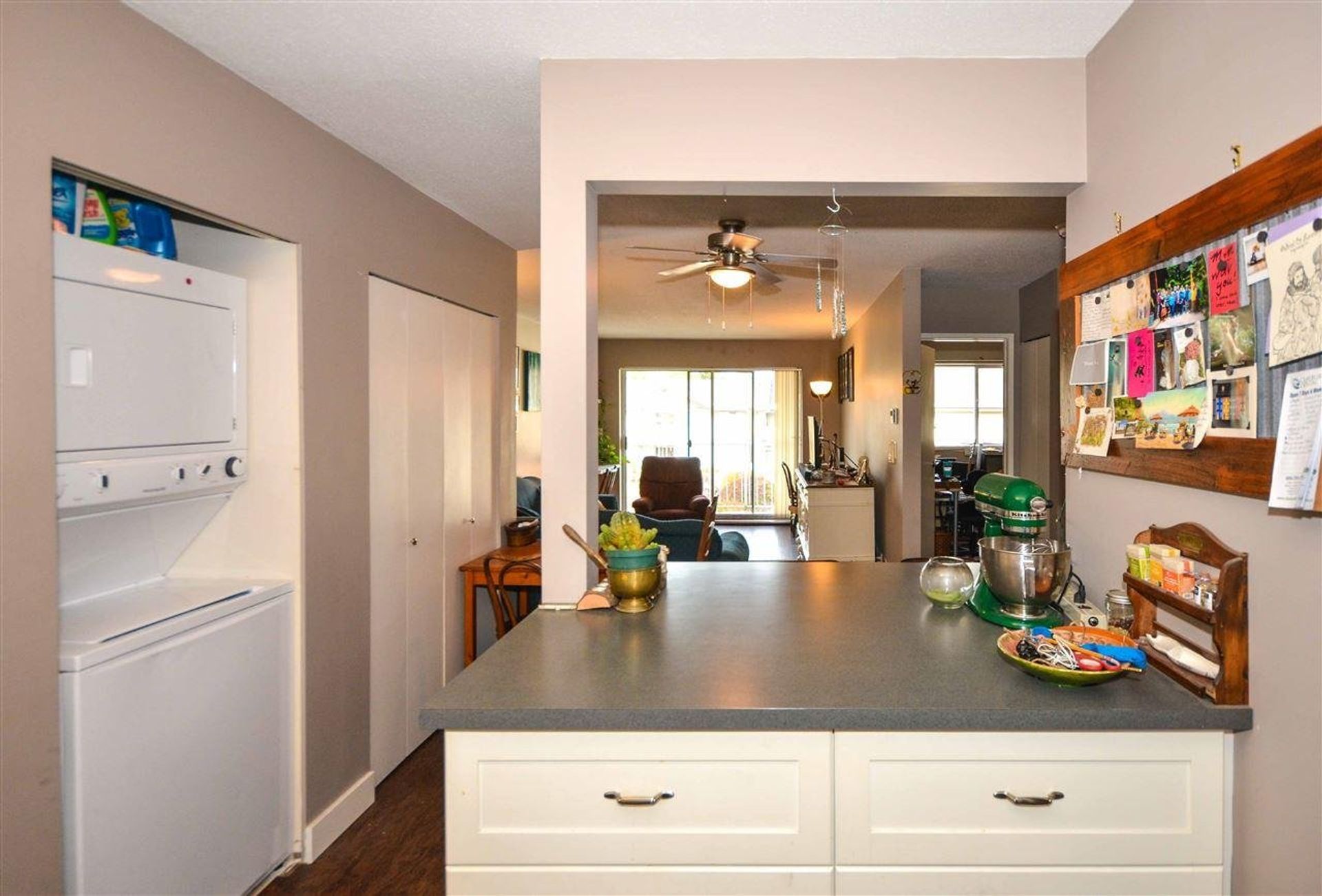 Great property for investors! This 2 bdrm top floor end unit features a large ktchn w/lots of counter & cabinet space, a tile back splash, & a dishwasher. A large island w/cabinets on one side & an eating-bar on the other acts as the dinrm division; closeted brand new in suite laundry & a large closet perfect storage, lines the dinrm area. Sliding glass doors led from the lvgrm to deck spanning the length of the home, perfect for a container garden and sitting area. Master bdrm features an oversized walk in closet & large window perfect for nature light. Dark updated vinyl plank flooring running through the entire unit endows this home w/a warm rooted feel. Four piece bthrm adjacent to 2 front hall closets. Separate storage downstairs, lots of parking options. Great central locaction.