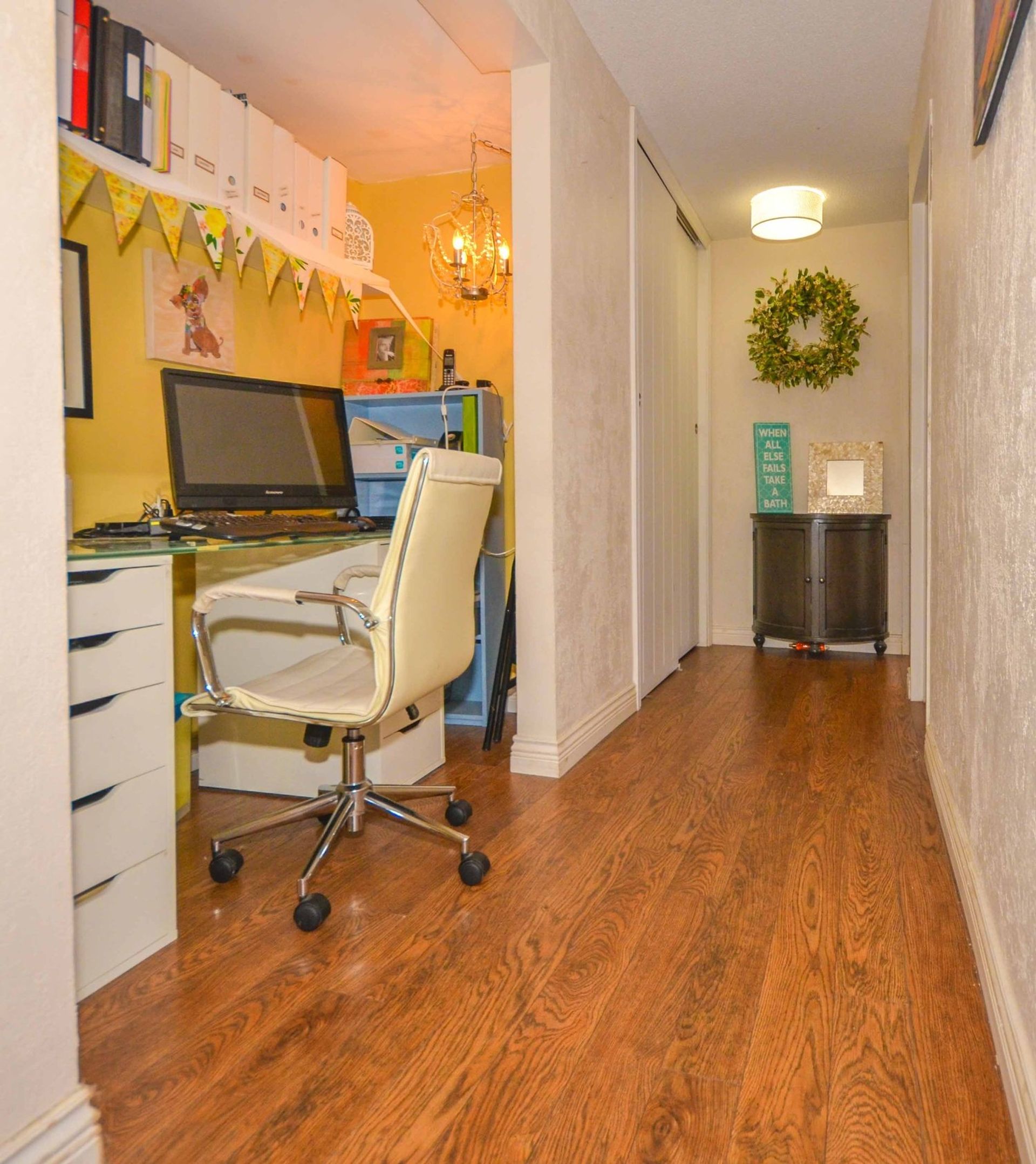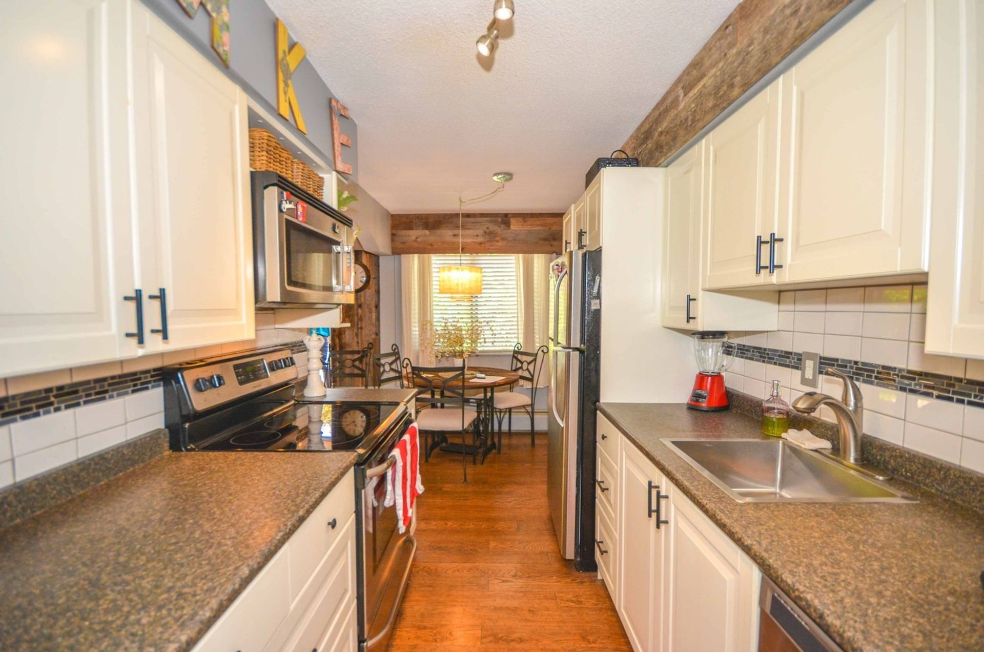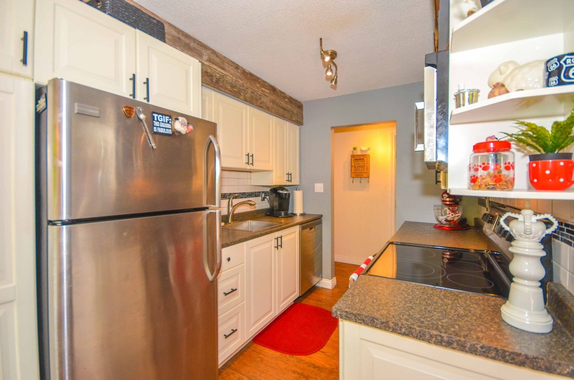 The homes kitchen features all stainless steel appliances, including a built in microwave, soft close cabinetry, a custom pantry cupboard with adjacent display cabinets, and a tile backsplash; there is also an extra deep closet in the foyer which can be used as additional pantry/storage space. An eating area with a reclaimed wood accent wall allows enough room for a kitchen table alongside a window looking out to the homes oversized outdoor area. The main entrance to the home’s deck is through glass sliding doors from the living room; the partially covered deck is very private with more than enough room for a full patio set up, and your personal gardening touches. An electric fireplace, laminate flooring (present throughout the home), and a display alcove completes the homey living room. Both bedrooms are spacious, and the master bedroom includes a stylized black and grey wood accent wall, while the second bedroom features a large window on to the complexes courtyard. There is also a four piece washroom with a deep tiled soaker tub, and a extra large closet area in the hall is perfect for an at home workstation with room for a full office set up.