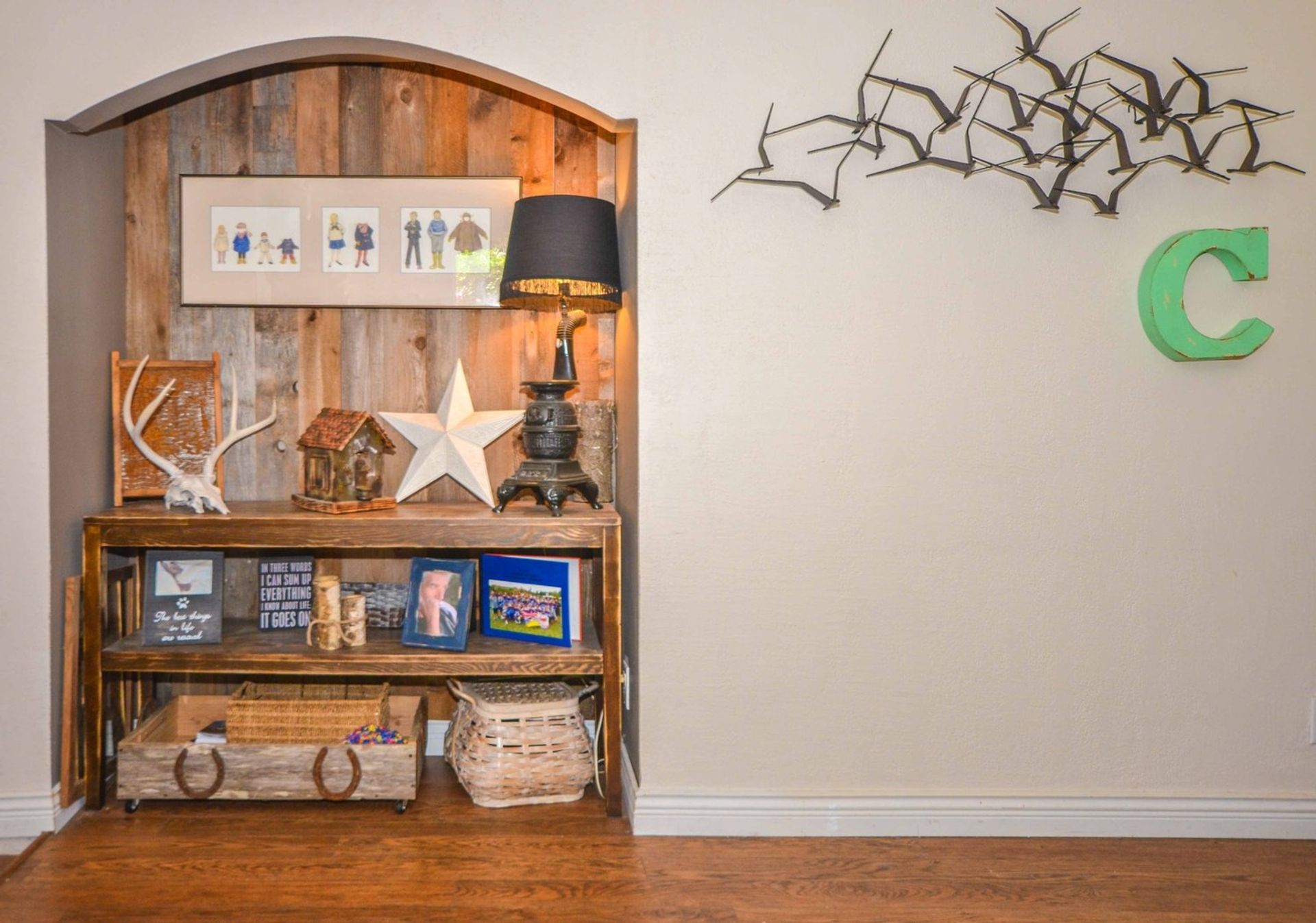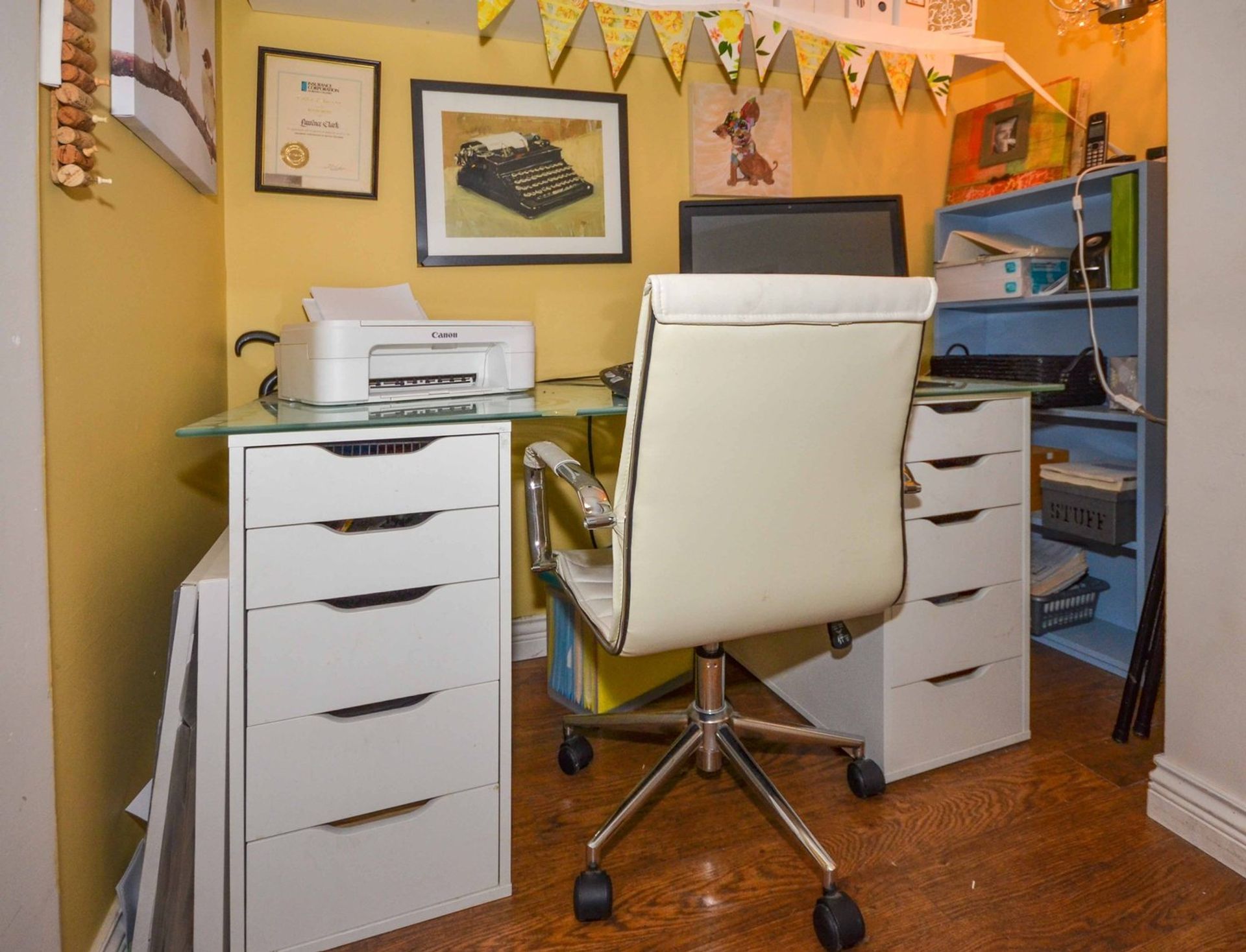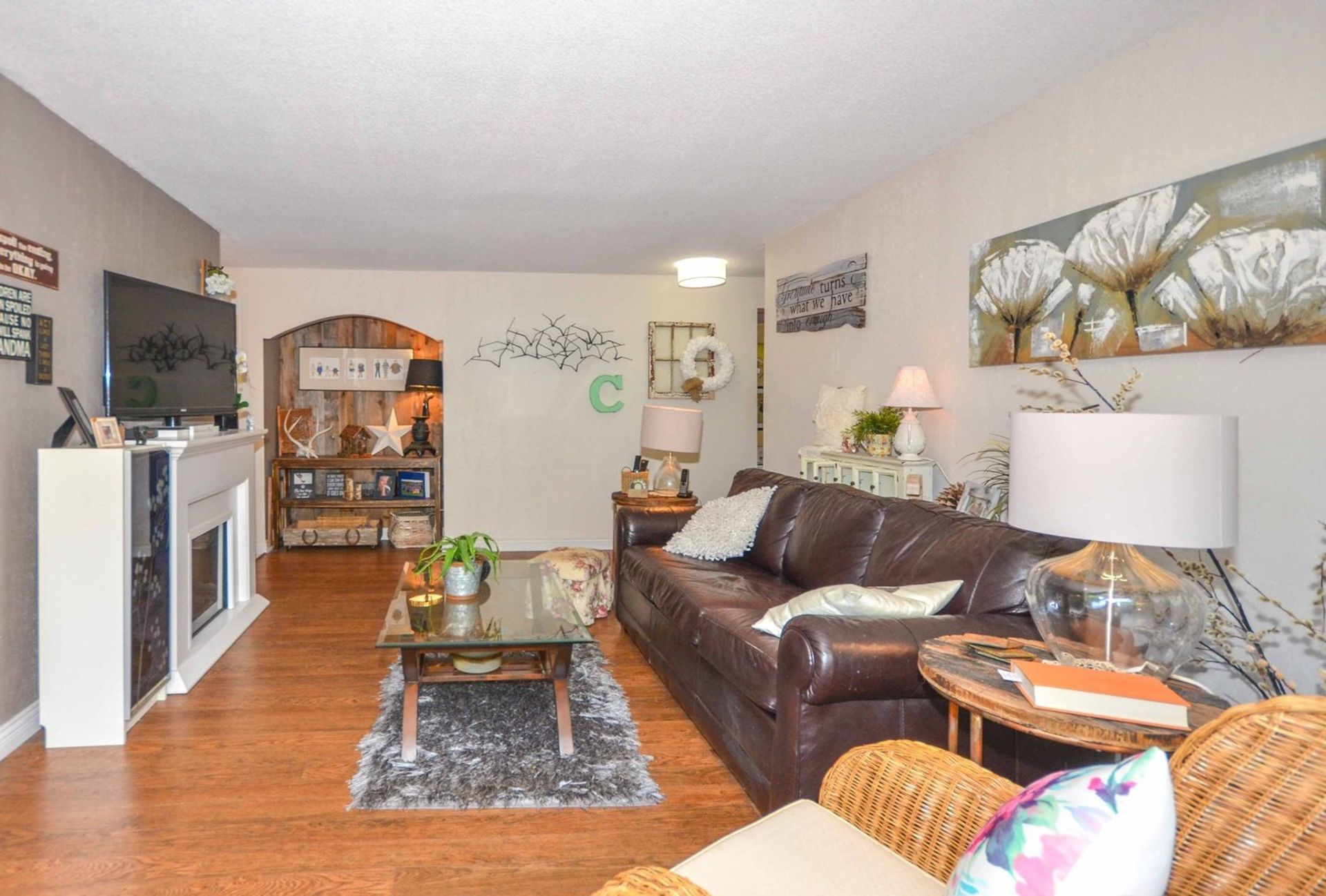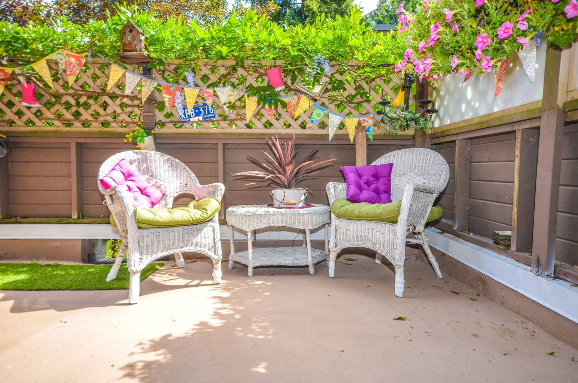 The homes kitchen features all stainless steel appliances, including a built in microwave, soft close cabinetry, a custom pantry cupboard with adjacent display cabinets, and a tile backsplash; there is also an extra deep closet in the foyer which can be used as additional pantry/storage space. An eating area with a reclaimed wood accent wall allows enough room for a kitchen table alongside a window looking out to the homes oversized outdoor area. The main entrance to the home’s deck is through glass sliding doors from the living room; the partially covered deck is very private with more than enough room for a full patio set up, and your personal gardening touches. An electric fireplace, laminate flooring (present throughout the home), and a display alcove completes the homey living room. Both bedrooms are spacious, and the master bedroom includes a stylized black and grey wood accent wall, while the second bedroom features a large window on to the complexes courtyard. There is also a four piece washroom with a deep tiled soaker tub, and a extra large closet area in the hall is perfect for an at home workstation with room for a full office set up.
