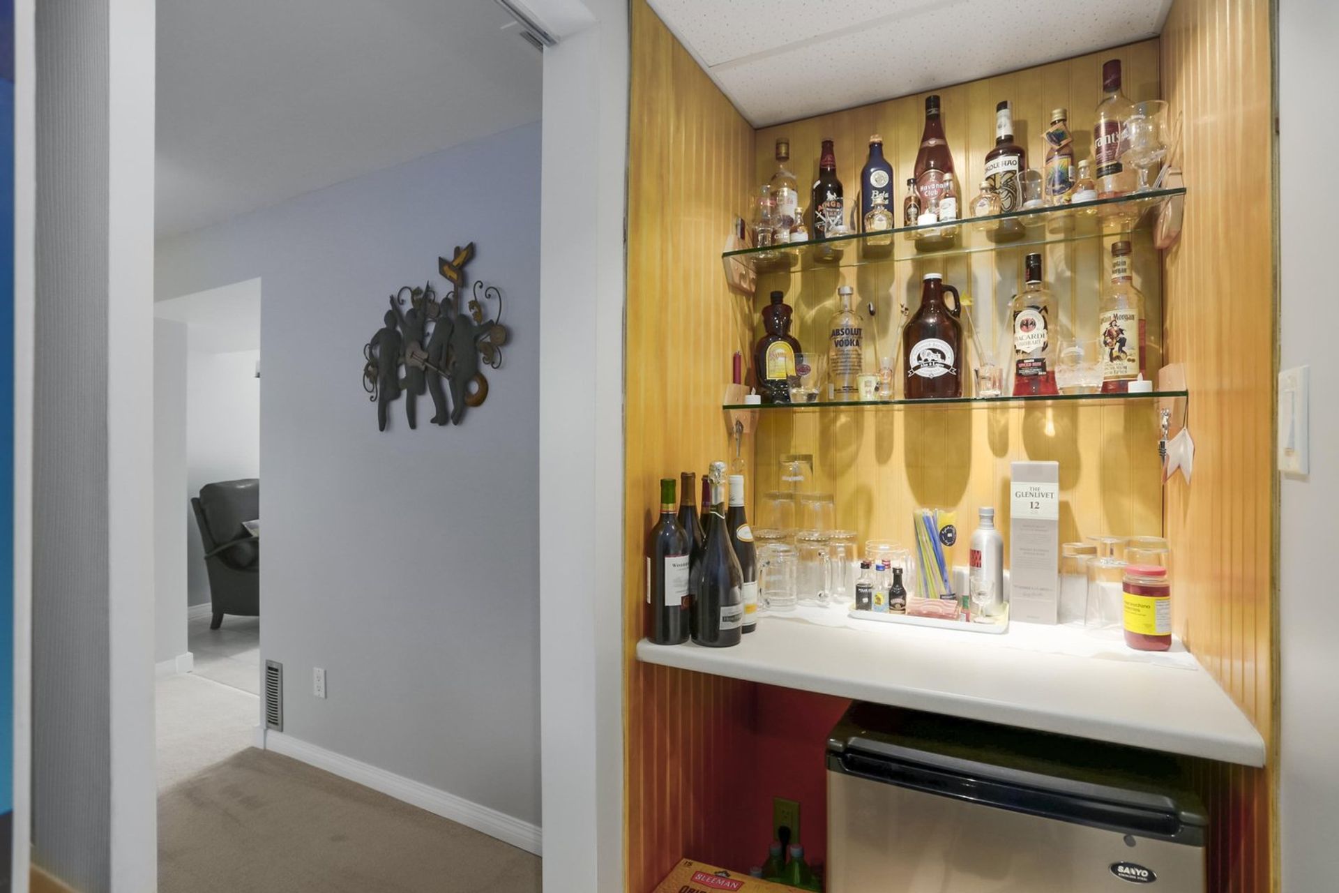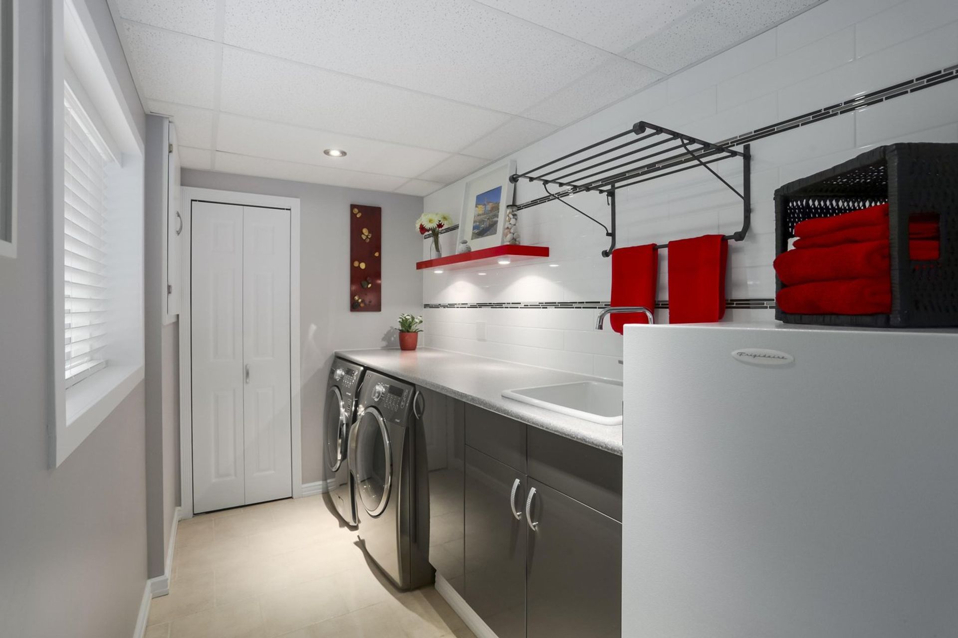 The lower level consists of a family room with a gas fireplace, wired 5.1 surround sound, and a small tucked away bar area which leads to a large under stair storage area. The family room opens on to a tiled reading room with glass french doors leading out to the home's expansive patio area; at over 648 square feet there is more than enough room for all of your outdoor BBQ and entertaining needs. The lower level is complete with an updated four piece washroom, featuring an impressive soaker tub and a stand alone shower, a laundry room which boasts a wash sink, a standing freezer, hanging racks, and great counter space.