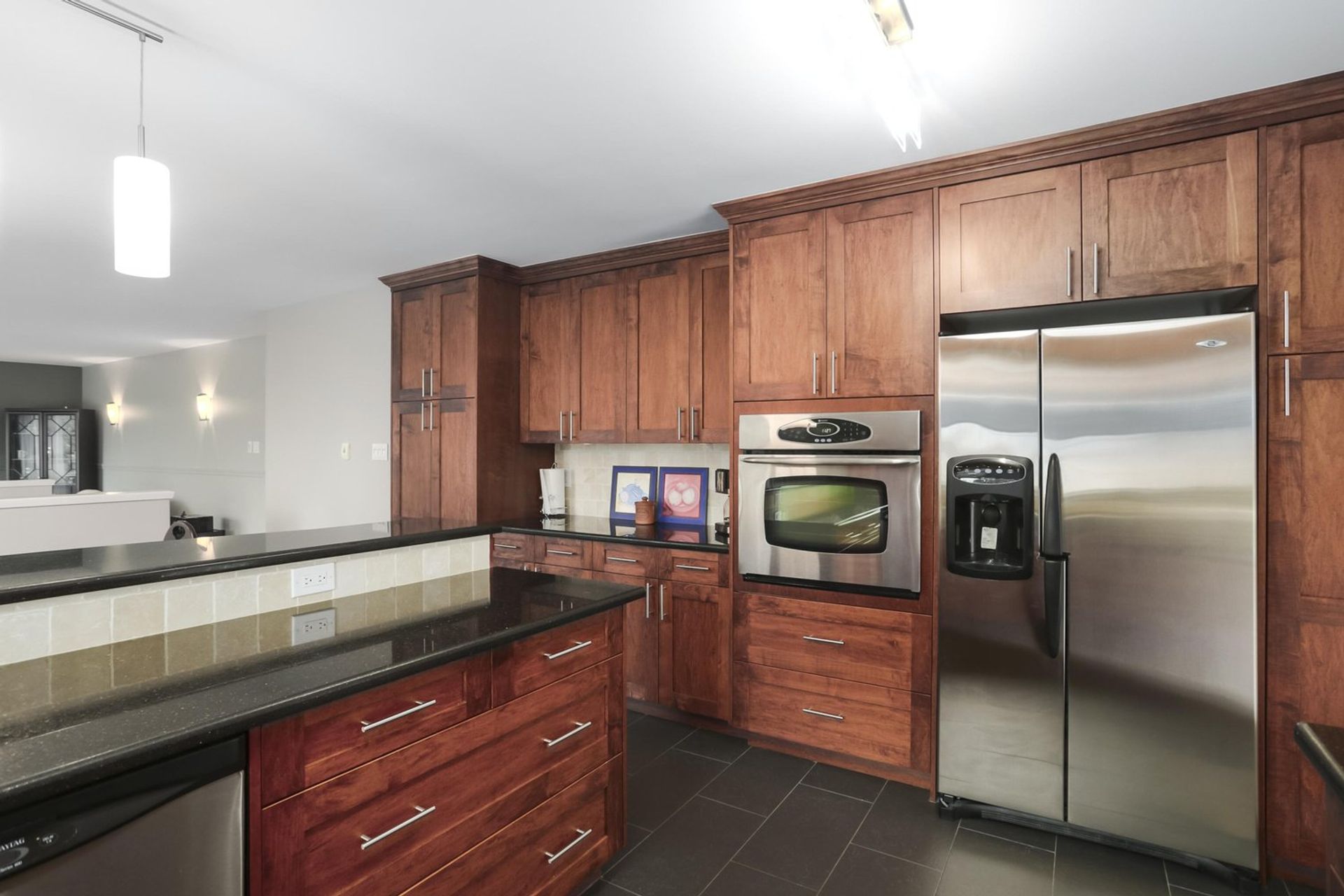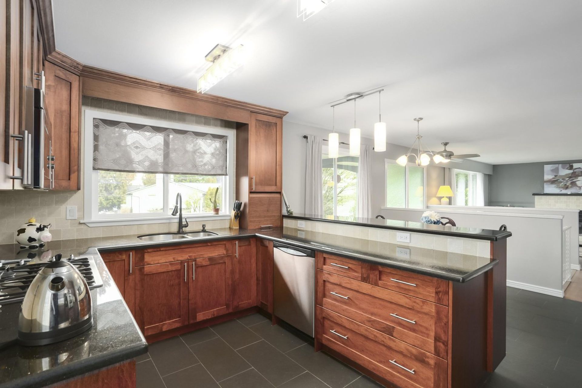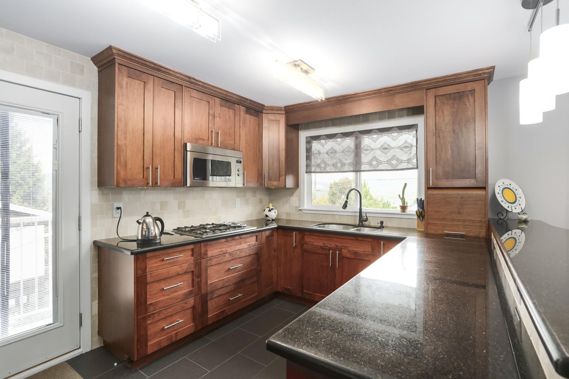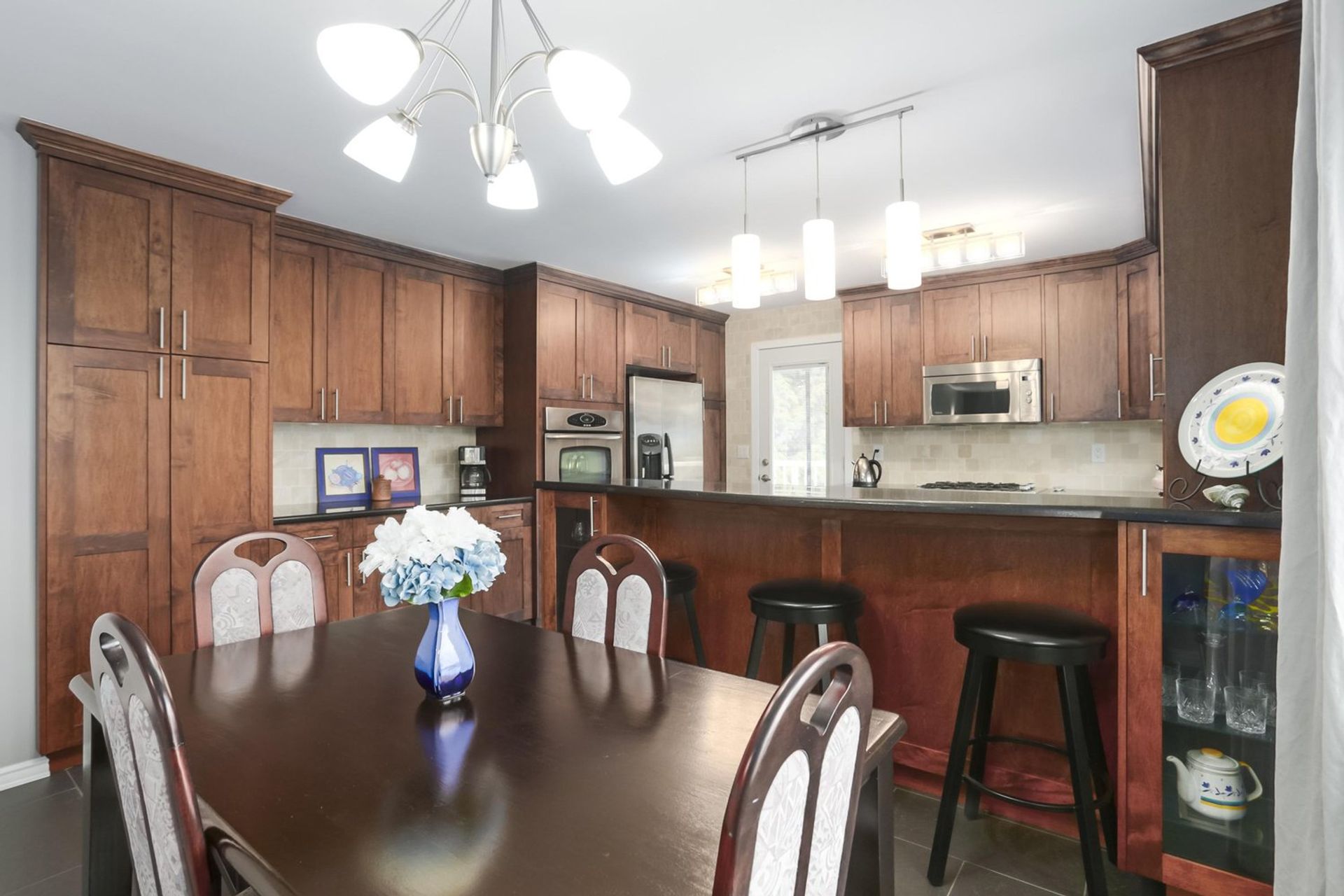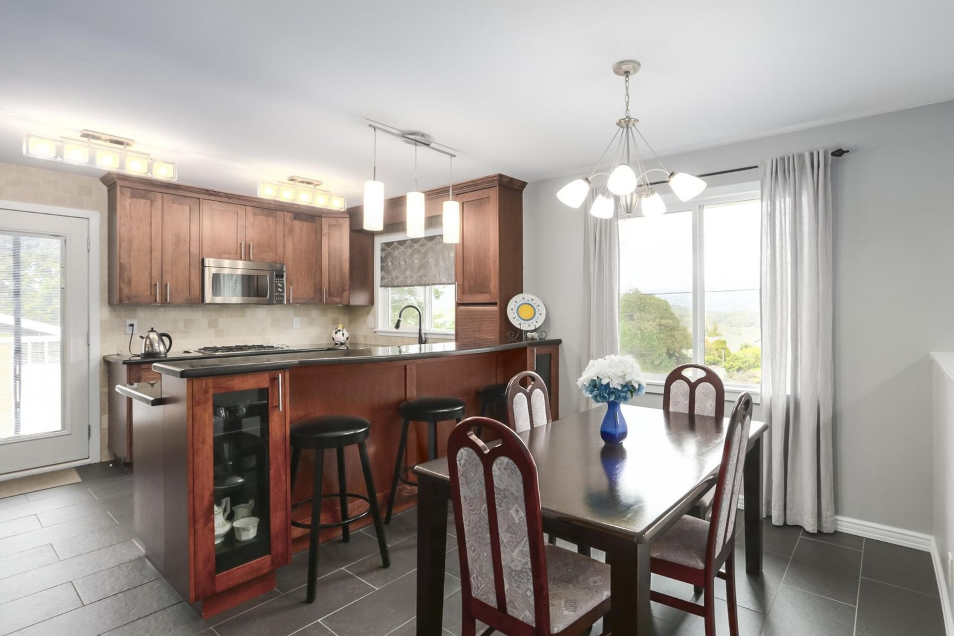 An open kitchen and dining room area features a three person eating bar edged by display cabinetry. Abundant storage space, including a pantry cabinet, coupled with sprawling counters allows room for any occasion, large or small. Modern subway tile contrasts perfectly with the kitchen cabinets, and blends with the patterned granite countertops. A gas cooktop and a built in electric oven allow for a precise cooking experience. There is also a side-by-side freezer/fridge, a built in microwave, a dishwasher, and a double sink with mountain view; all appliances are stainless steel. The kitchen is complete with tasteful accent tiling, updated light fixtures, and a door onto a wrap around deck. The dining room has enough space for a proper dining room table setup as well.