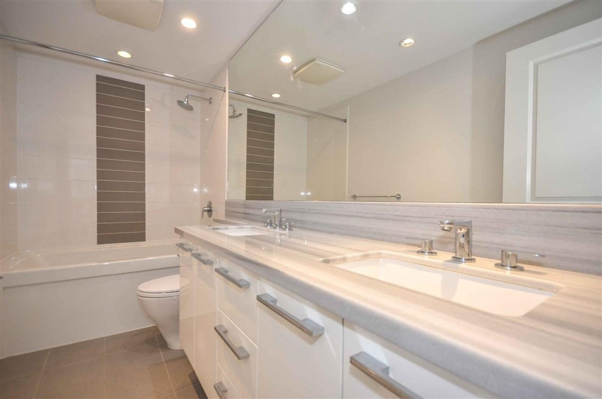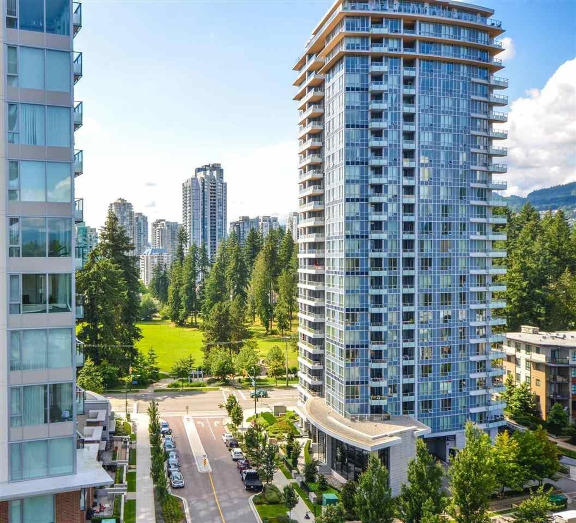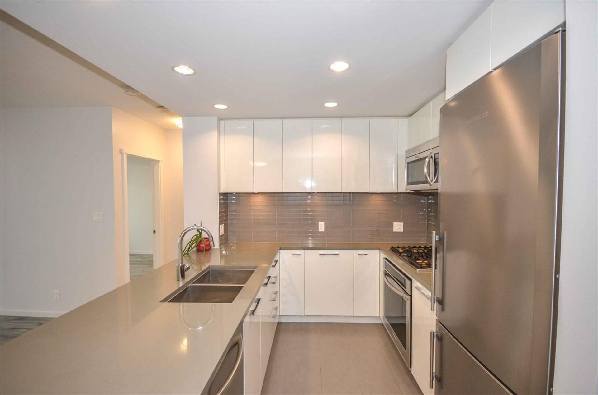 This two bedroom two bathroom unit is located on the fifteenth floor with both mountain, and city views. The main living area features an open concept kitchen, dining room, and living room area—ideal for entertaining friends/family. A gourmet kitchen houses all stainless steel KitchenAid appliances including a gas range, a built-in microwave, and a double industrial style sink. The kitchen has granite countertops, a glass tile backsplash, pot lighting embedded under the cabinets, and stunning all white soft close cabinetry. A large master bedroom features dual closets (one of which is a walk-in), and sizable five piece ensuite with marble counter tops, and a tiled surround soaker tub. The home's second bedroom is on the opposite side of the main living area providing privacy between the two areas. A second three piece bathroom and stacking washer and dryer complete the inside of the condo. Each room includes nearly floor to ceiling windows, allowing for an abundance of natural light. The home was freshly painted and new laminate flooring installed so you can move right in! Finally, a fully covered deck, 10'2 x 6'10, with sweeping views is the perfect addition for year round enjoyment. This home comes with one parking stall and a storage locker. EV charging stations are available in visitor parking. Two pets are allowed including two dogs up to 25 pounds (12 kg). Your strata fees include hot water and natural gas. The building has a separate lounge on the first floor and a gym on the second level.
