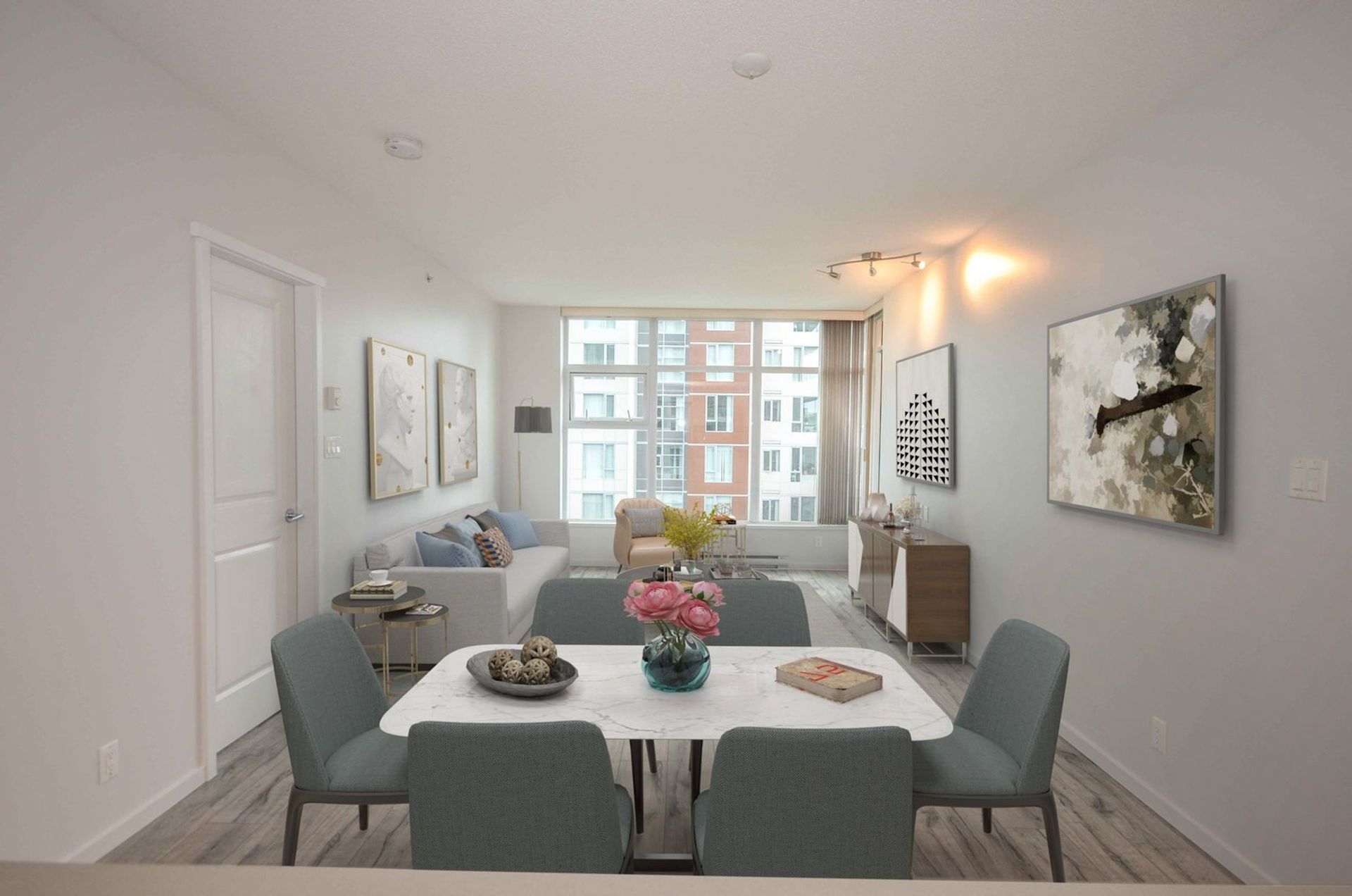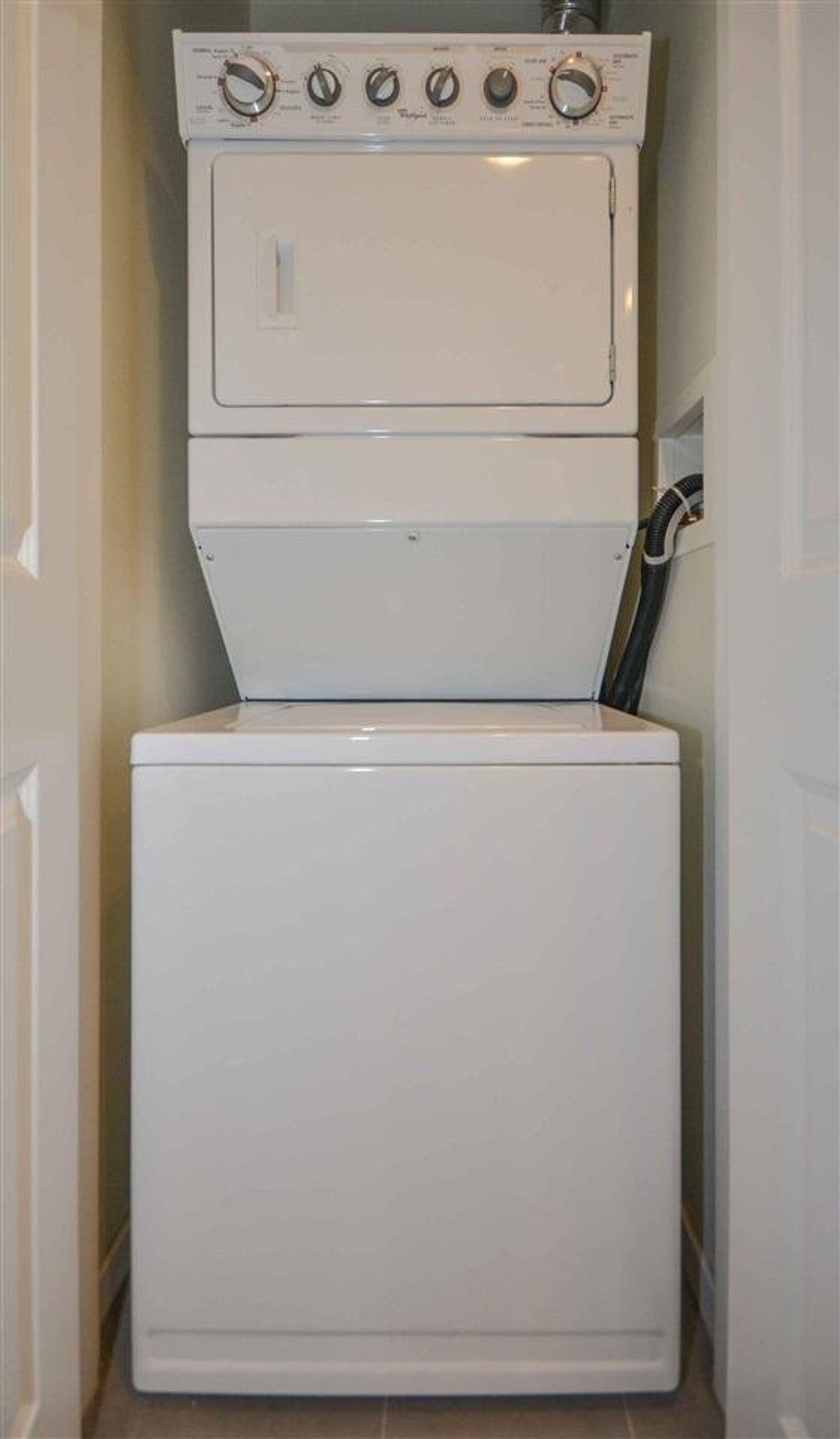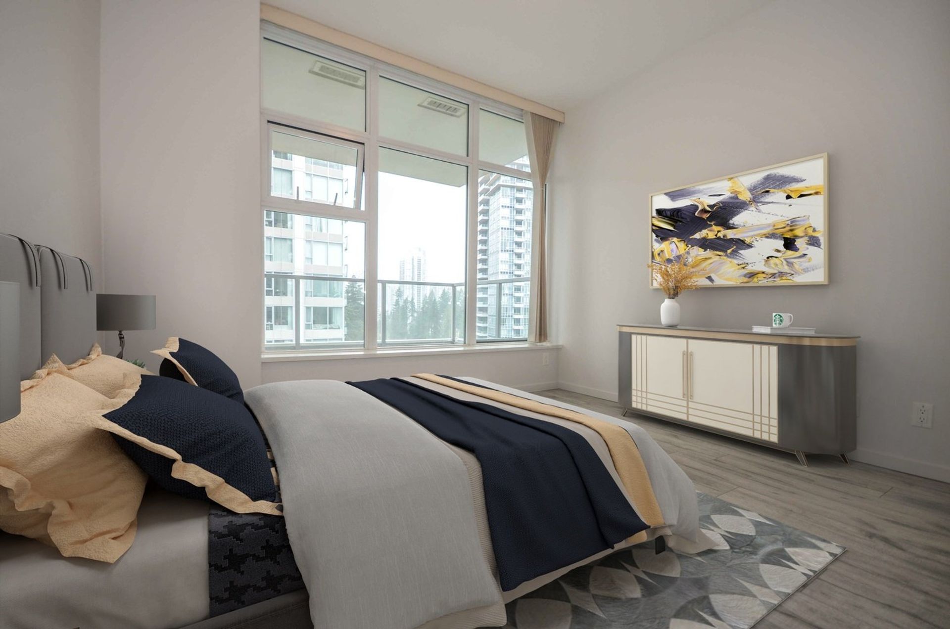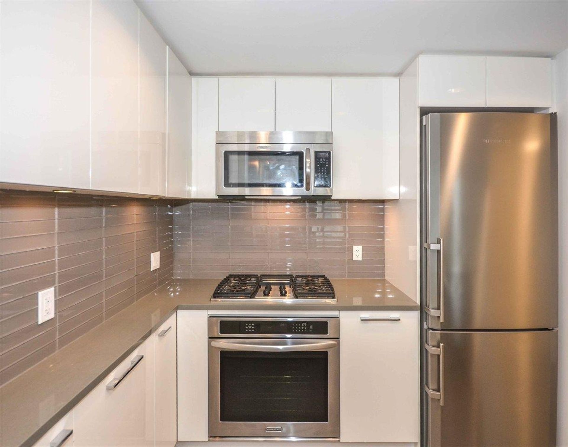 This two bedroom two bathroom unit is located on the fifteenth floor with both mountain, and city views. The main living area features an open concept kitchen, dining room, and living room area—ideal for entertaining friends/family. A gourmet kitchen houses all stainless steel KitchenAid appliances including a gas range, a built-in microwave, and a double industrial style sink. The kitchen has granite countertops, a glass tile backsplash, pot lighting embedded under the cabinets, and stunning all white soft close cabinetry. A large master bedroom features dual closets (one of which is a walk-in), and sizable five piece ensuite with marble counter tops, and a tiled surround soaker tub. The home's second bedroom is on the opposite side of the main living area providing privacy between the two areas. A second three piece bathroom and stacking washer and dryer complete the inside of the condo. Each room includes nearly floor to ceiling windows, allowing for an abundance of natural light. The home was freshly painted and new laminate flooring installed so you can move right in! Finally, a fully covered deck, 10'2 x 6'10, with sweeping views is the perfect addition for year round enjoyment. This home comes with one parking stall and a storage locker. EV charging stations are available in visitor parking. Two pets are allowed including two dogs up to 25 pounds (12 kg). Your strata fees include hot water and natural gas. The building has a separate lounge on the first floor and a gym on the second level.