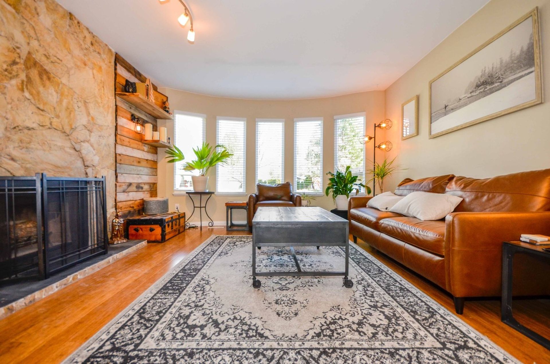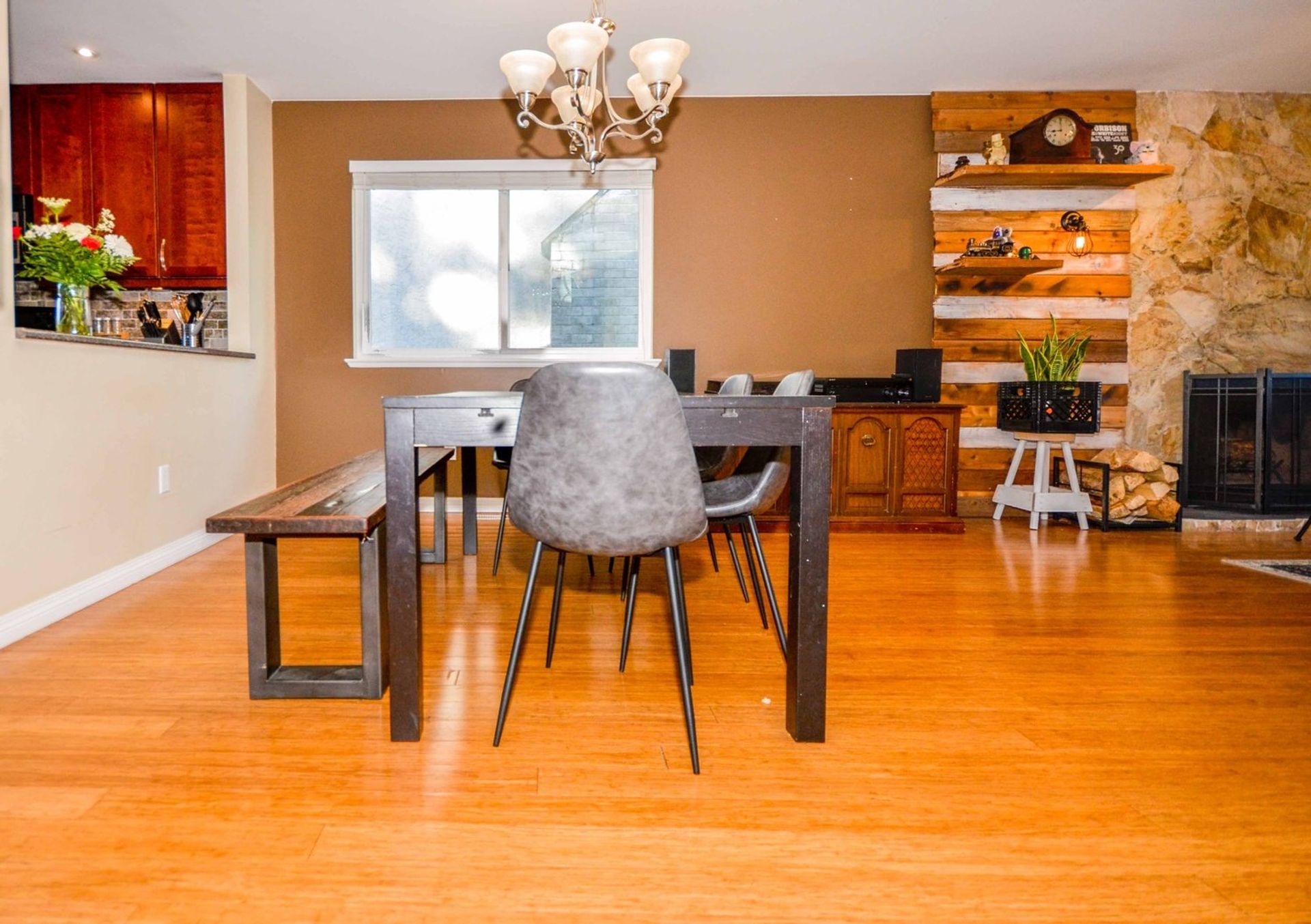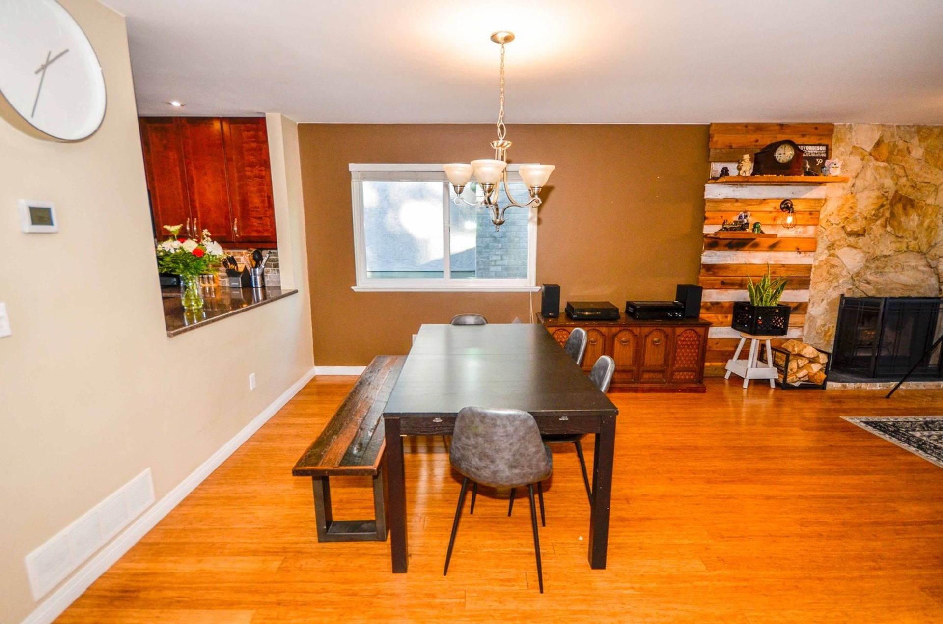The homes main level offers an open, and inviting, kitchen, dining room, and living room. The kitchen has all stainless-steel appliances, soft close cabinetry, a built-in microwave, a double sink with a window overlooking the homes fully fenced backyard, a tile backsplash, and a multi-use bar area providing abundant storage space and an additional counter easily used as a prep area. There is an oversized opening, which runs the full length of the kitchen’s counter, creating great flow from the kitchen to the dining room. The living room and dining room are great room style and features a wood fireplace with a rock mantle and driftwood accent panelling on either side. The living room also has five large side-by-side windows overlooking the front yard and the home’s low traffic, no through street. The entire main level as well as the upper floor, along with its three bedrooms, all have hardwood flooring.