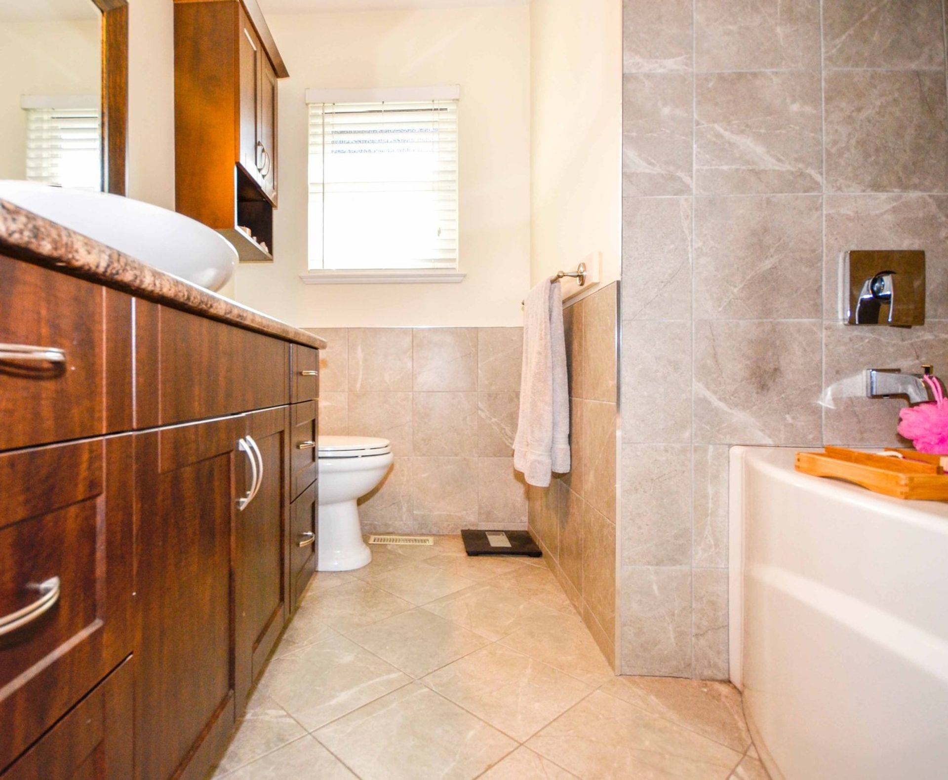 Just a few steps down from the main level there is a large family room with glass French doors which open on to an oversized patio that stretches the full length of the home and includes a one-year-old Beachcomber hot tub; there is a natural gas line out to the patio for BBQ and firepit outdoor enthusiasts. Adjacent to the family room there is a spacious mudroom with tile flooring (which is currently used as a salon), a laundry area, and a three-piece washroom. There is access to the home’s double garage through the mud room. The garage will accommodate two cars while still allowing for a dedicated workshop area and/or extra storage space.