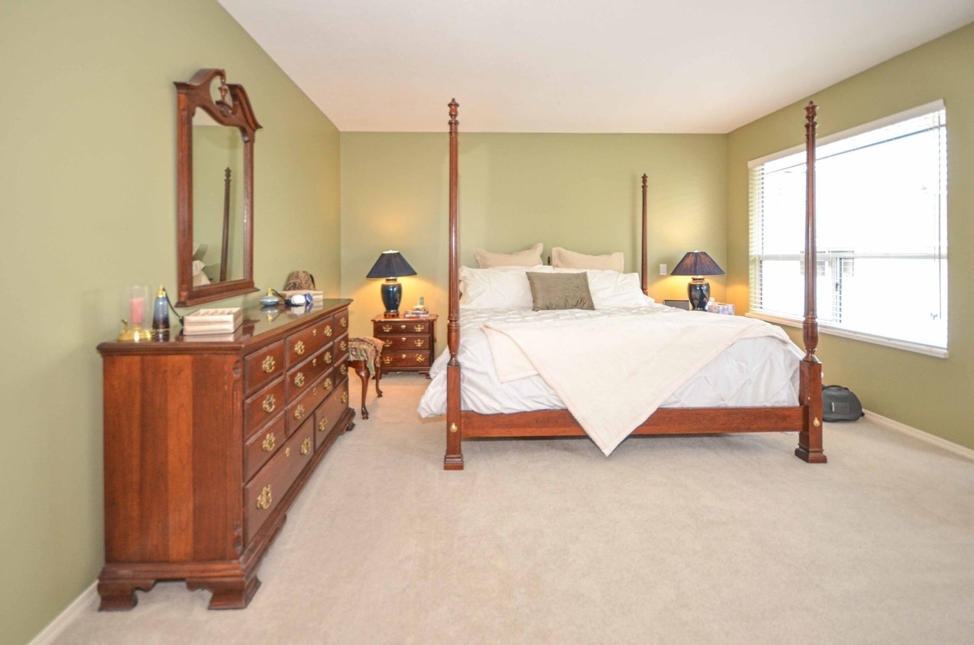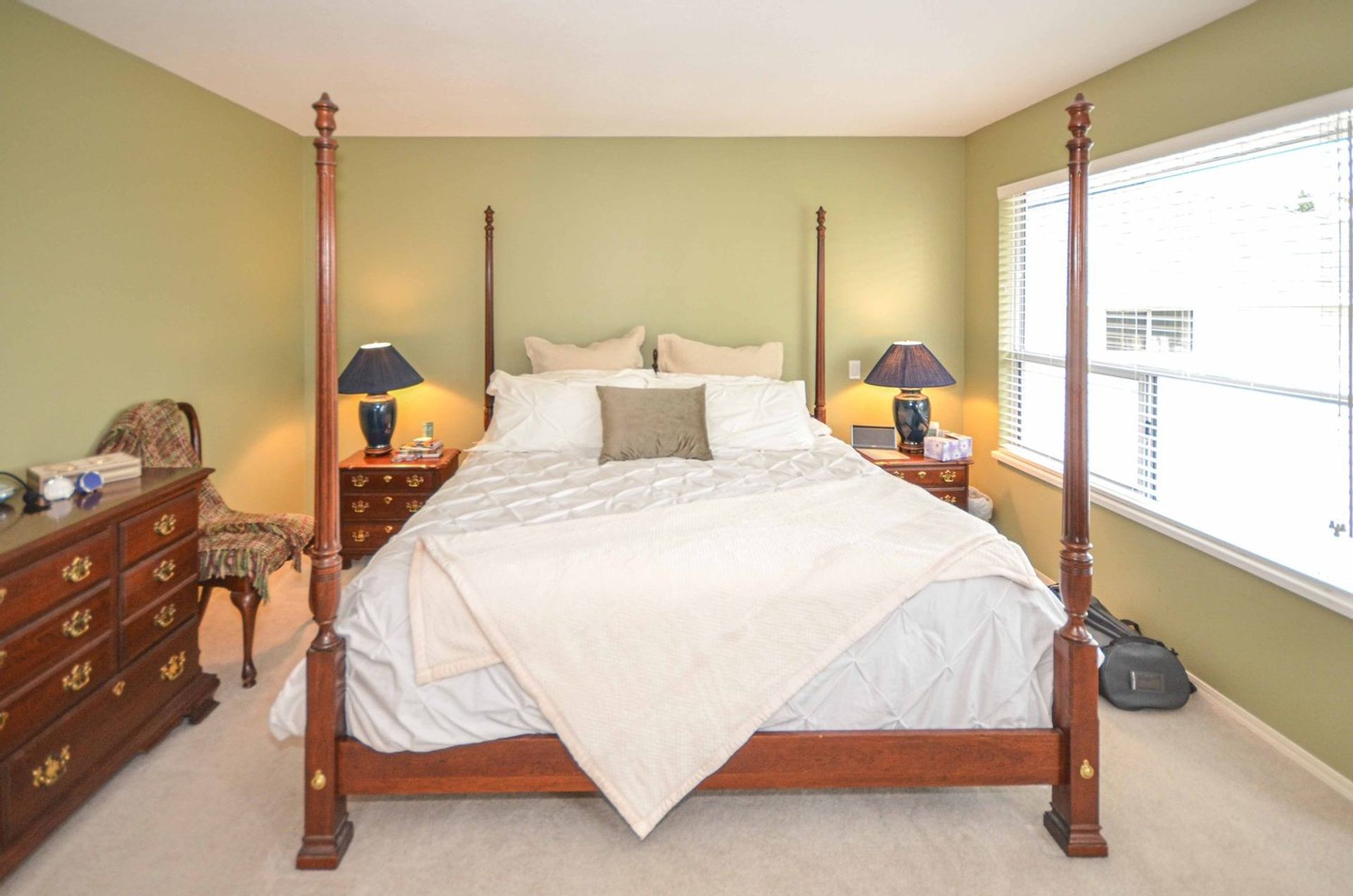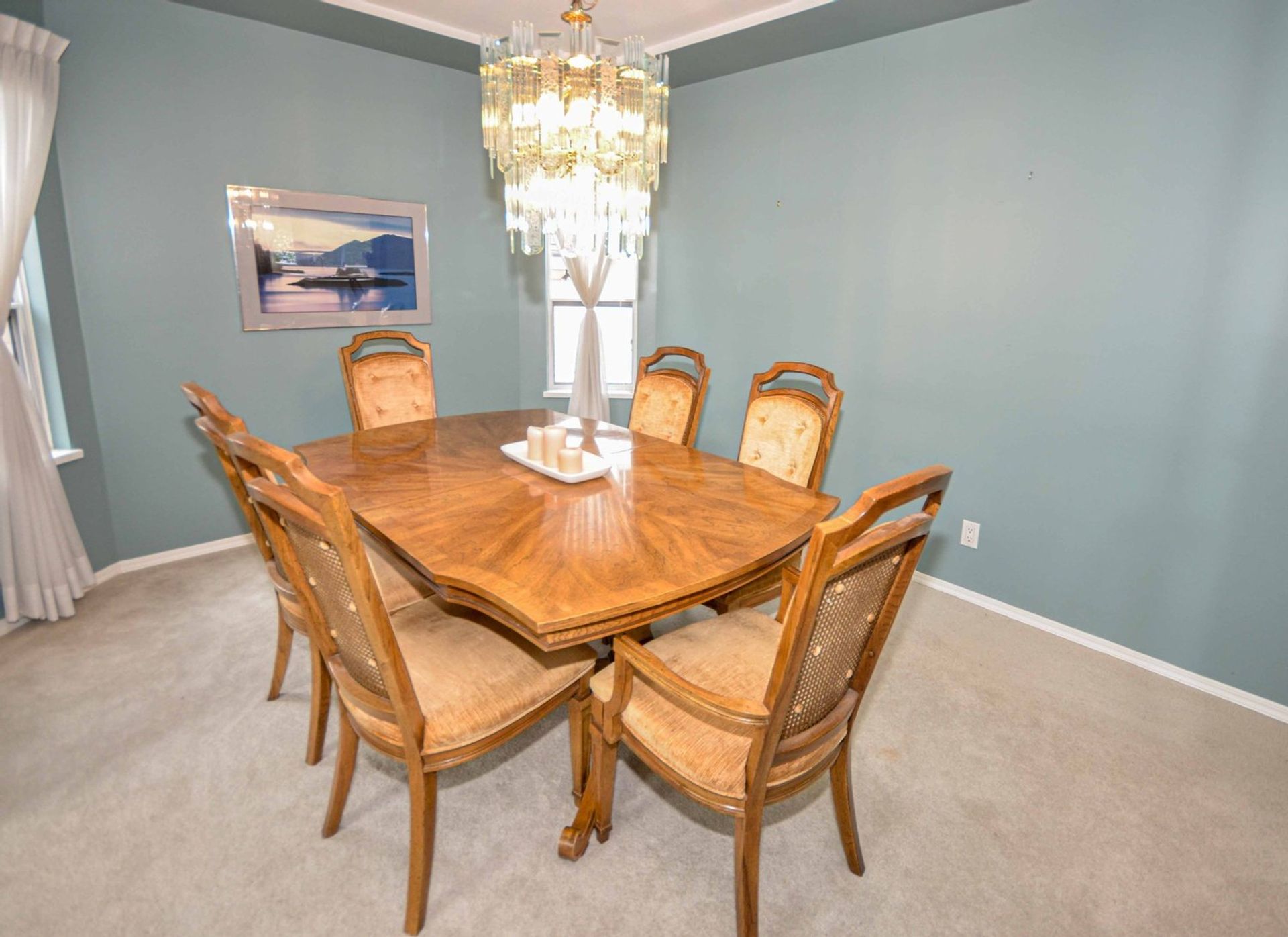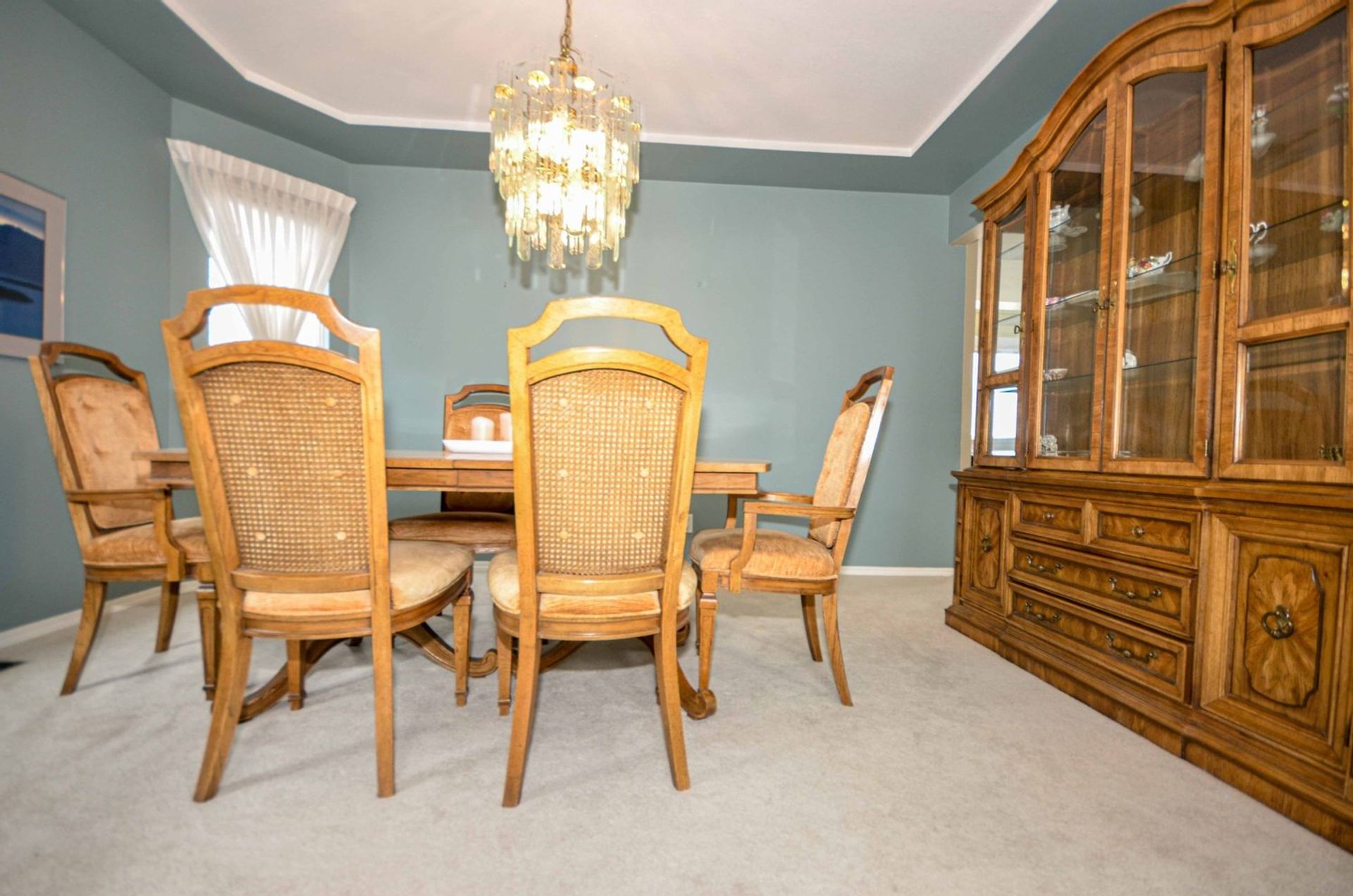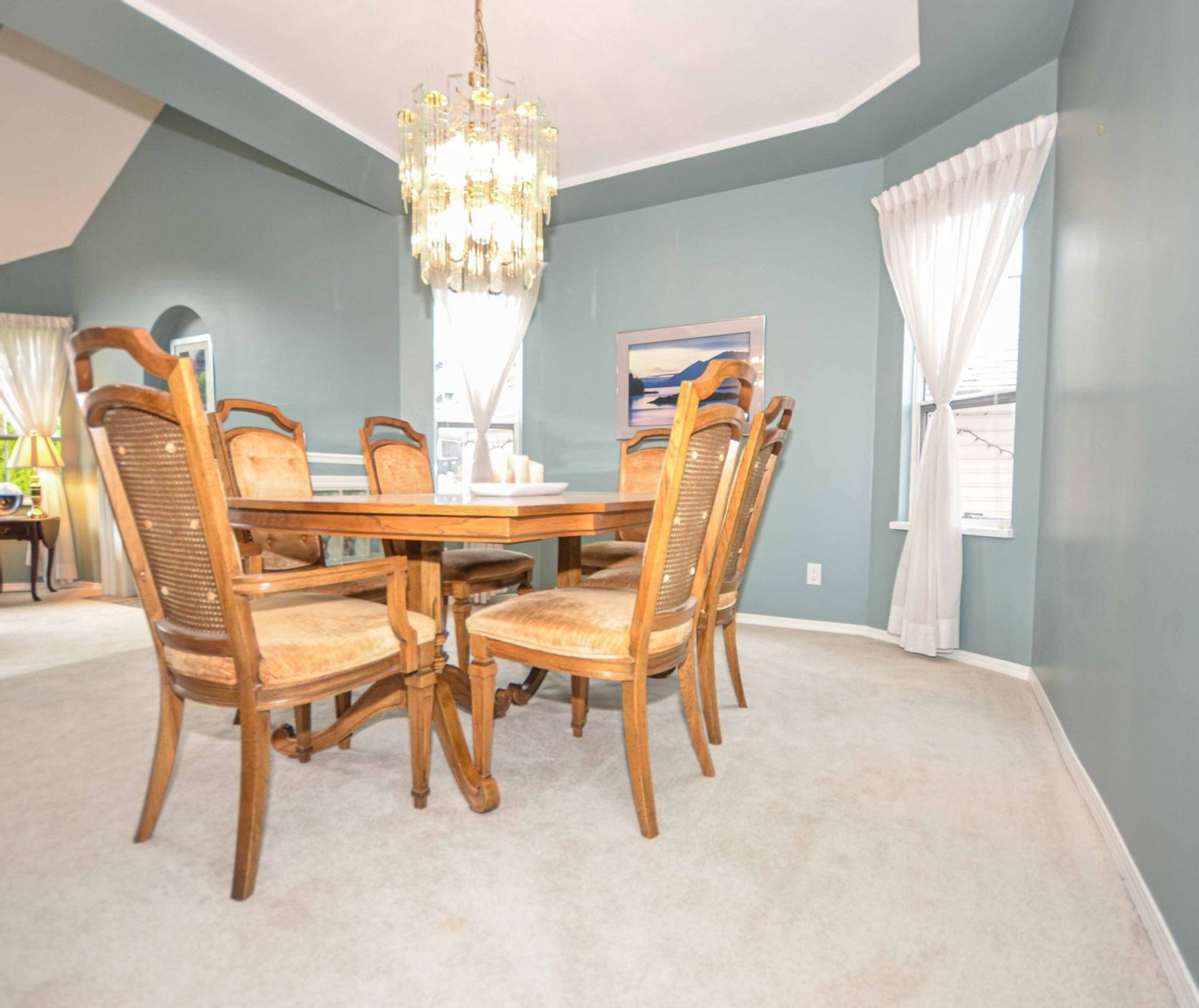 The living room houses vaulted ceilings and a modern Palladian window which creates fantastic natural light and a nice view to the quiet front yard. There is also a tiled gas fireplace for those long fall nights. A formal dining room, with a decorative cove ceiling, is attached to the living room and open to the home’s eating area.