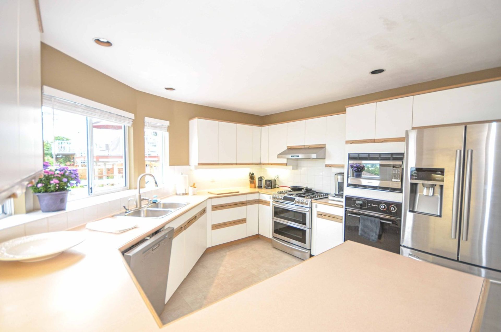 There is an eating area fully open to the kitchen with two skylights and glass sliding doors to a newly renovated wrap around east facing deck, perfect for BBQ’ing and summer plants/flowers. A step down from the eating area is a warm family room with a gas fireplace and two large windows overlooking the backyard.