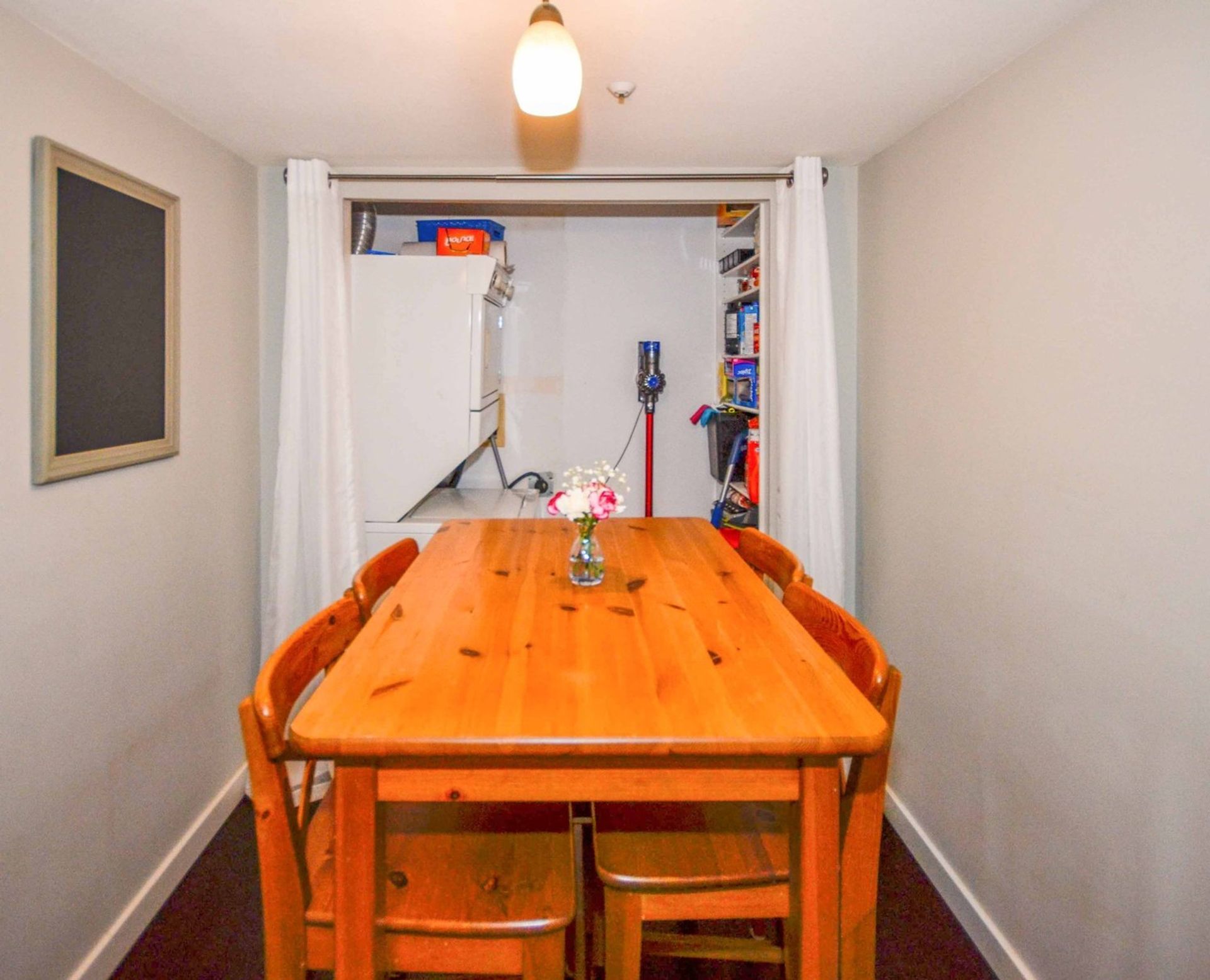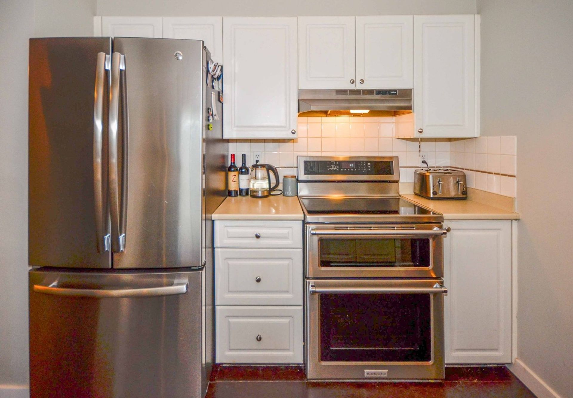 The home’s kitchen features all stainless-steel appliances including a large French door fridge and a new KitchenAid stove which houses two ovens (one of which has a convection setting) and a top-of-the-line even heat induction stove top. The large passthrough opens the kitchen to the main living area and also functions as an eating bar for the family. A semi formal dining area is attached to the kitchen.