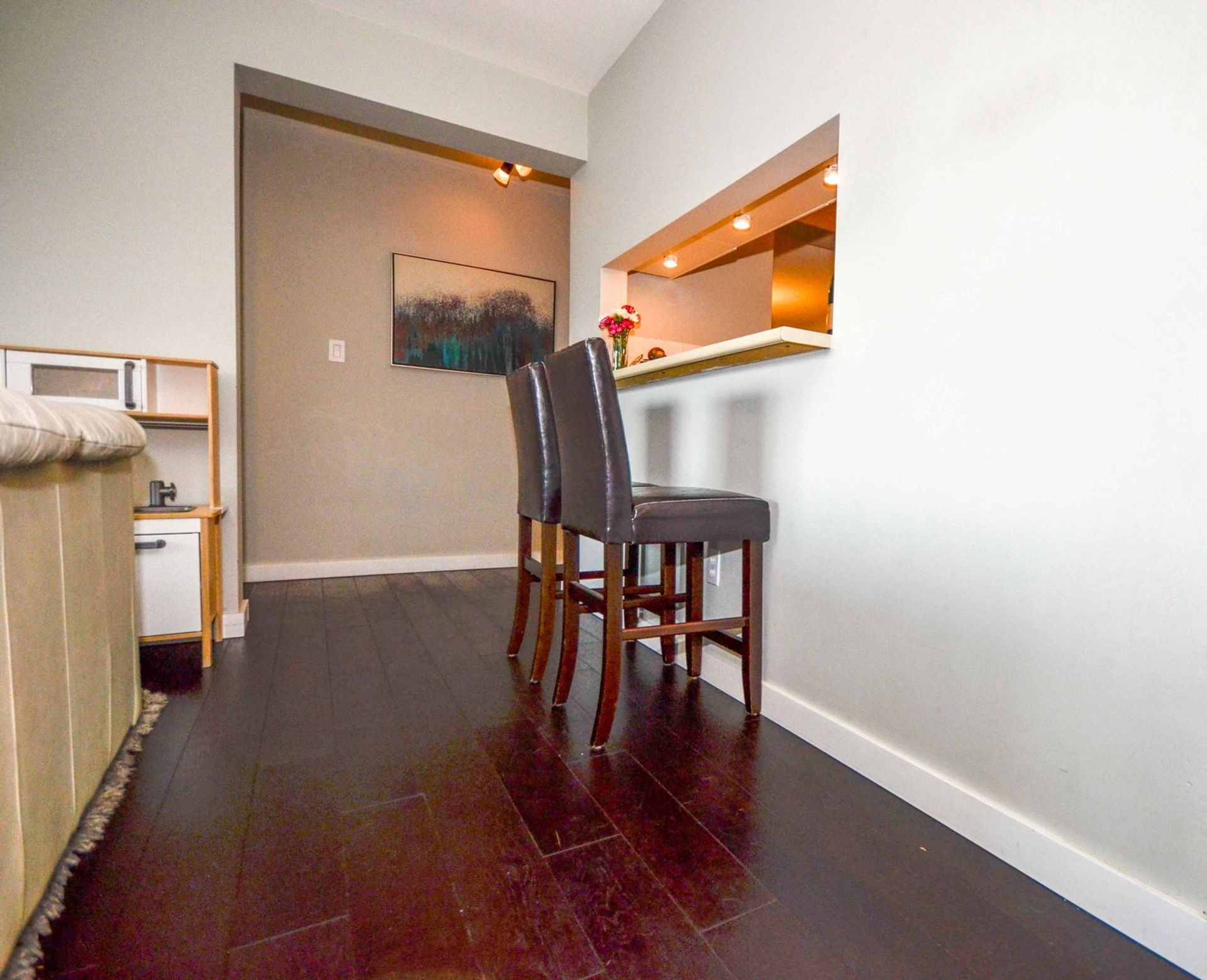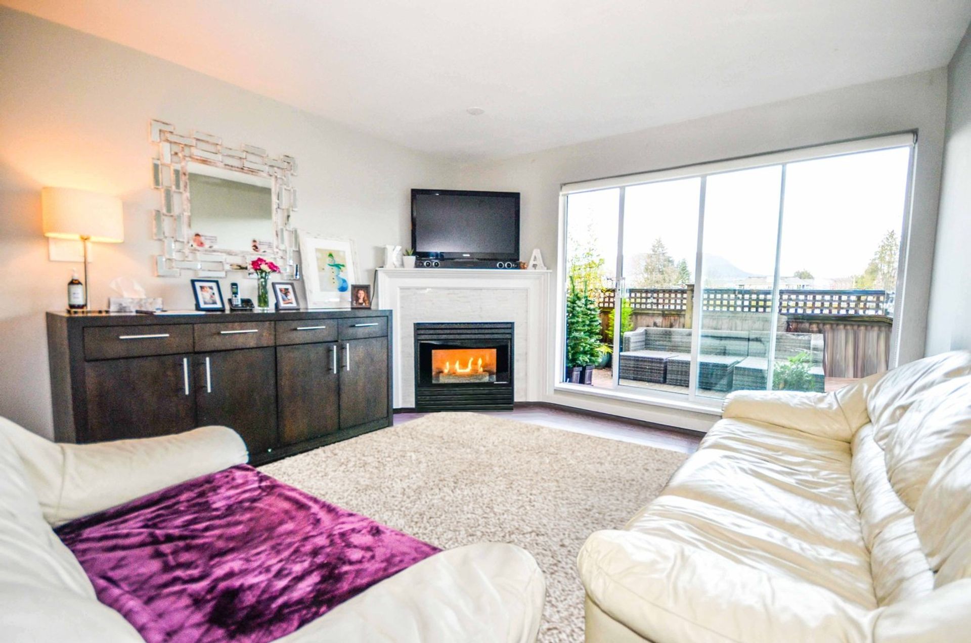 A generous sized living room is the focal point of the home. There is a modern gas fireplace with white stone tiling and an oversized sliding glass door leading to the multifunctional deck. With mountain/city views the deck offers a covered section for year-round use. The entire deck is sizable enough for a full patio BBQ setup, as well as, providing extra space for children, or pets, to play.