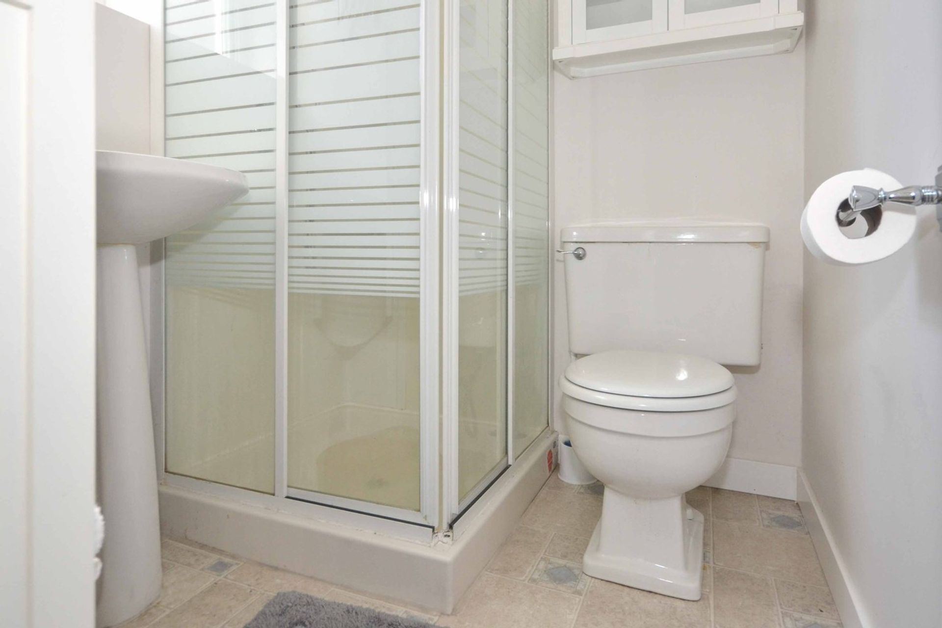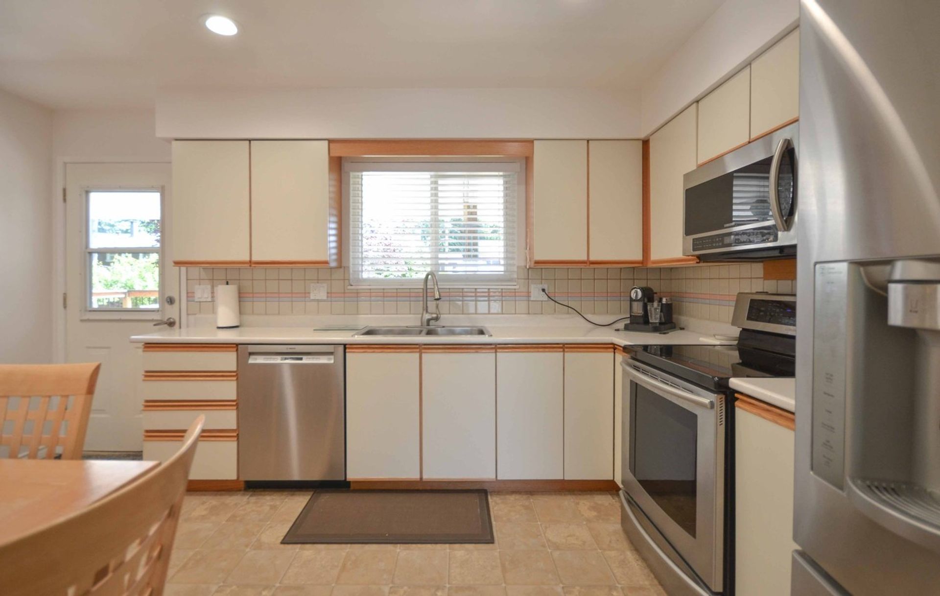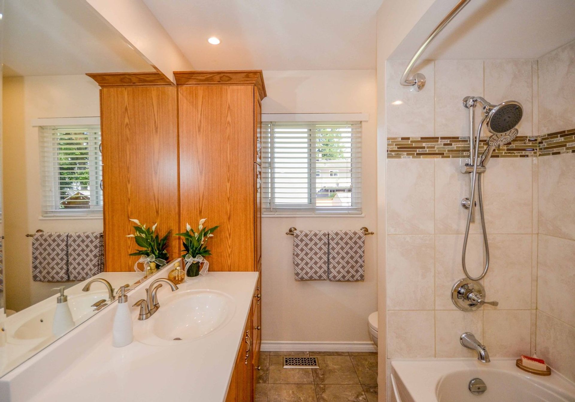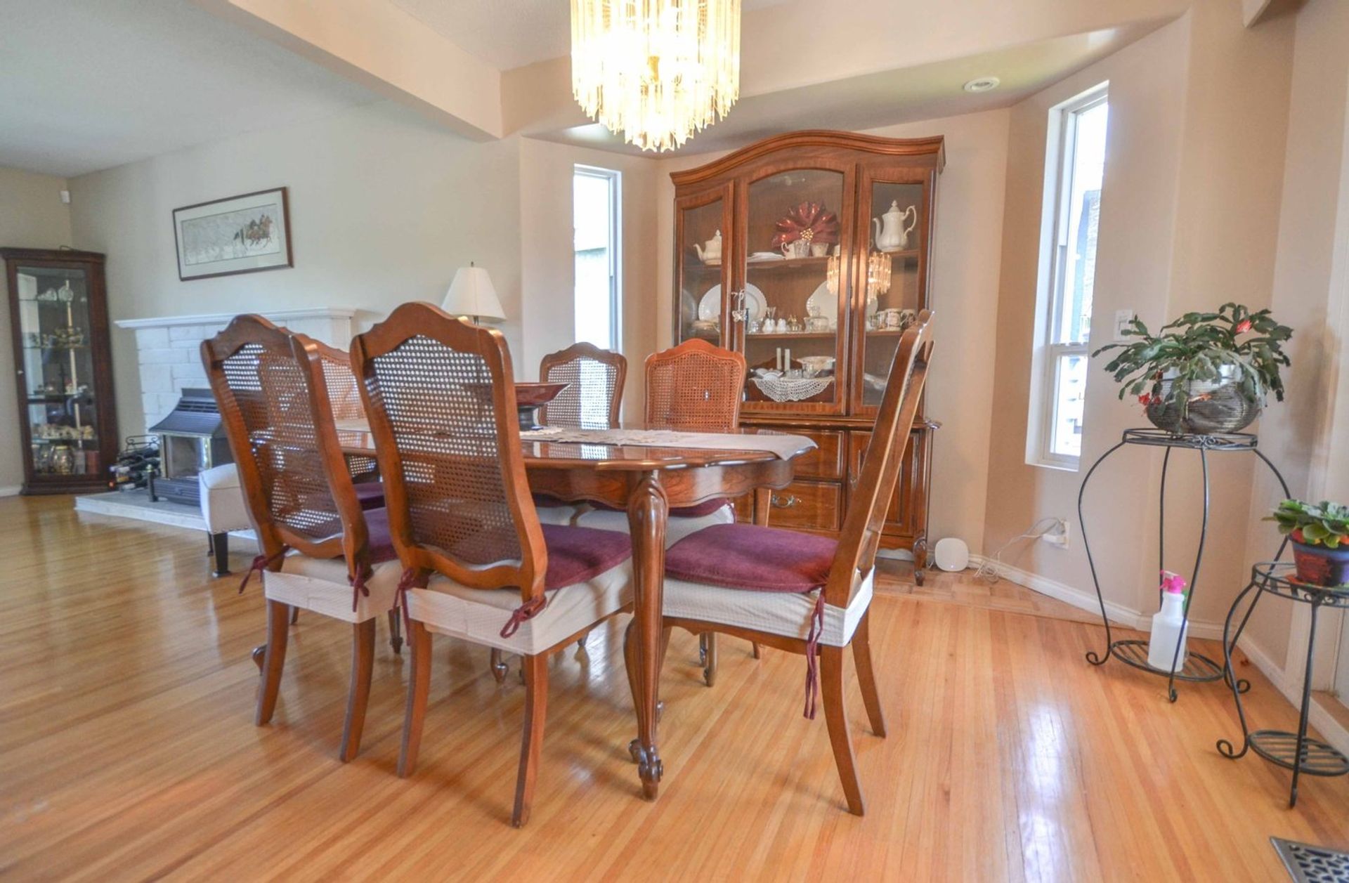 The kitchen provides buyers with enough space for an eating area that could easily be converted into additional storage or counter space as the home’s dining room allows for a full size formal dining table. With all stainless appliances, a built-in microwave, tile backsplash, and updated LED pot lights; the kitchen opens on to a palatial deck. This beautiful outdoor space can also be accessed by French doors from the dining room. The deck is tiered with a substantial covered area providing ample room for year-round use along with a lower section perfect for sun lovers. The outdoor space is ideal for a socially distanced summer of entertaining close friends and family. There is also a small deck at the front of the home through a sliding glass door in the living room which is positioned between two floor-to-ceiling windows leaving the space flushed with natural light. The living room has a gas fireplace and lovingly maintained hardwood floors which are present in the remainder of the main level. There are three bedrooms on this level including the master, which has a walk-in closet and a two-piece ensuite. The main washroom has been renovated to include a deep tiled soaker tub, a linen cabinet, and new lighting. Storage is in no short supply with three deep closets on the main floor.
