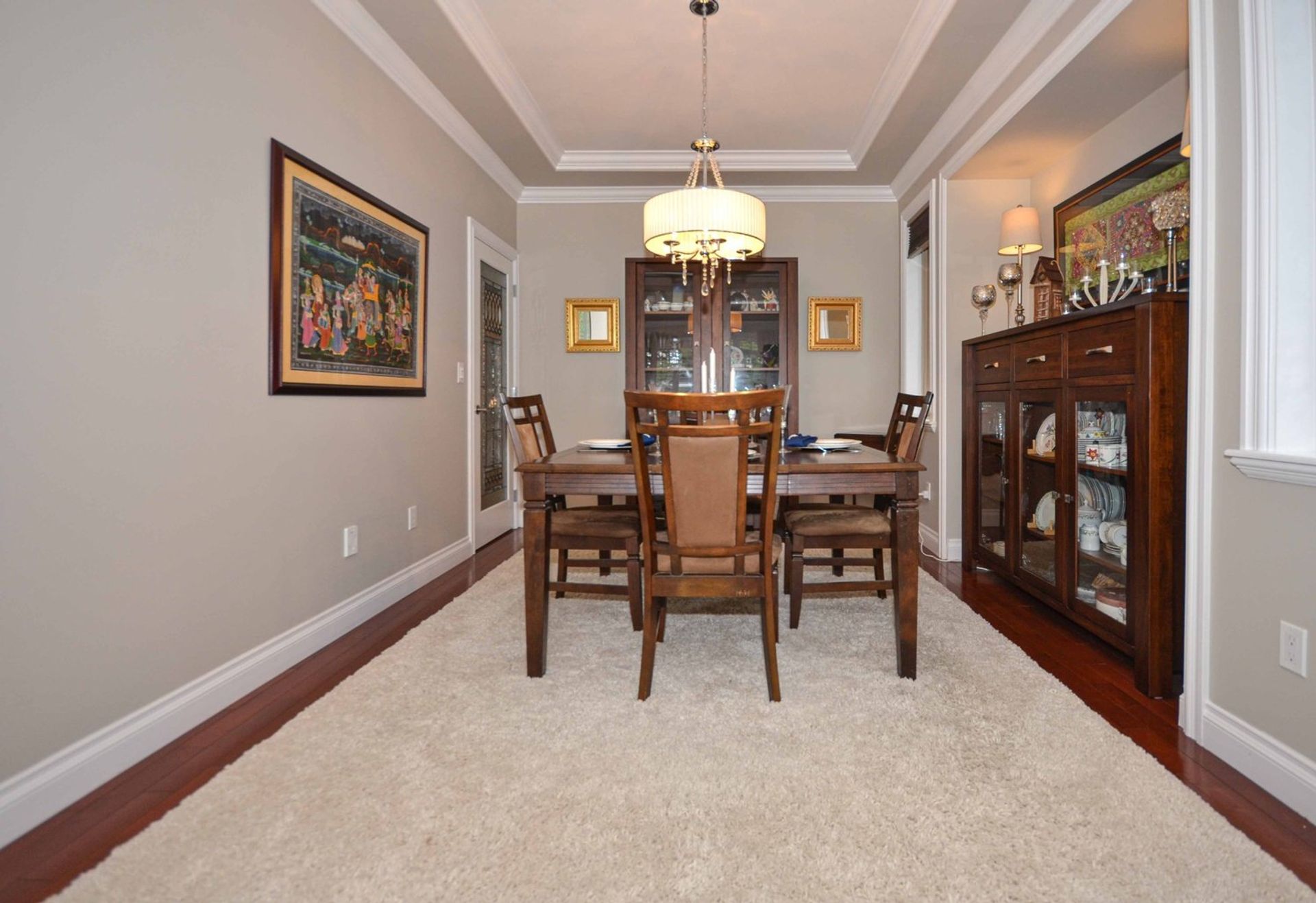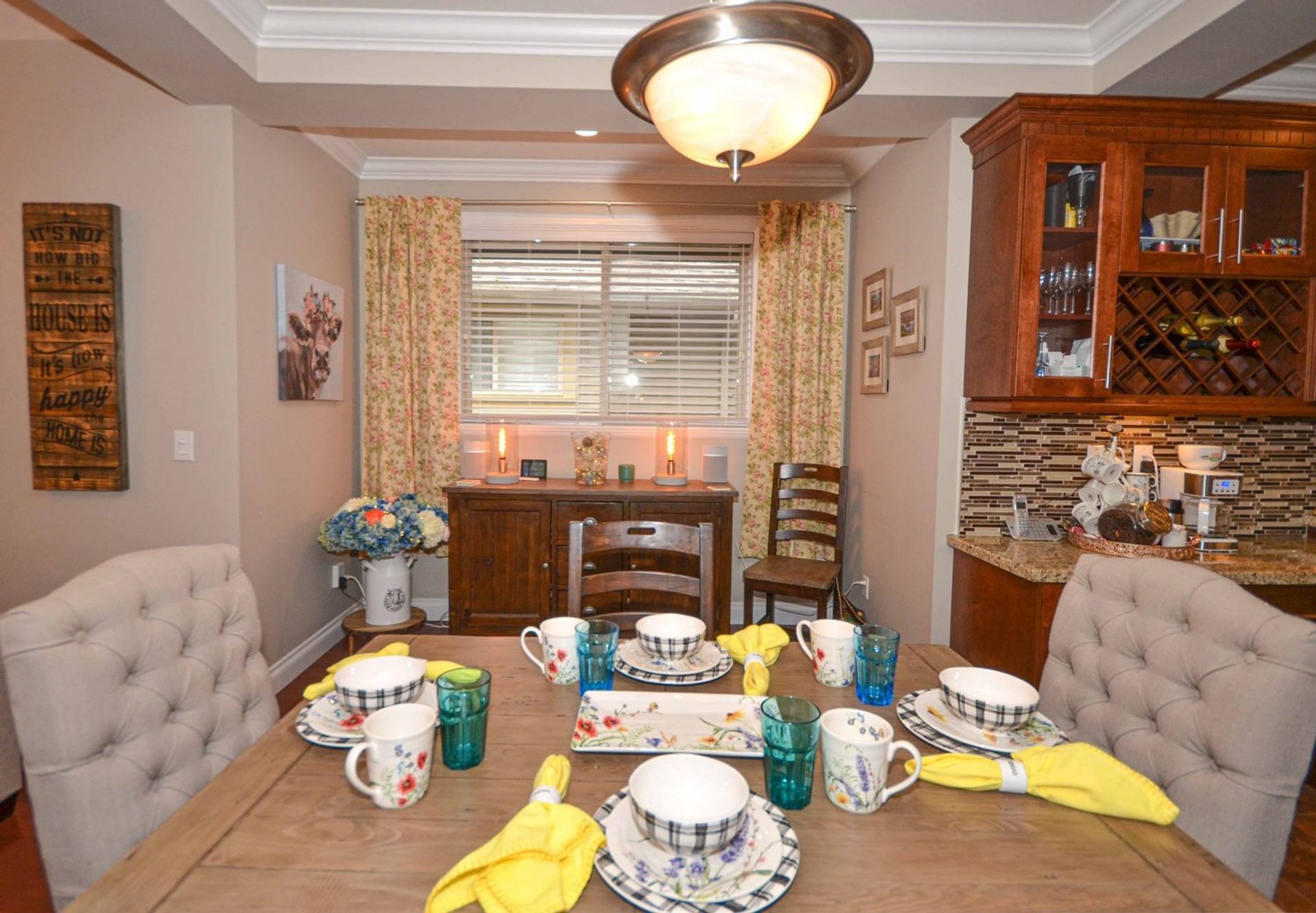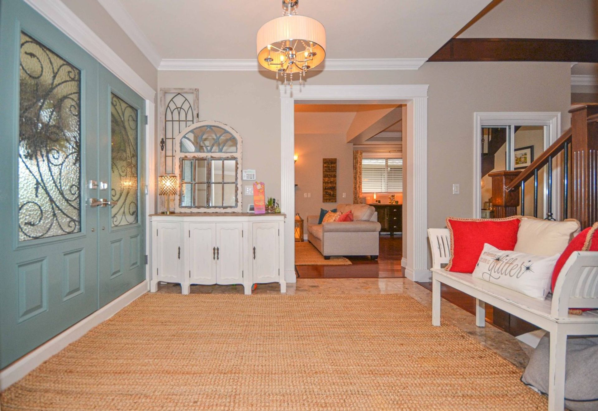 You are immediately welcomed by a large covered front deck with enough room for a full patio setup. The deck overlooks a sizable park area ensuring ample space between neighbouring homes. Stepping inside the home showcases a stunning kitchen: subway tiling flooring, a large island with storage on both sides, all stainless appliances including a five-burner stove, granite counters, soft close cabinetry, tiled backsplash, a dedicated work area, glass display cabinets, a built-in wine rack, accent counter lighting, and a dedicated pantry. The kitchen is open to the eating area with an elegant tray ceiling and a family room with a vaulted ceiling and a slate gas fireplace. Hardwood floors run through the breadth of the home’s main floor along with crown moulding/baseboards; and custom California Shutters adorn nearly every window in the house.