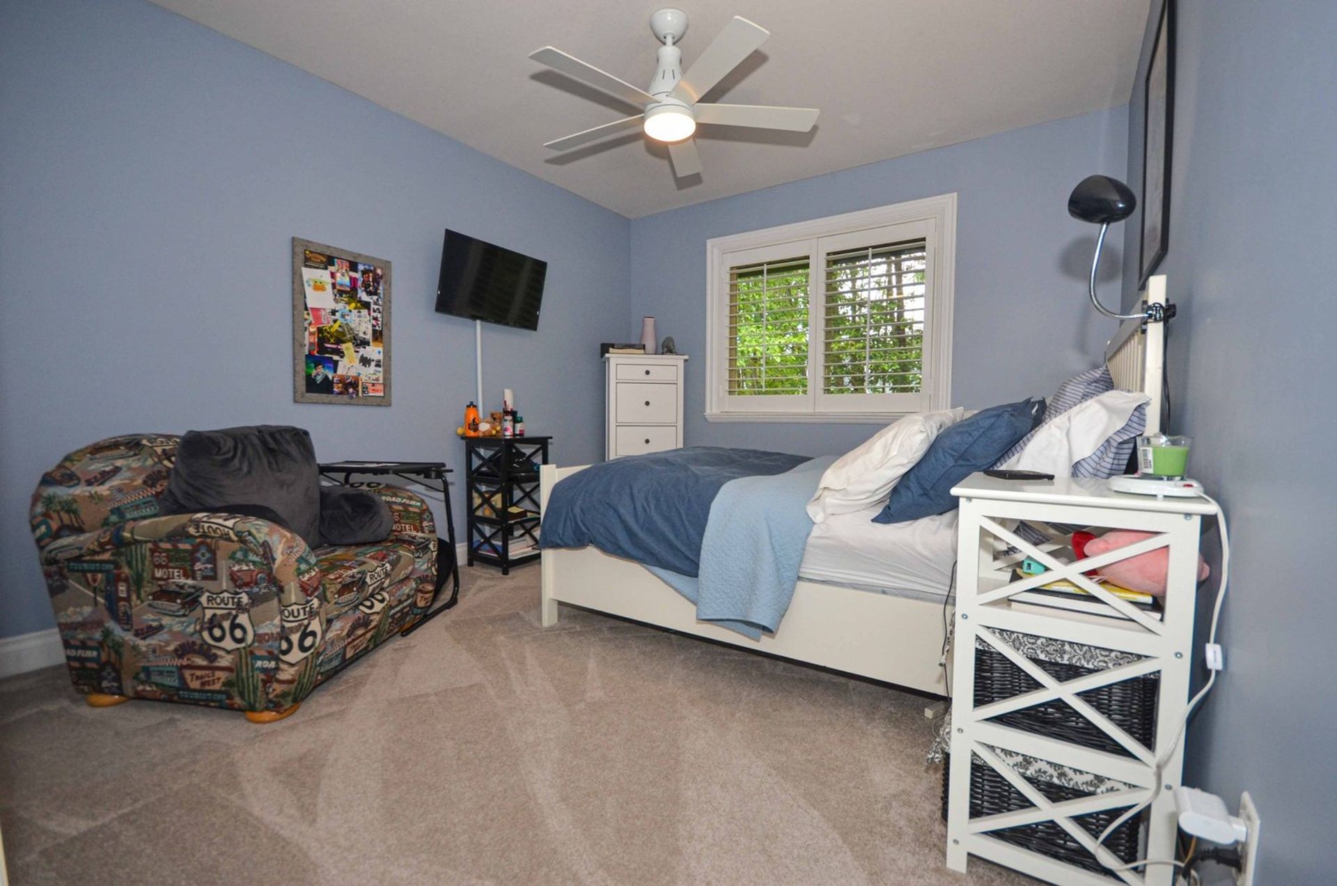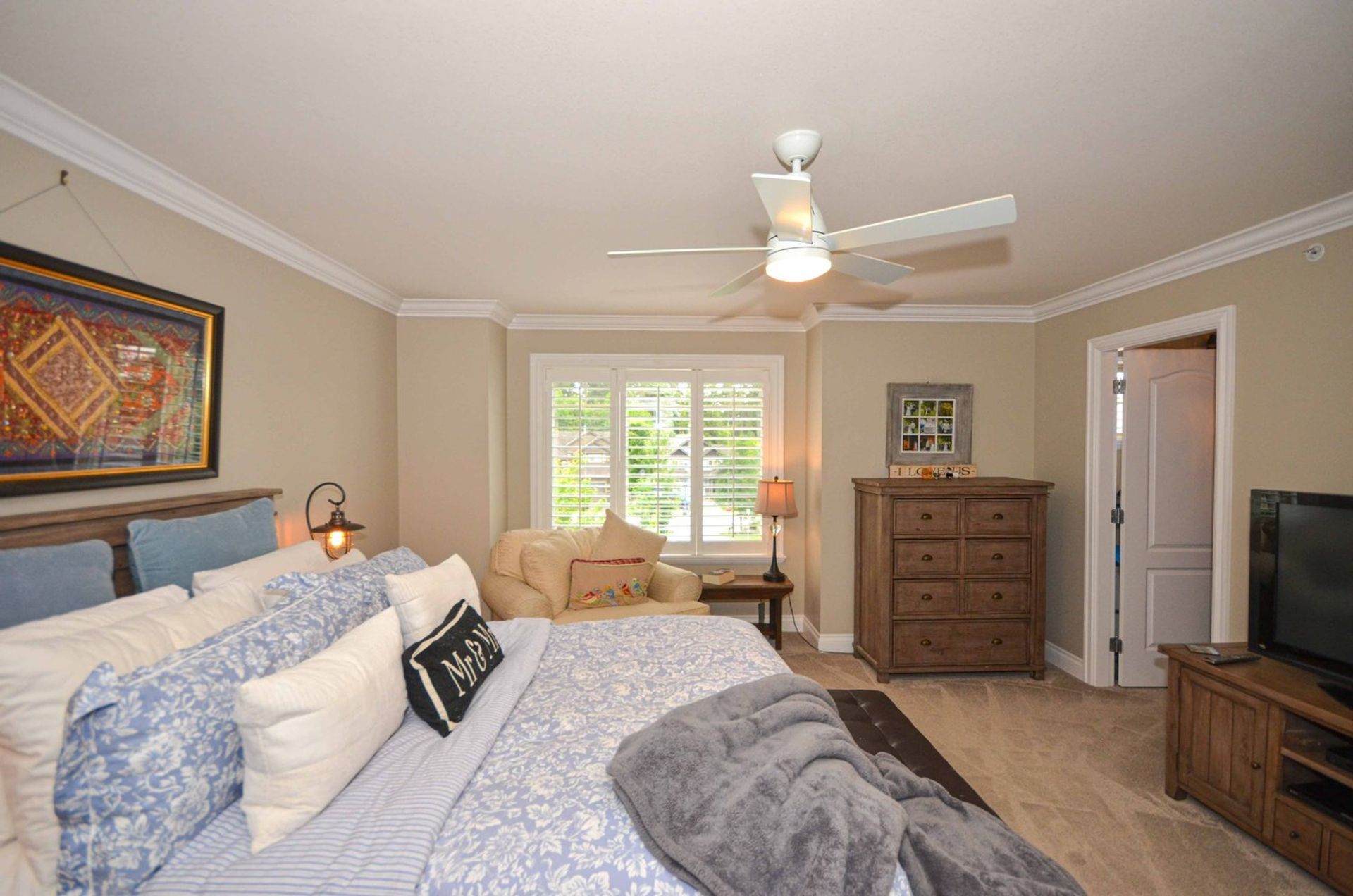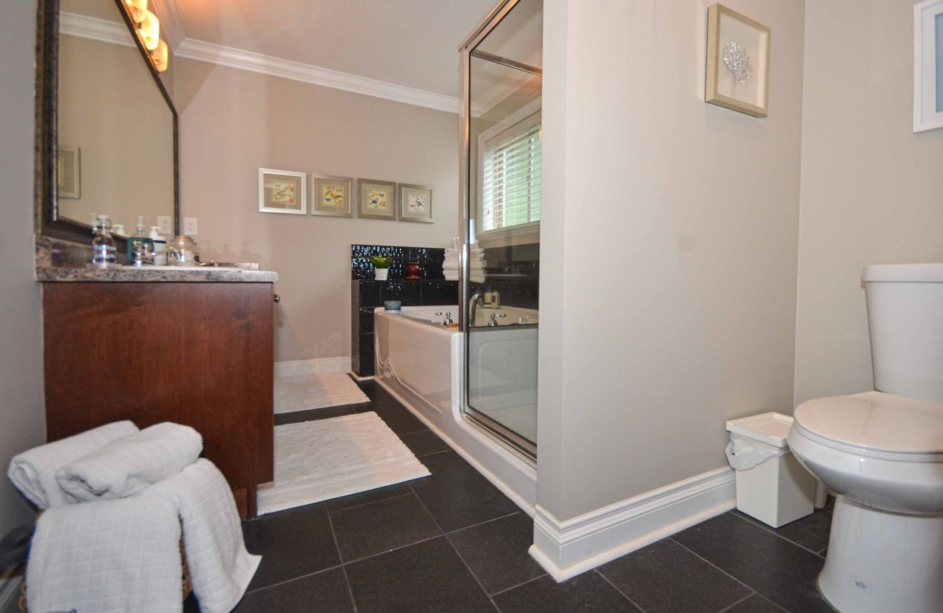 You are immediately welcomed by a large covered front deck with enough room for a full patio setup. The deck overlooks a sizable park area ensuring ample space between neighbouring homes. Stepping inside the home showcases a stunning kitchen: subway tiling flooring, a large island with storage on both sides, all stainless appliances including a five-burner stove, granite counters, soft close cabinetry, tiled backsplash, a dedicated work area, glass display cabinets, a built-in wine rack, accent counter lighting, and a dedicated pantry. The kitchen is open to the eating area with an elegant tray ceiling and a family room with a vaulted ceiling and a slate gas fireplace. Hardwood floors run through the breadth of the home’s main floor along with crown moulding/baseboards; and custom California Shutters adorn nearly every window in the house.