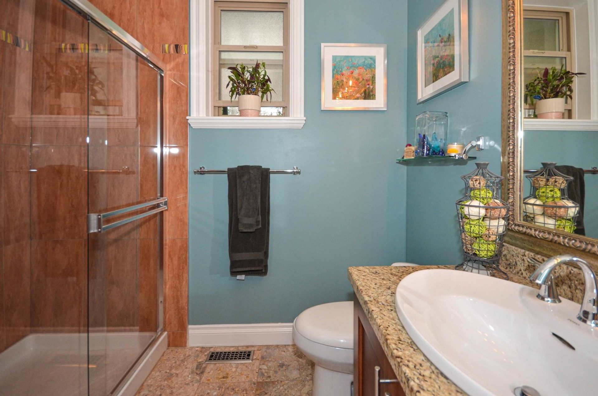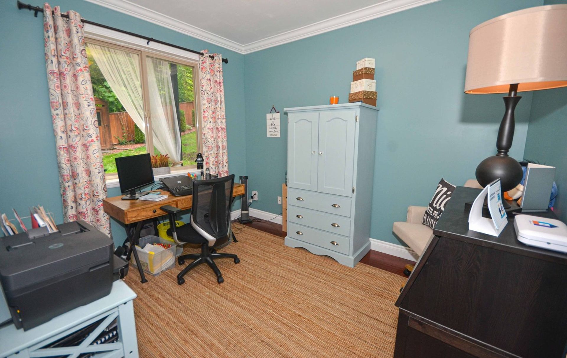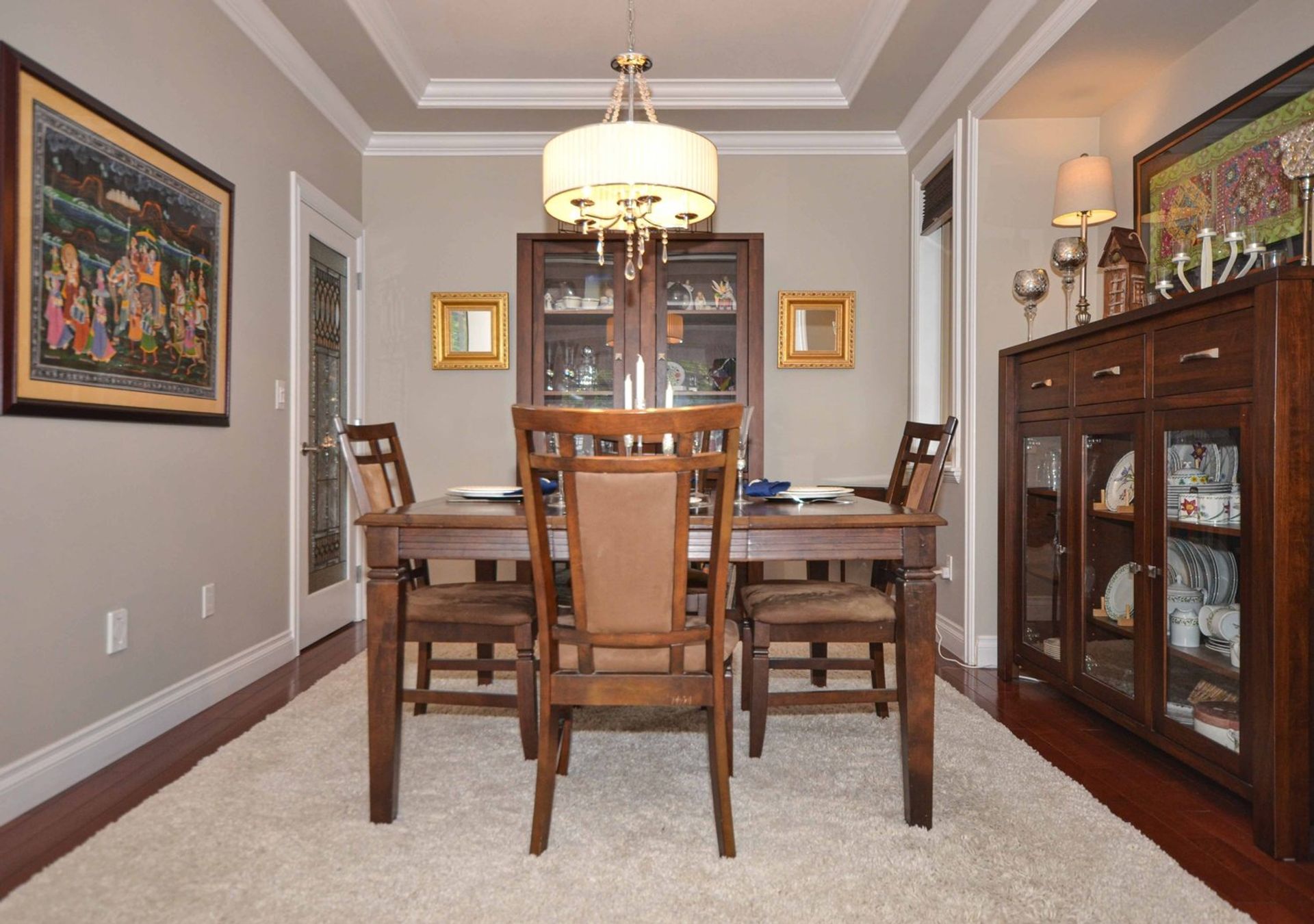 Across the foyer from the family room there is an open concept formal living room and dining room. The living room has a second gas fireplace identical to the one in the family room and the dining room features dual stain glass windows, a nook area for a display cabinet, and an ornate tray ceiling. The main floor is complete with a tucked away office and a four-piece washroom with walk-in shower, subway tiling flooring, and granite counters.