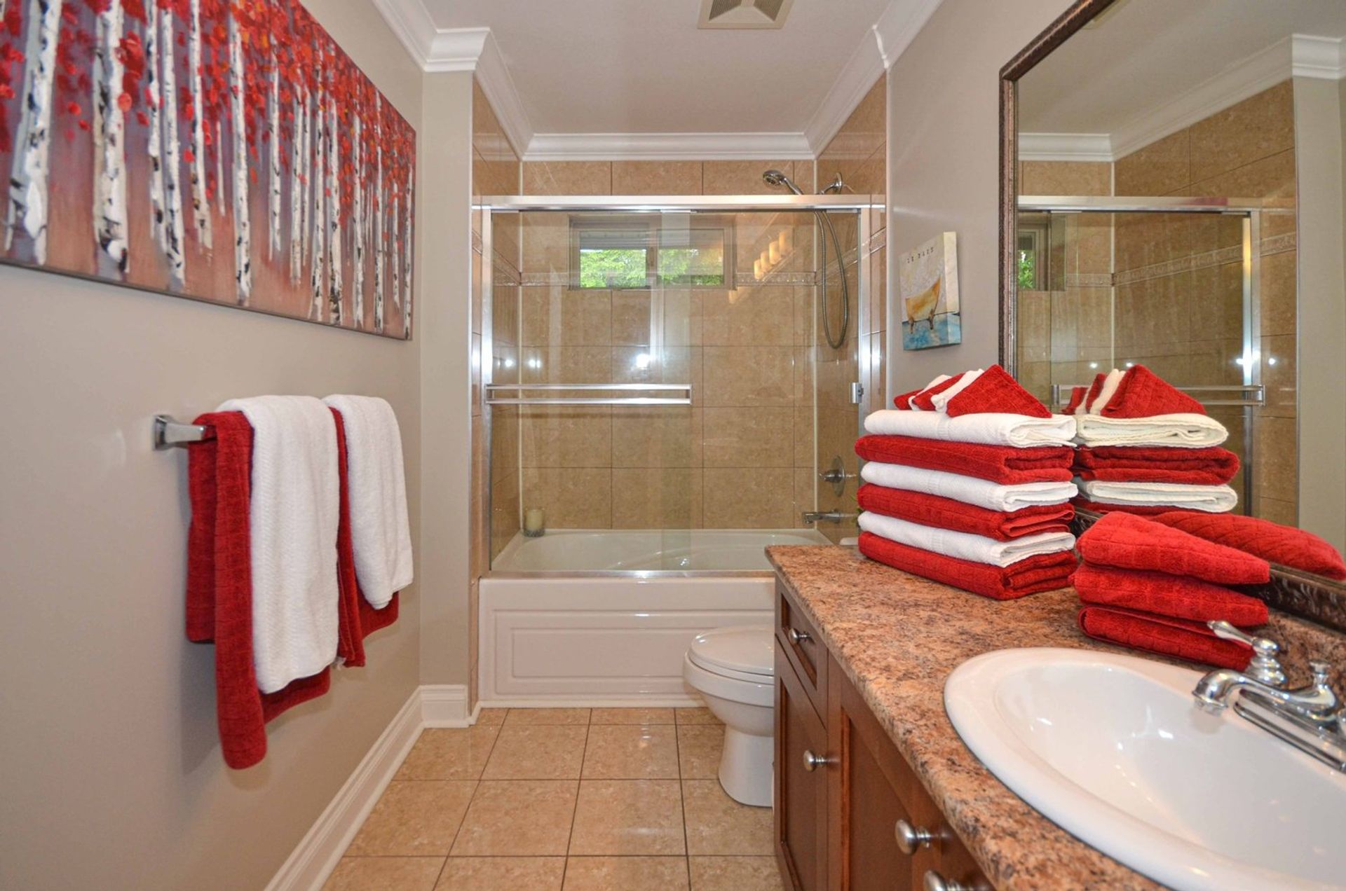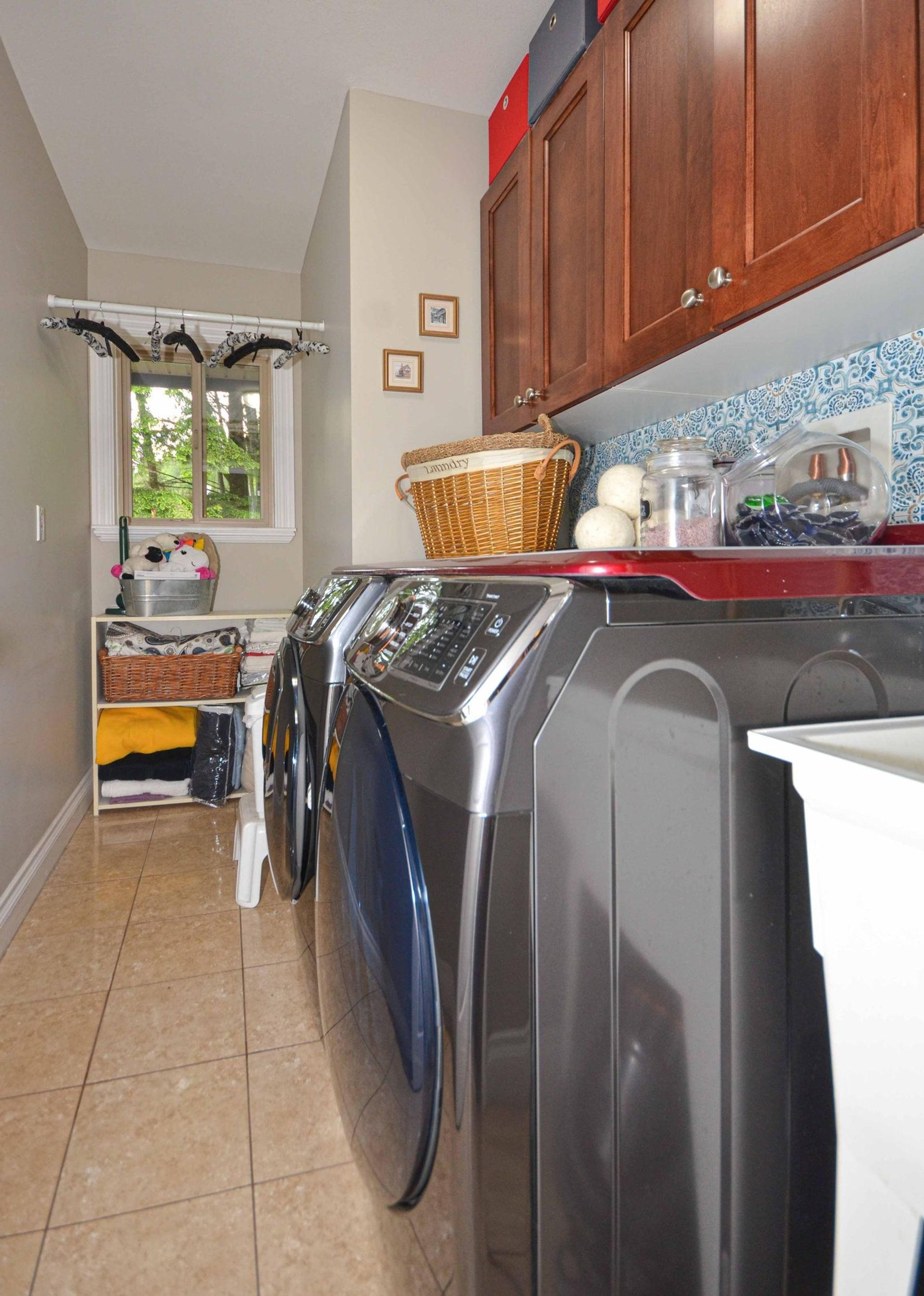 Ascending stairs with a designer style railing to the home’s upper level you are welcomed with plush carpeting, four bedrooms, a dedicated laundry room, and two washrooms. The master bedroom is a spacious suite style area ideal for unwinding after a long day. The main area is large enough to include a book nook. There is an extensive walk-in closet with a window, and a five piece ensuite with two sinks, an extra large vanity, an oversized soaker tub, and a dedicated shower. The tiled laundry room is conveniently located on the upper floor with a wash sink, storage, a window, and an area to hang clothes. The additional reasonably sized bedrooms and a four-piece bathroom complete this area of the home.