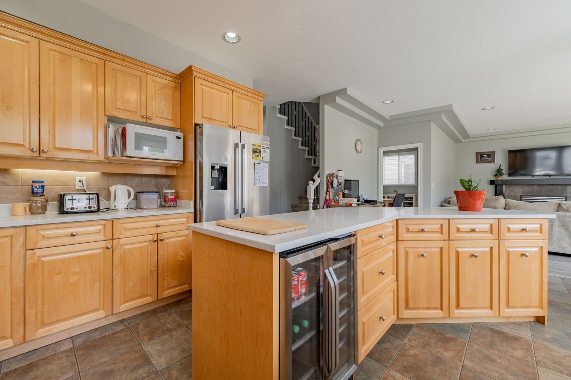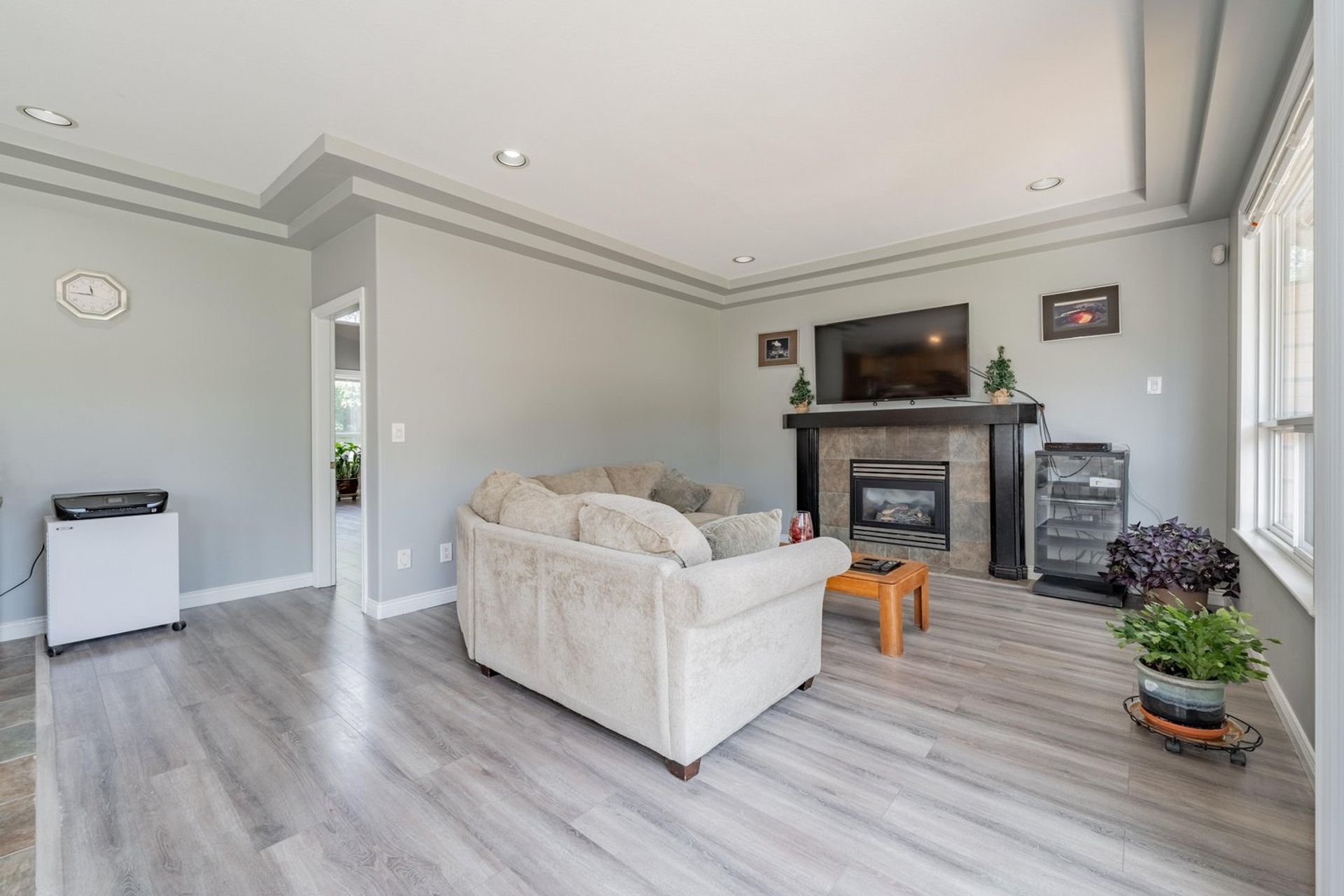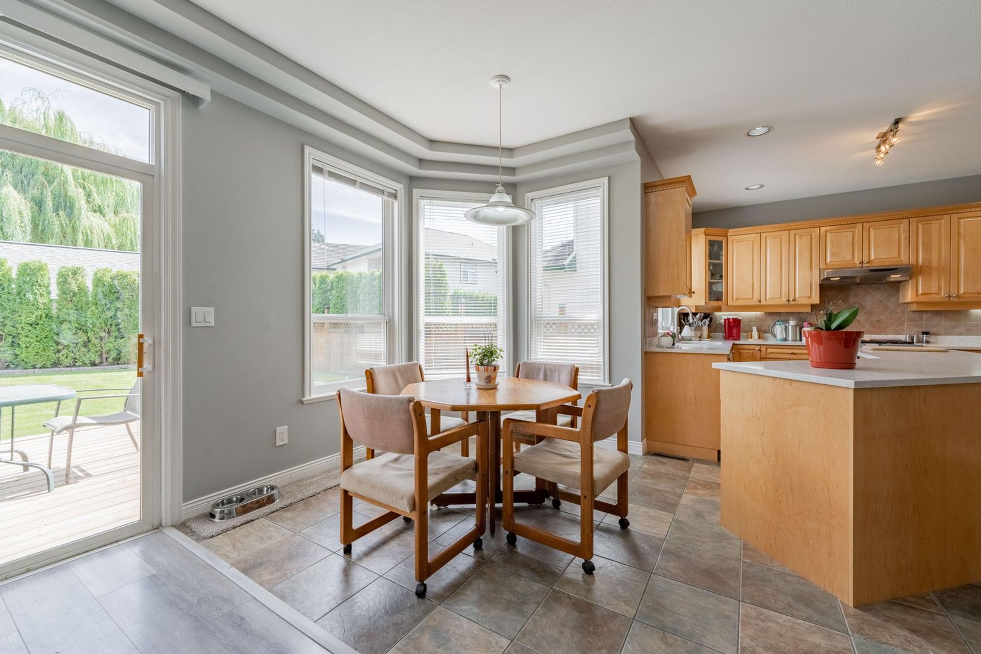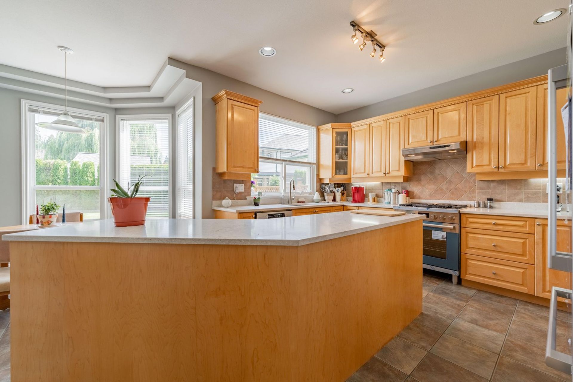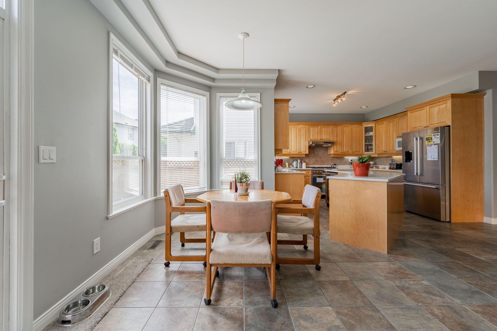 The kitchen features a large L-shaped island with built-in storage as well as a wine fridge. All stainless-steel appliances including a five-burner gas range, tiled backsplash, granite counters, and pot lights complete the gourmet inspired kitchen. A dedicated eating area with three large windows on to the home’s backyard floods the kitchen with light creating a fantastic sense of space. The eating area opens on to the home’s family room where there is a gas fireplace and a sliding glass door on to the back patio. Both the eating area and the family room have a decorative two-tiered accent ceiling.