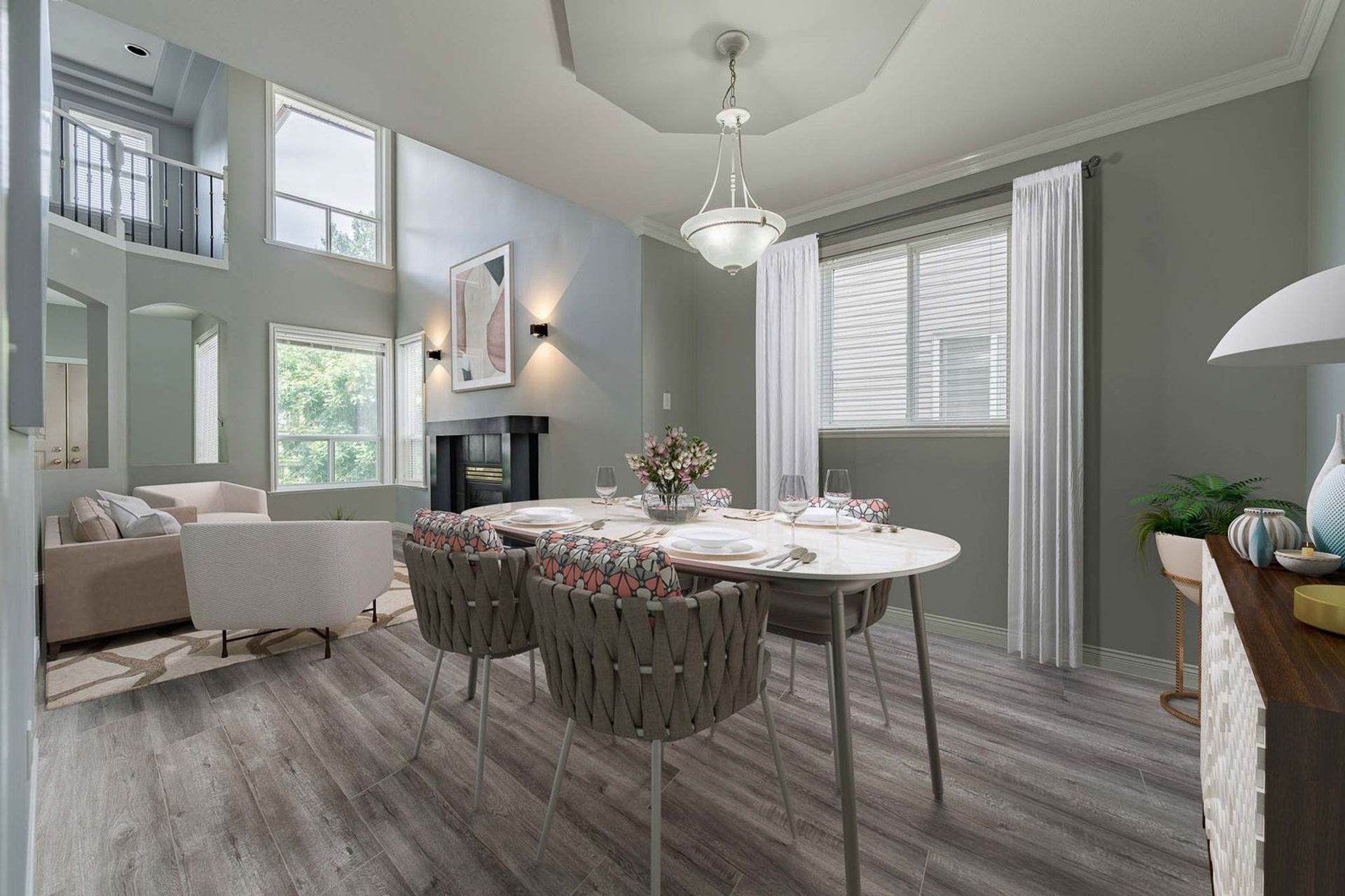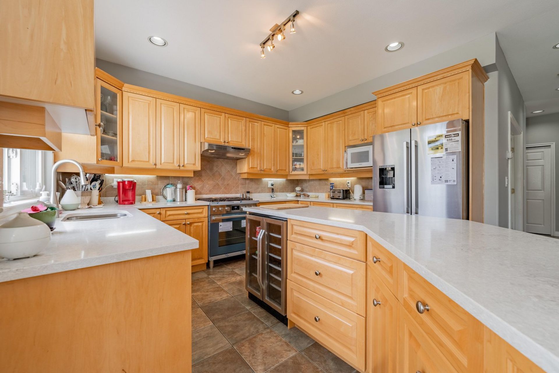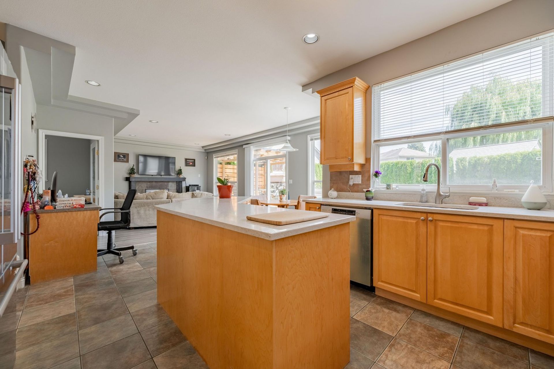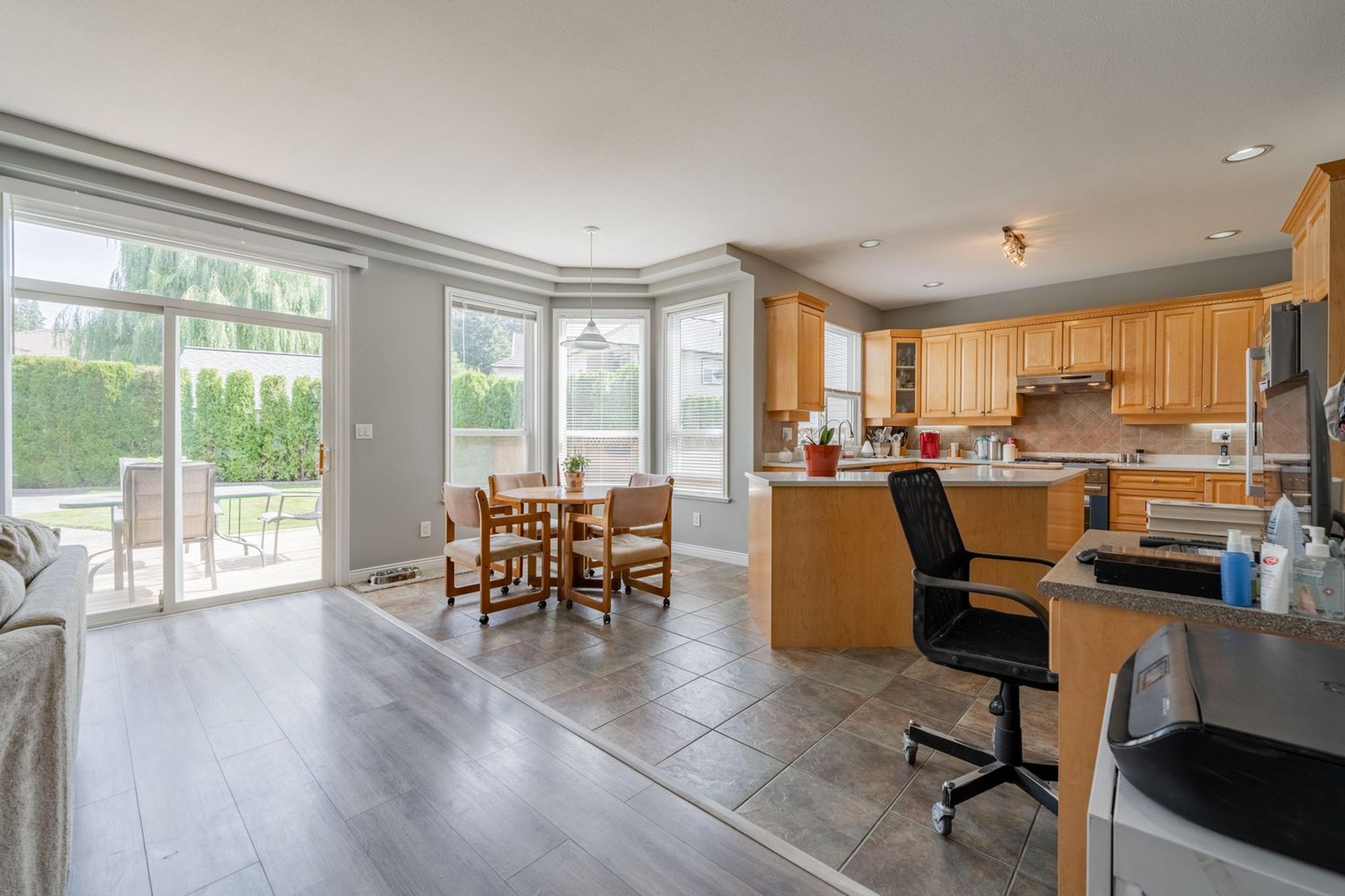 The kitchen features a large L-shaped island with built-in storage as well as a wine fridge. All stainless-steel appliances including a five-burner gas range, tiled backsplash, granite counters, and pot lights complete the gourmet inspired kitchen. A dedicated eating area with three large windows on to the home’s backyard floods the kitchen with light creating a fantastic sense of space. The eating area opens on to the home’s family room where there is a gas fireplace and a sliding glass door on to the back patio. Both the eating area and the family room have a decorative two-tiered accent ceiling.