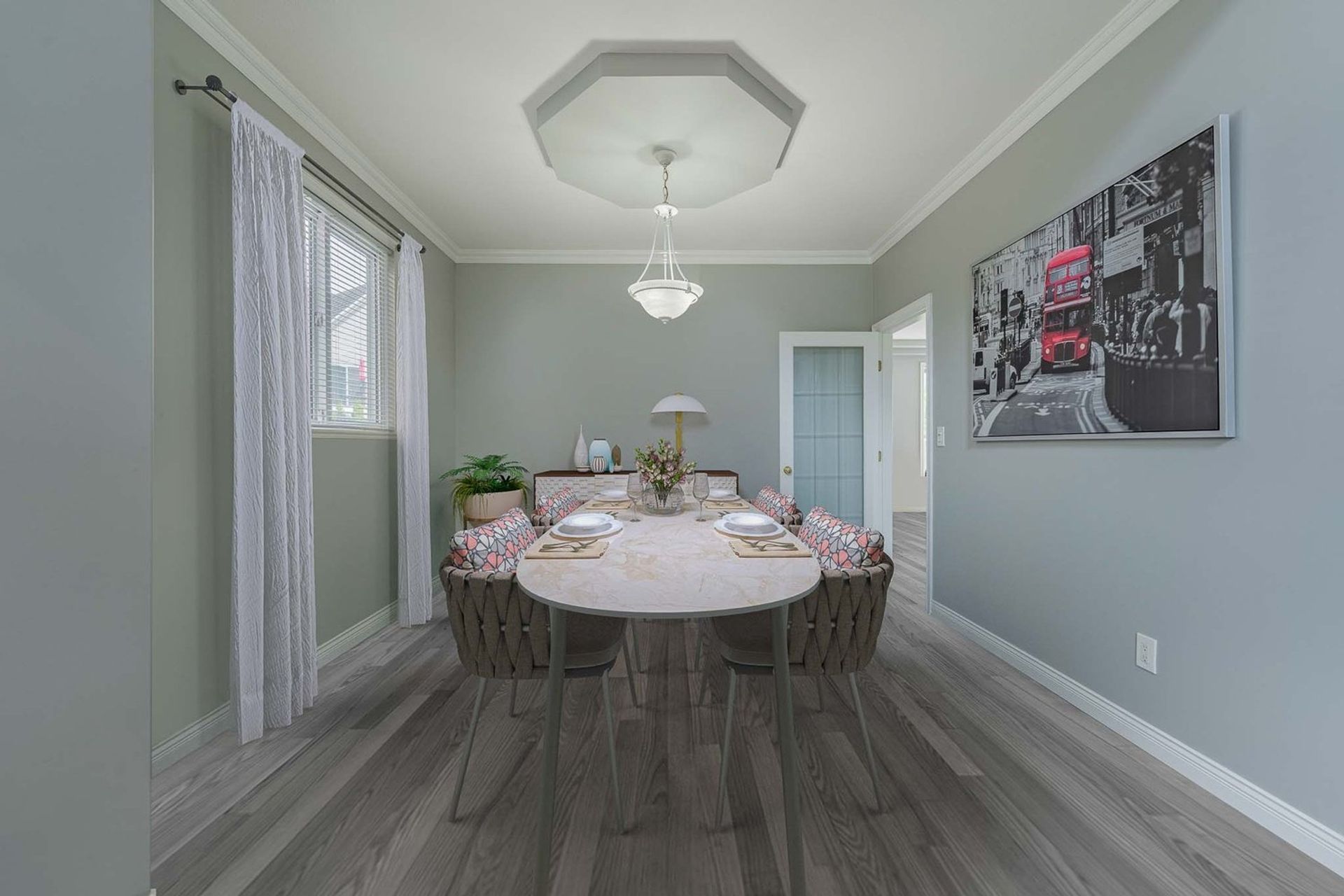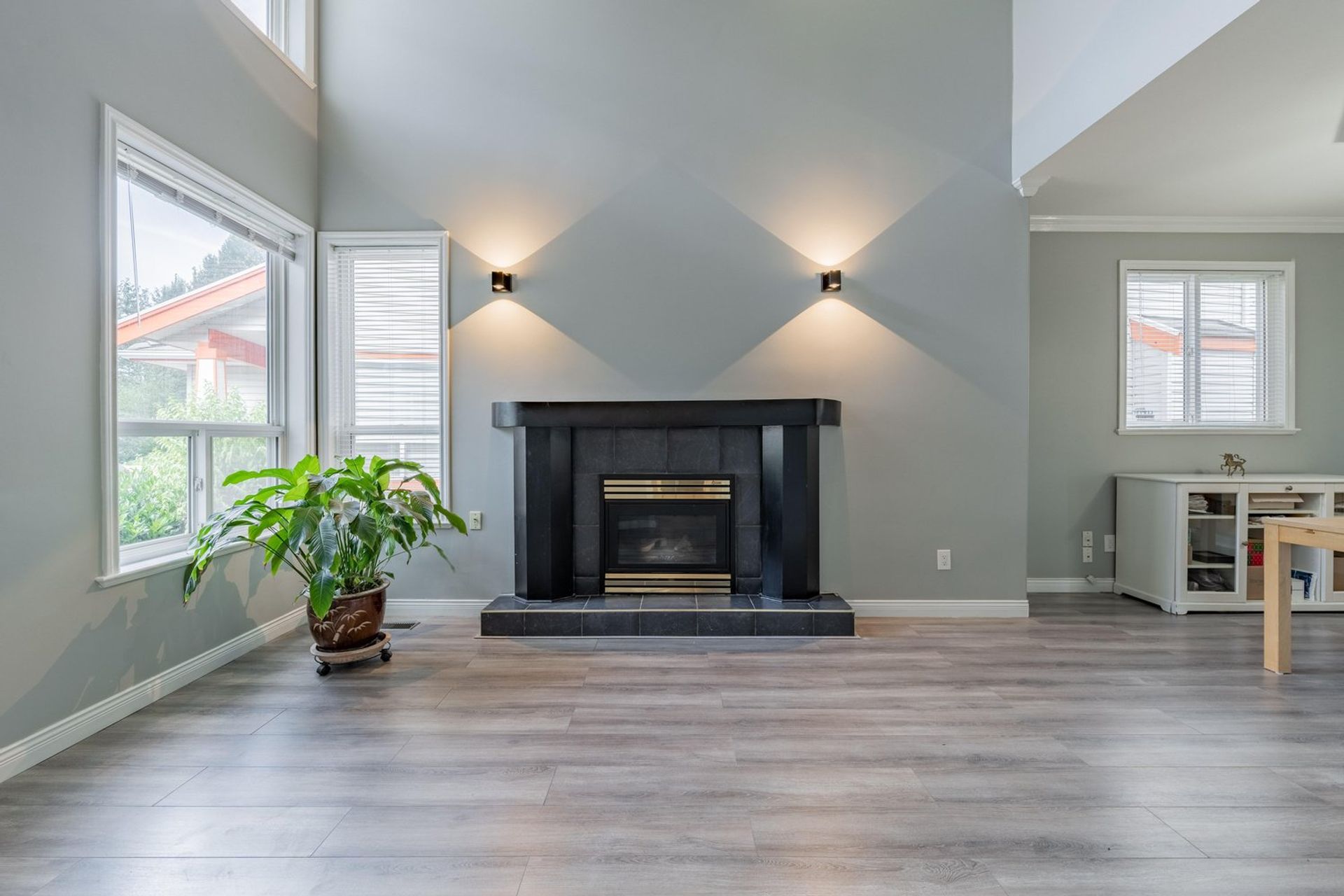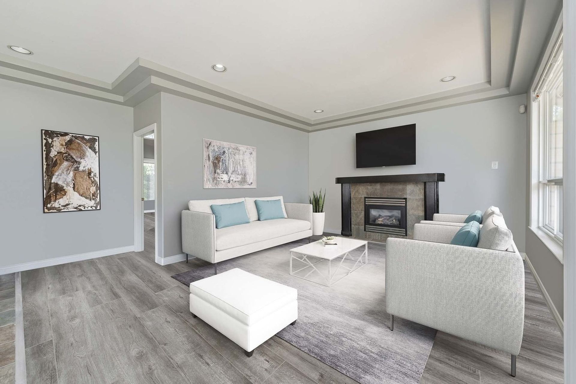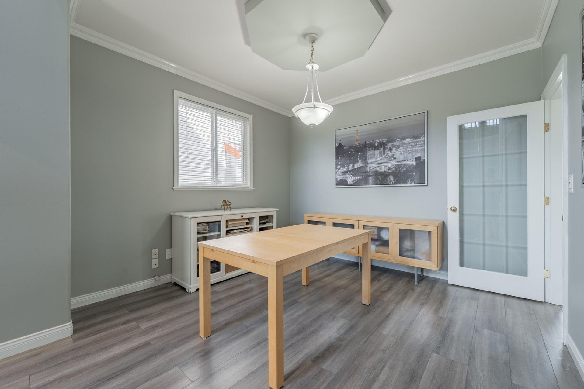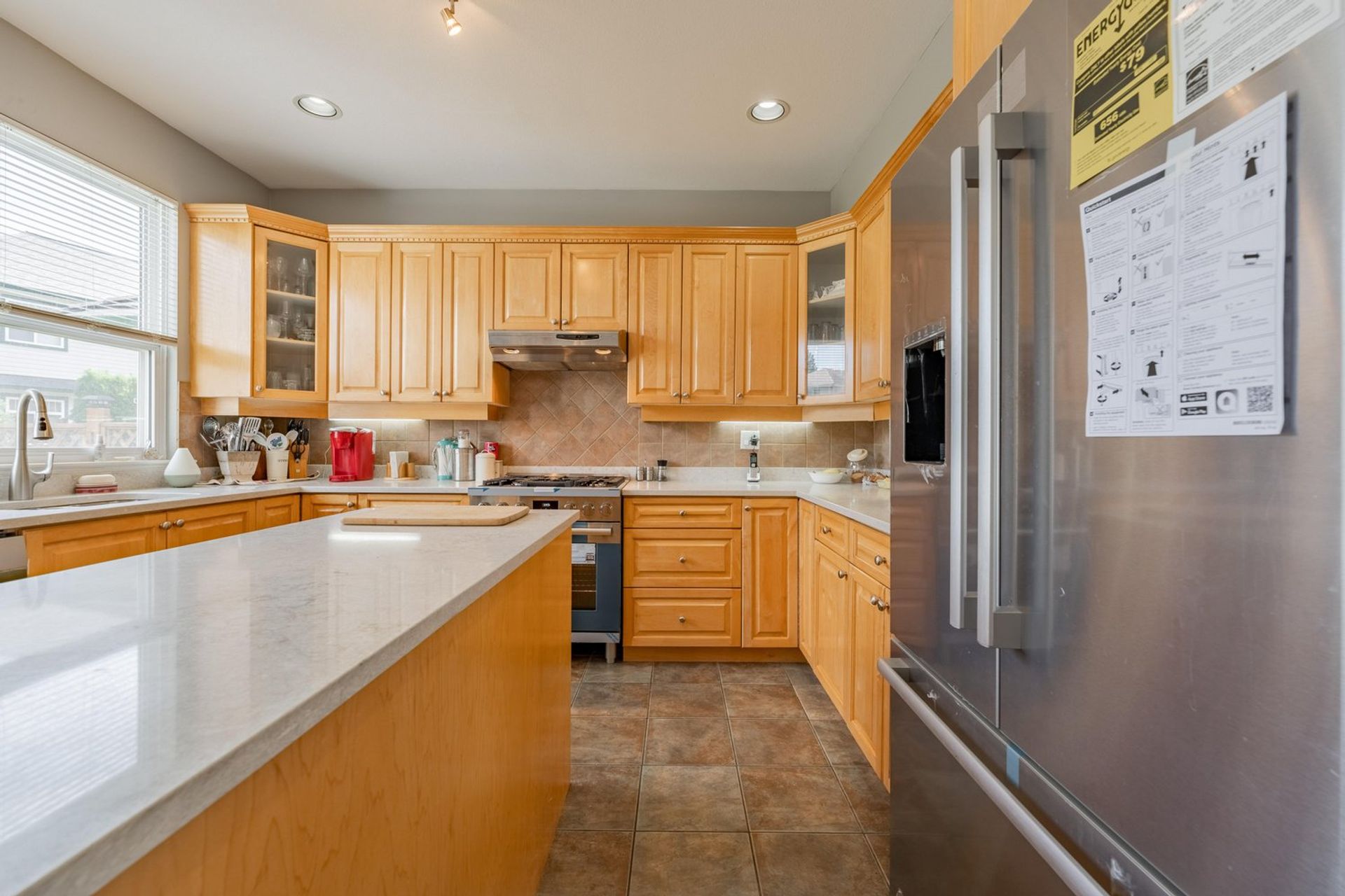 The kitchen features a large L-shaped island with built-in storage as well as a wine fridge. All stainless-steel appliances including a five-burner gas range, tiled backsplash, granite counters, and pot lights complete the gourmet inspired kitchen. A dedicated eating area with three large windows on to the home’s backyard floods the kitchen with light creating a fantastic sense of space. The eating area opens on to the home’s family room where there is a gas fireplace and a sliding glass door on to the back patio. Both the eating area and the family room have a decorative two-tiered accent ceiling.