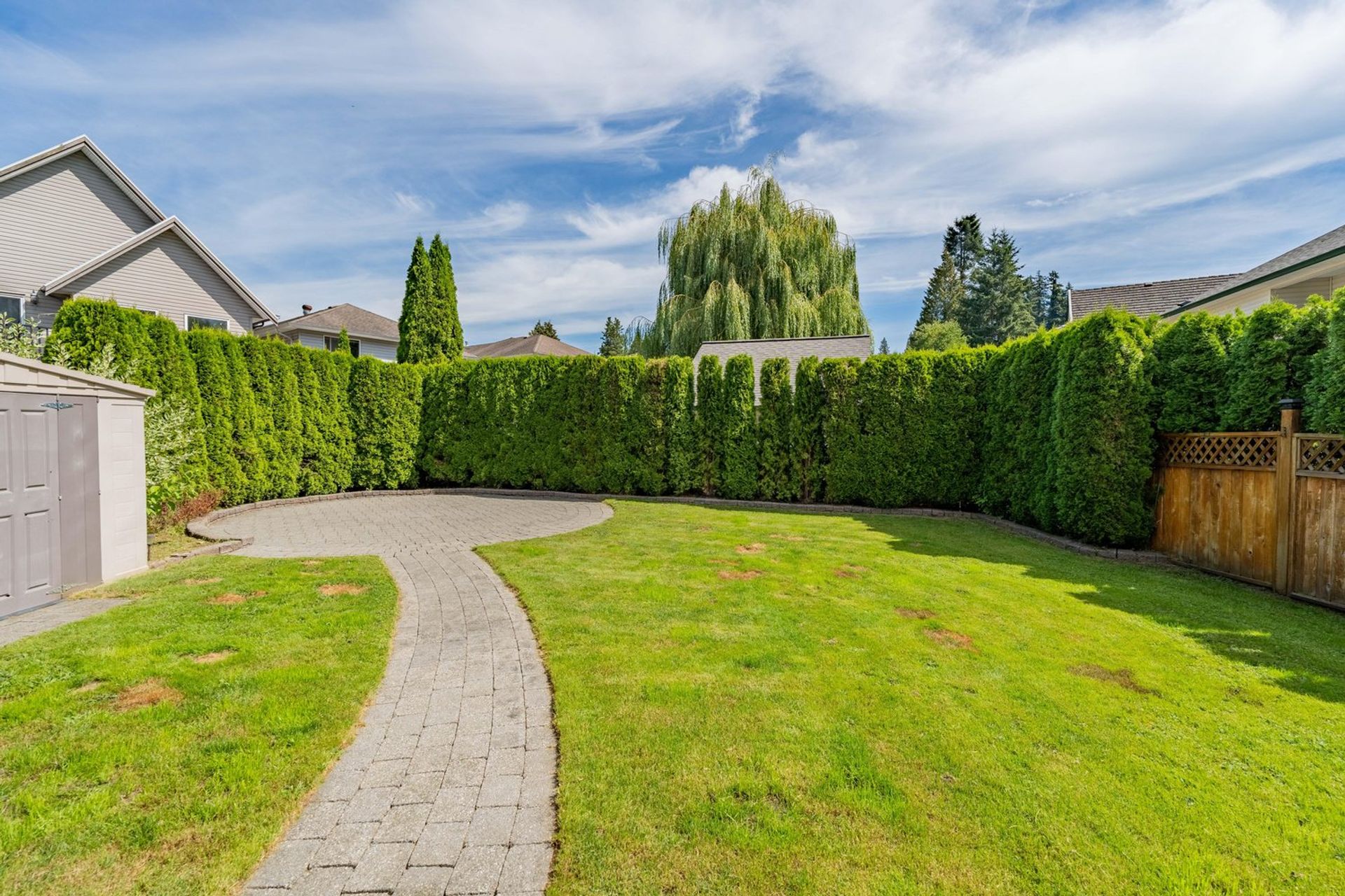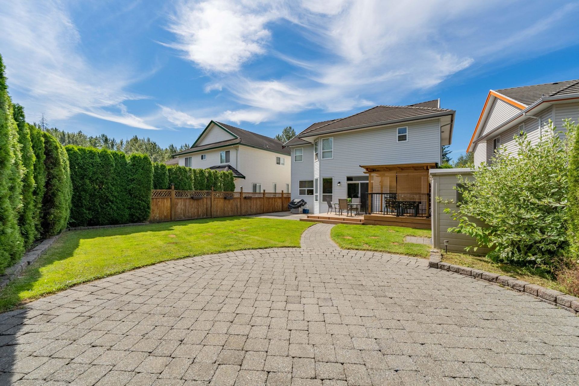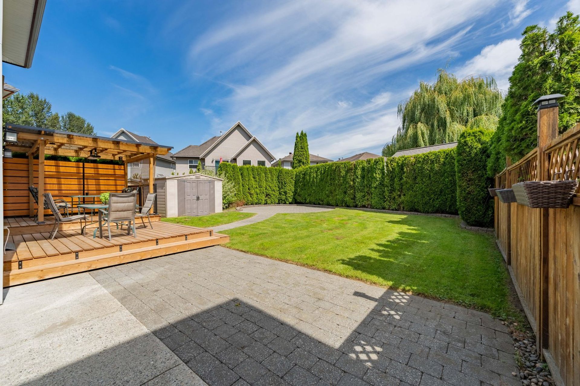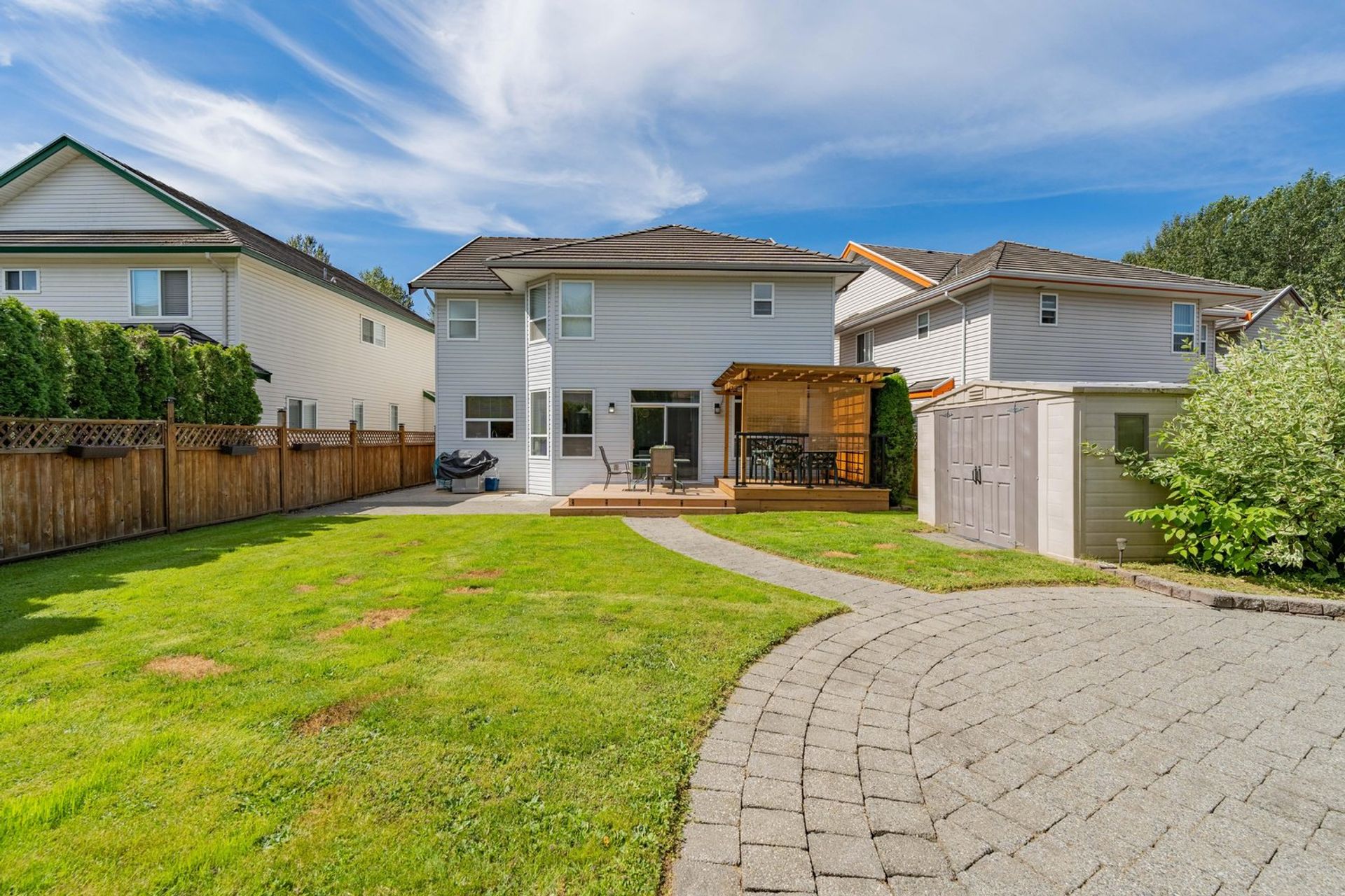 The home’s backyard is pristine with a newly renovated raised, covered, wooden patio area featuring a privacy wall and heating—perfect for year-round use. There are also two other patio areas with a paving stone walkway connecting the two and a storage shed. The yard is completely fenced, easy to maintain, and has access on either side of the home. The house is complete with a two car garage, a built-in vacuum system, and a massive crawl space ideal for storage.