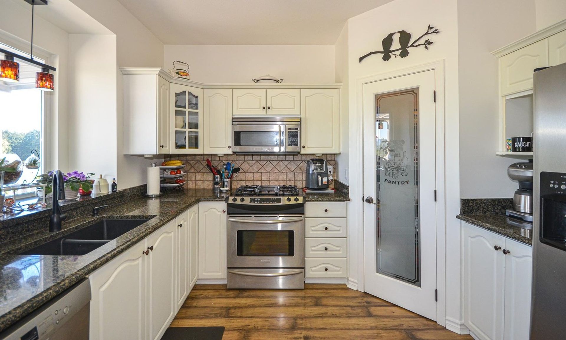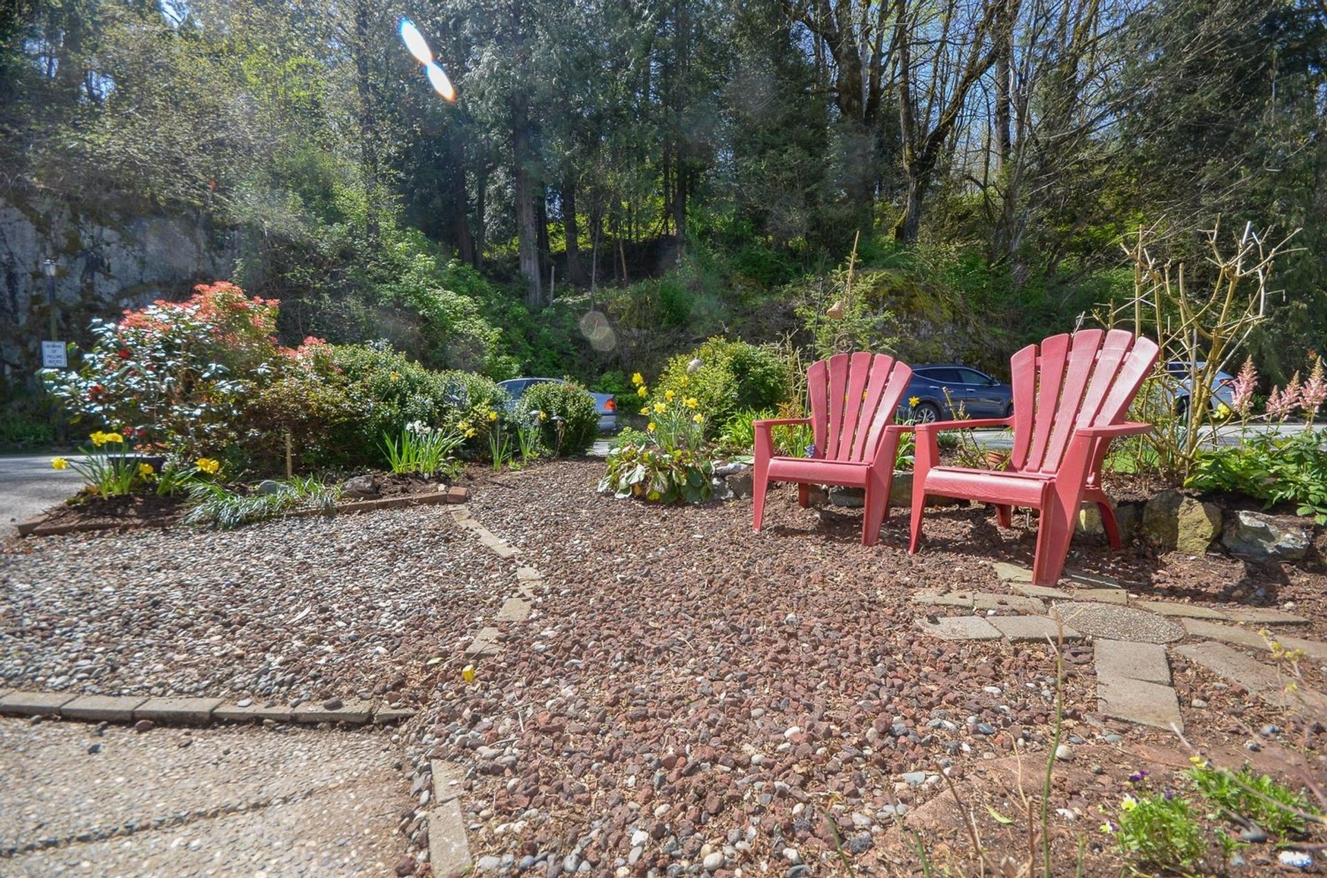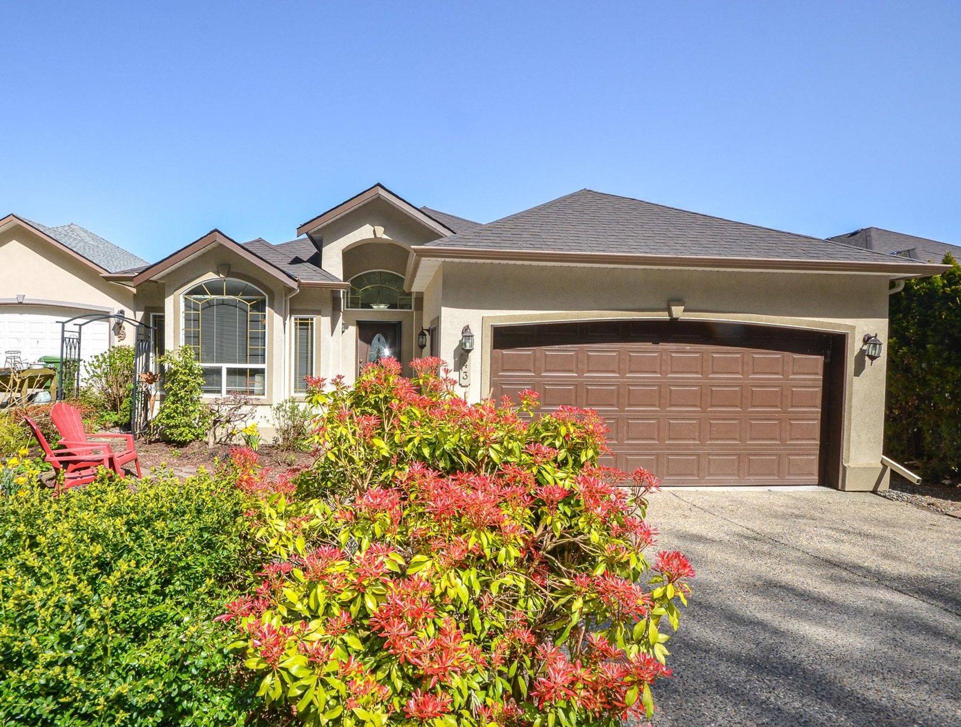 The kitchen has a gas range, a built-in microwave, a deep double sink with a stellar view, a French door fridge, and a dedicated pantry. It is open to an eating area which has a sliding glass door onto a covered back deck with enough space for a BBQ and sitting area. The living room and dining room have eleven-foot vaulted ceilings, a gas fireplace, and large centralized windows to accentuate the view. There are two bedrooms on the main floor including the primary bedroom with a sizable walk-in closet and a three-piece ensuite; the secondary bedroom is flush with natural light and features a reading nook. Main level is complete with a laundry room and access to the home's double garage.