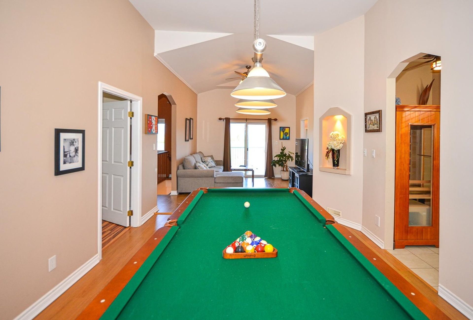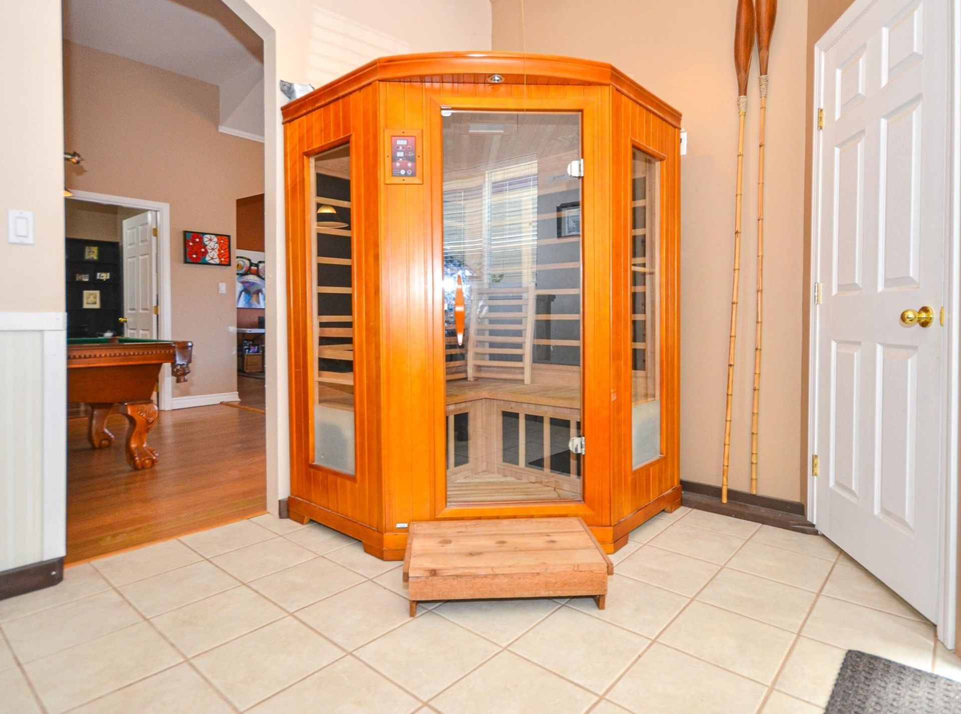 The lower level is a spacious 1266 square feet. Coming down from the main floor you enter into a gym area with a sauna; this area has an outdoor entrance and attaches to a mud room which holds the potential to be converted to a laundry room should you choose to suite the home. The focal point of this level is a 333 square foot recreation room which runs the length of the entire floor and ends with sliding glass doors to another covered deck with a view. There is also a bedroom, an office, a dedicated storage area, and a four-piece washroom on the lower level. Heading down from the office there is an unfinished basement. This level has three separate areas including a roughed-in bar; the ceiling height is six feet eight inches, and two of the three areas have decent sized windows for natural light.