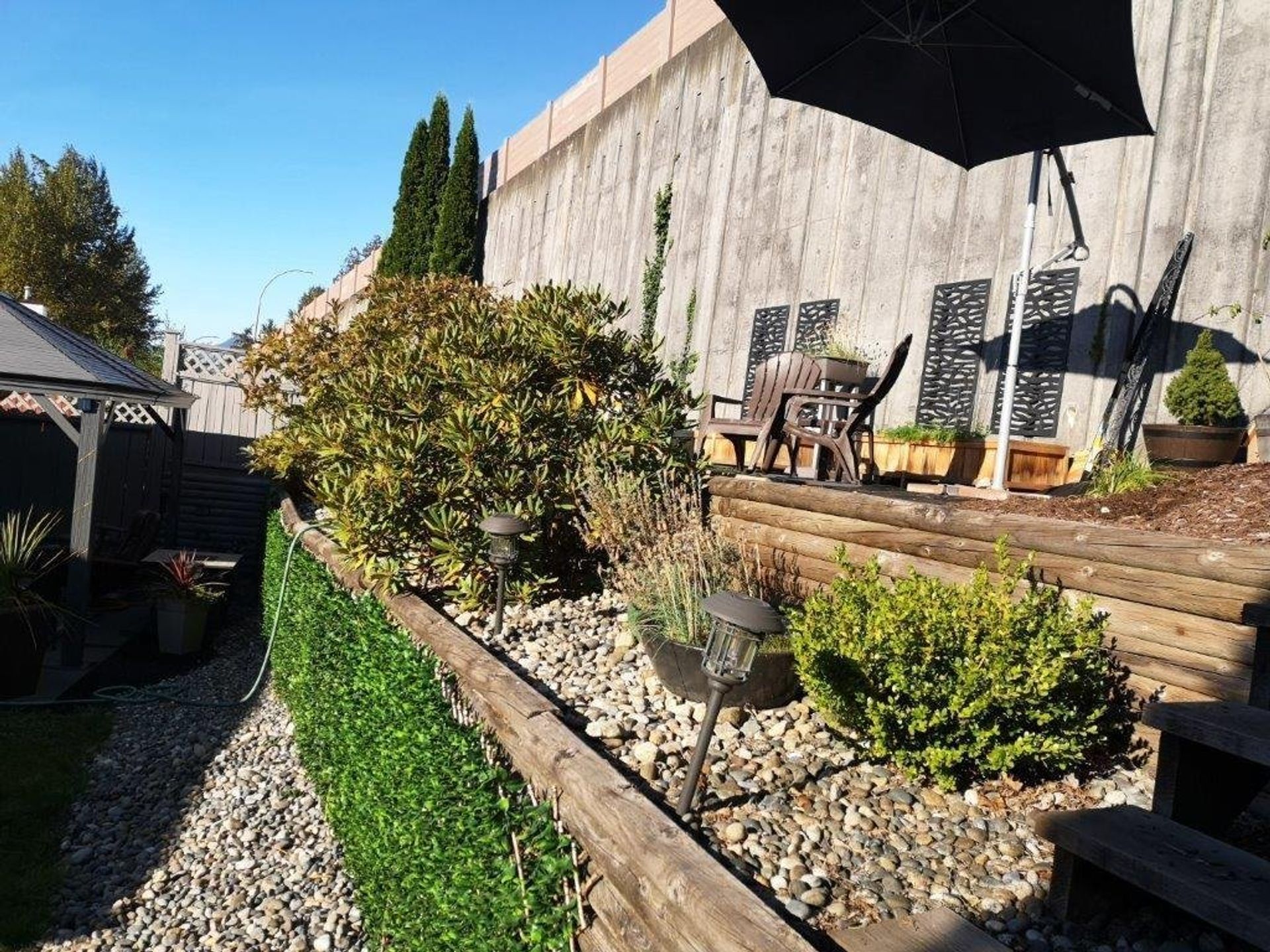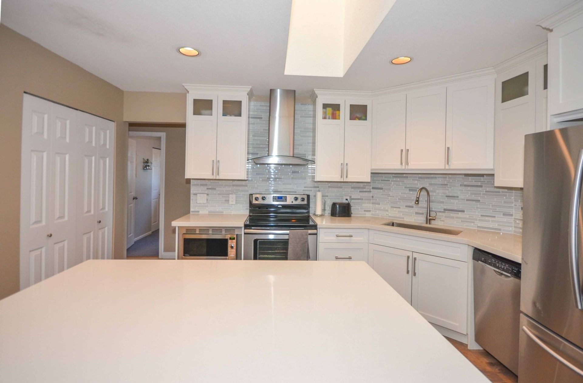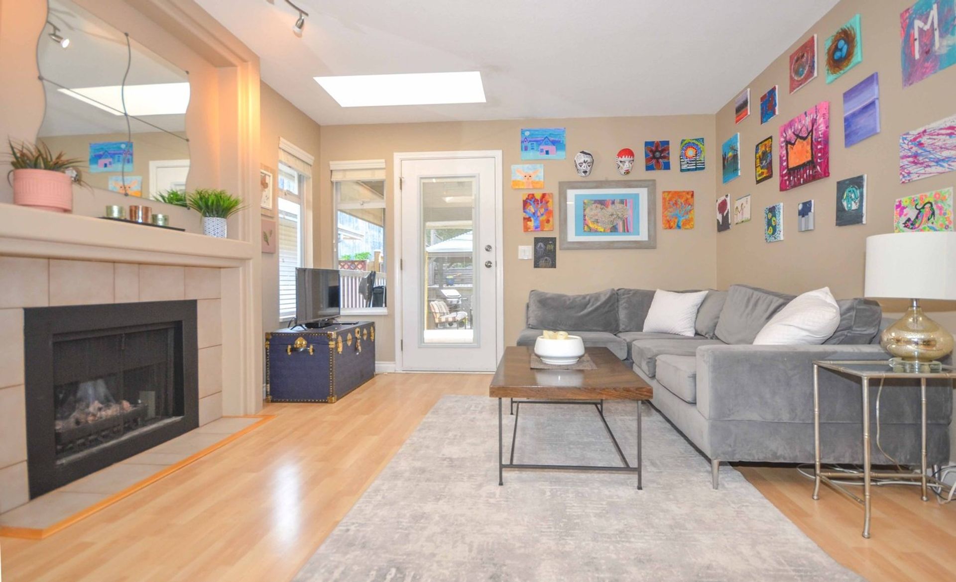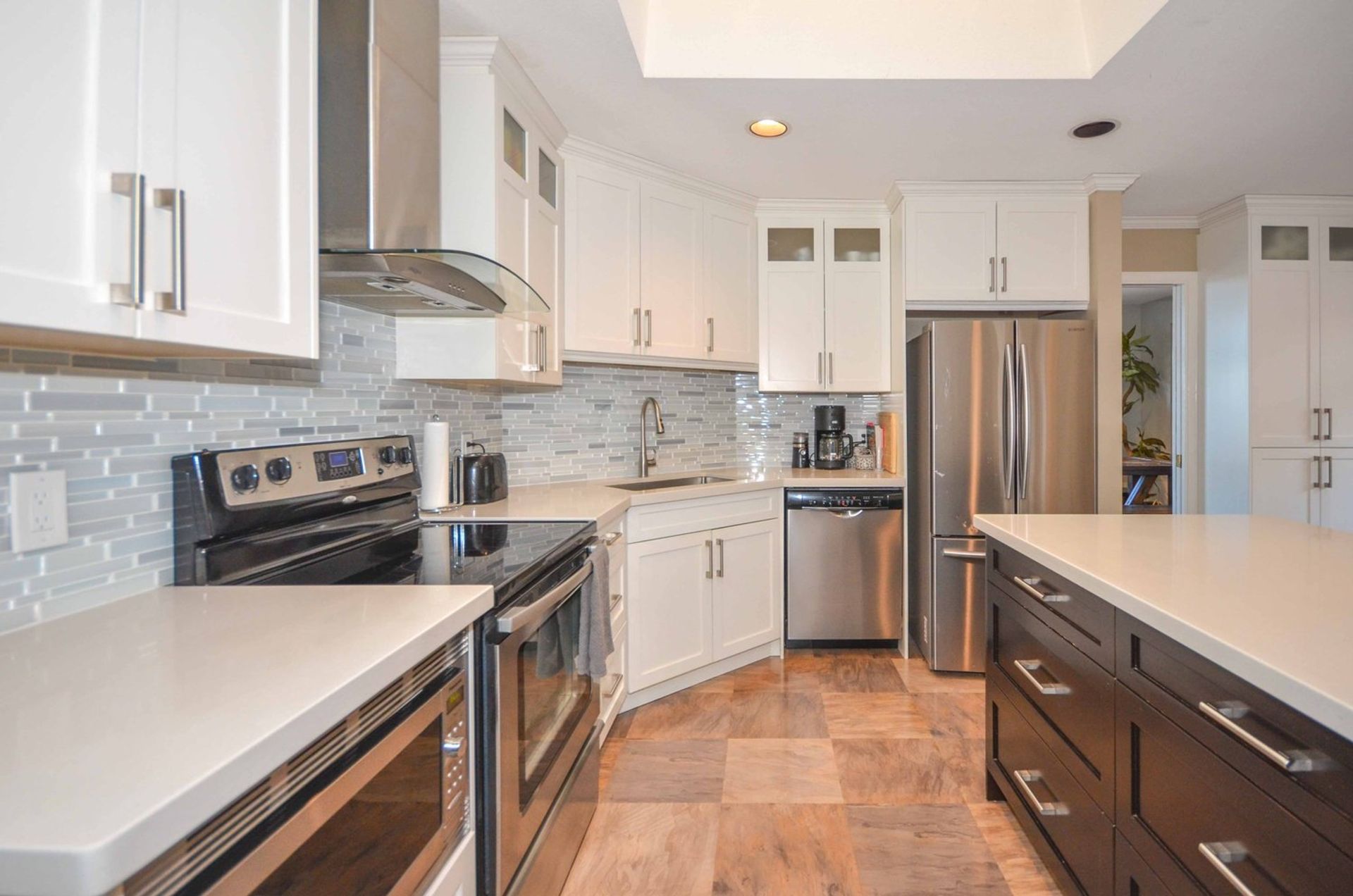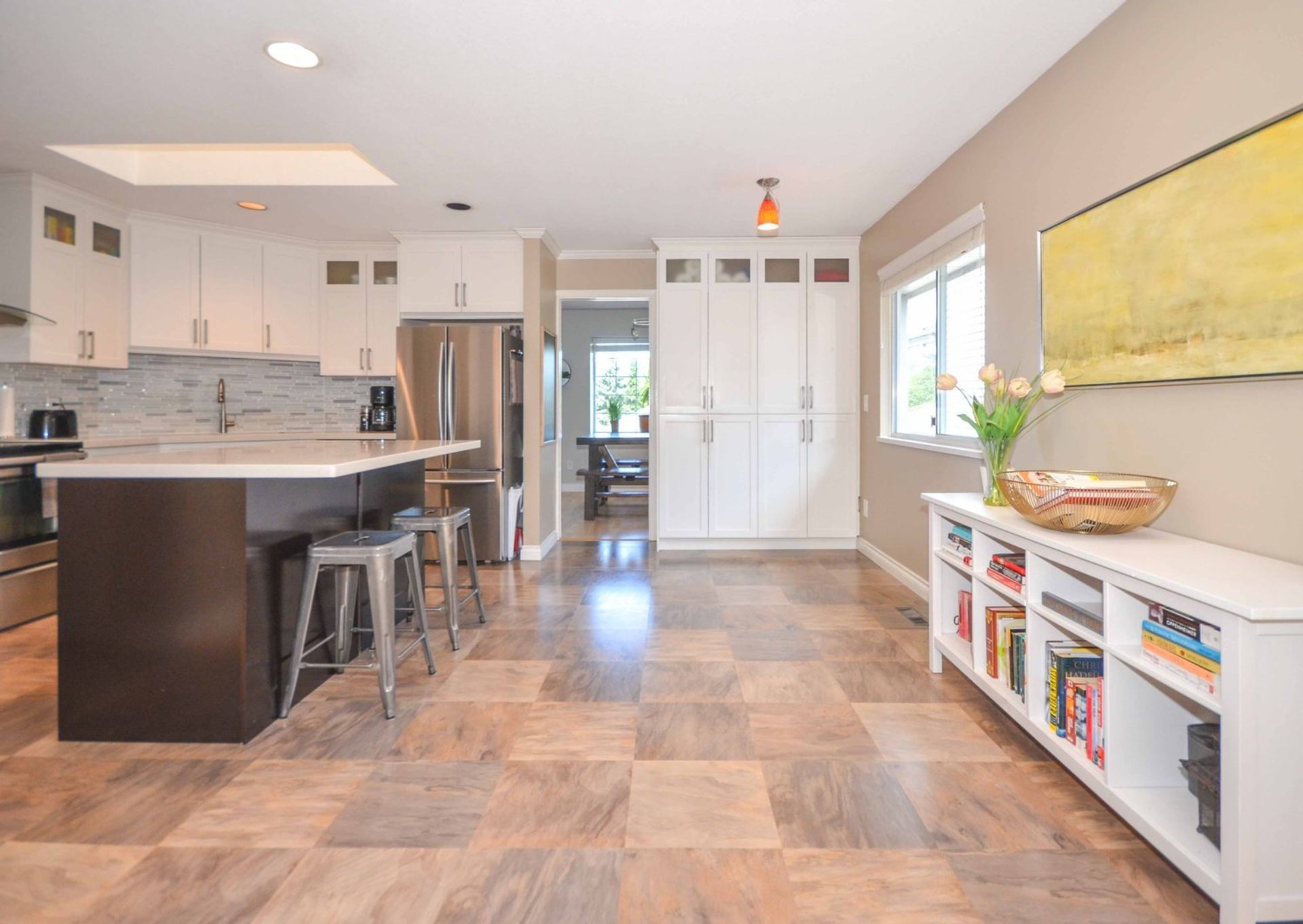 The home’s main level has an updated kitchen that includes all stainless-steel appliances, an island with an eating bar, a built-in microwave, all soft close cabinetry, additional wall sized, pantry style storage, and a tile backsplash. The eat-in kitchen is open to a family room with a gas fireplace, and access to the home’s back covered deck; there are three skylights in the kitchen/family room providing fantastic natural light. There is more than enough space on the deck for a full BBQ/patio setup and the backyard has a patio area as well as a tiered garden. Dining room and living room are open to one another creating a great space to entertain with friends and family. There is a nook area inlaid in the dining room and it is spacious enough for formal dining room furniture. The living room has vaulted ceilings and large windows making it feel open and welcoming.