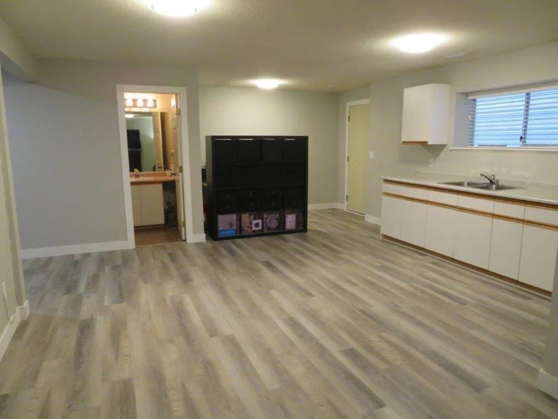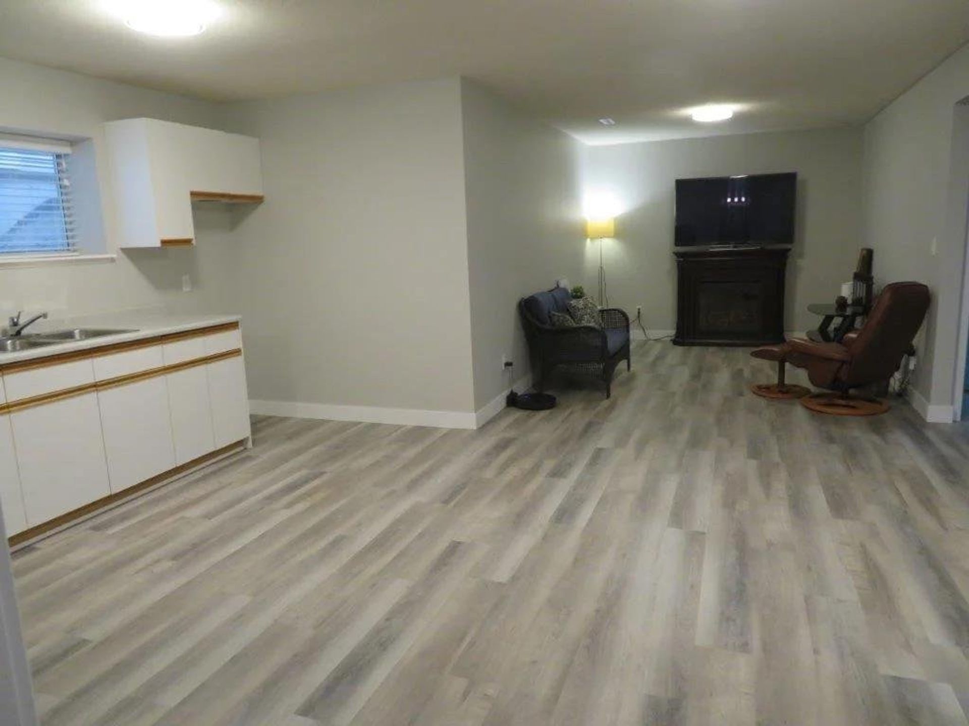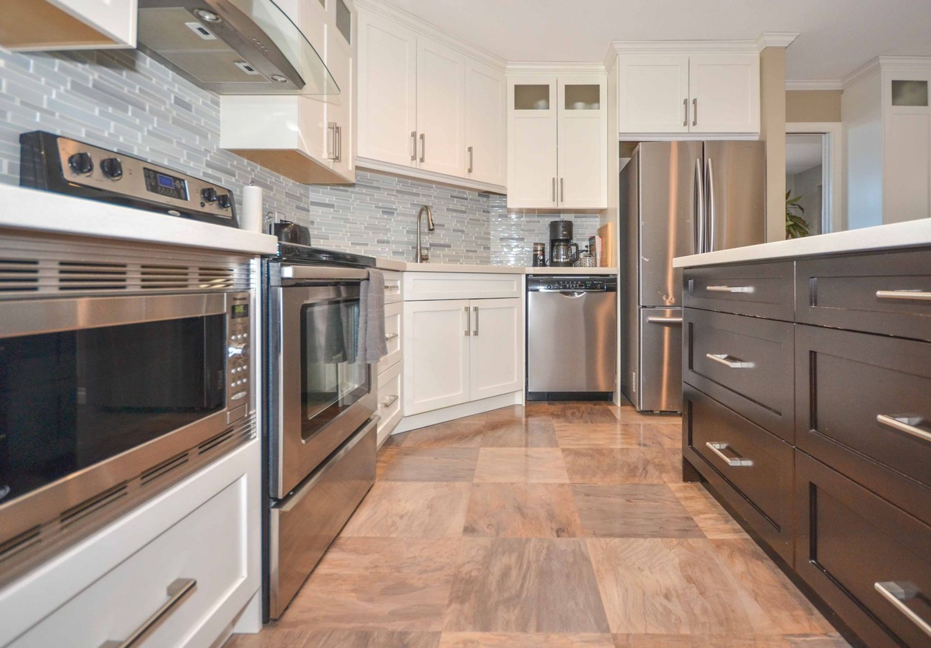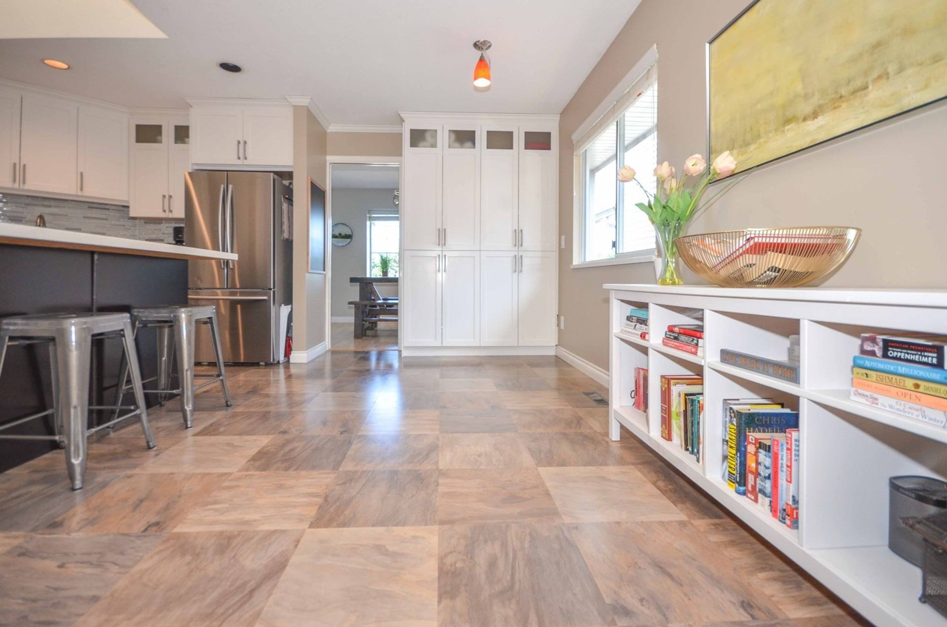 Downstairs there is a shared laundry area with a wash sink that acts as an adjoining room to the suite. The two-bedroom suite has a separate entrance on the side of the home. Kitchen, eating area, and living room are all open to one another giving the suite a modern feel. Two bedrooms, a four-piece washroom, and a sizable foyer, currently used as a workspace, complete the home's suite. The home’s double garage has a high ceiling and built-in storage.