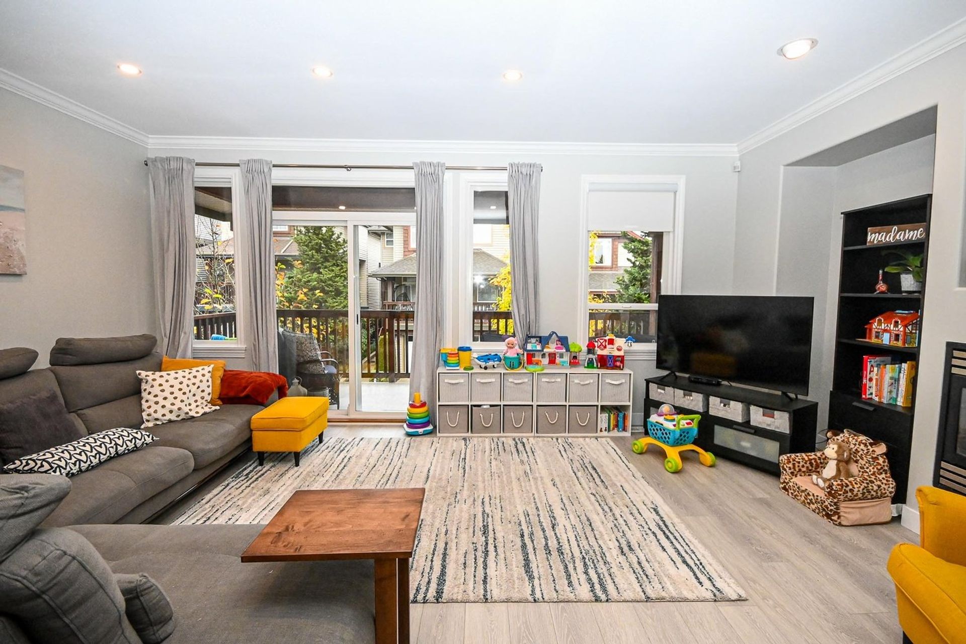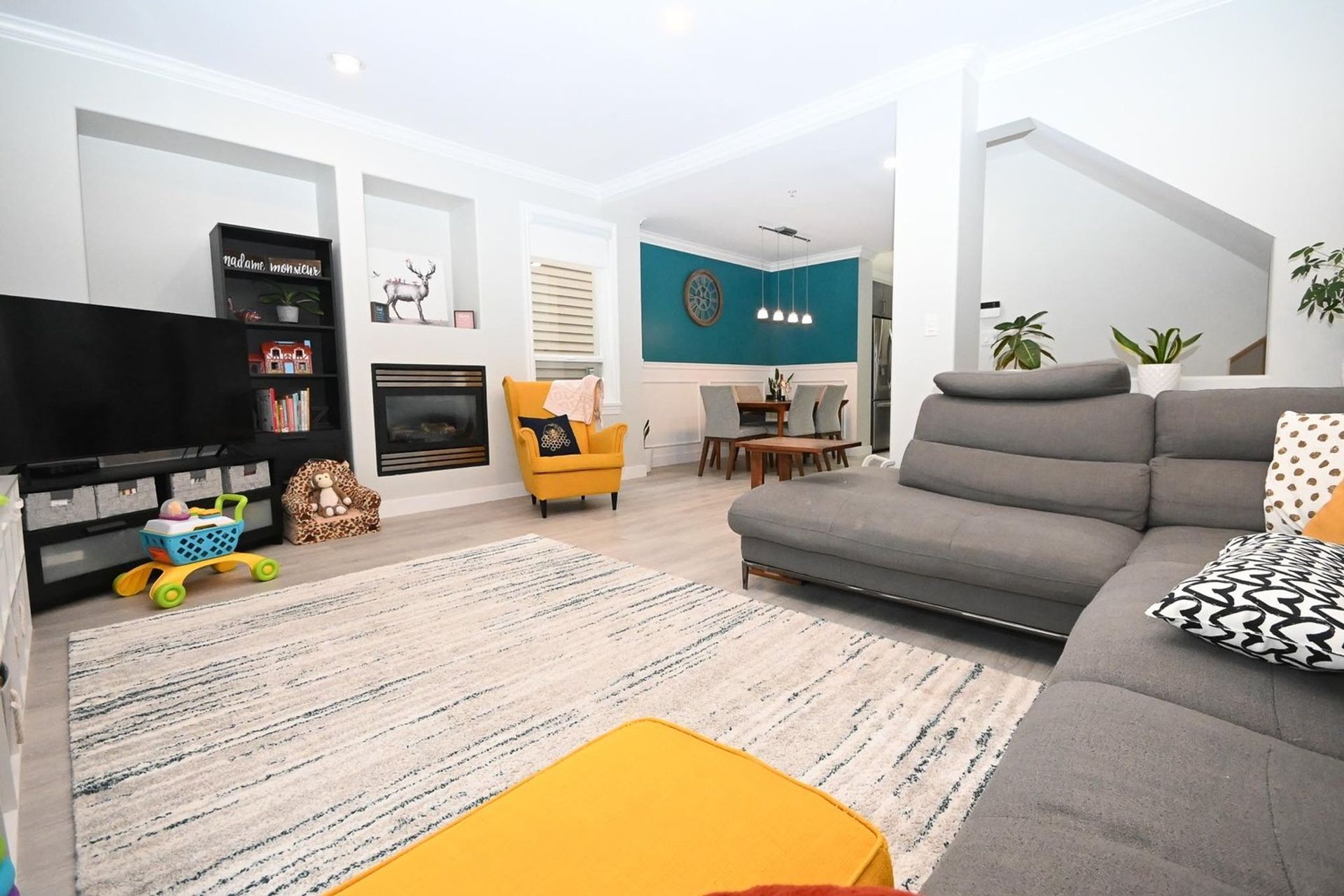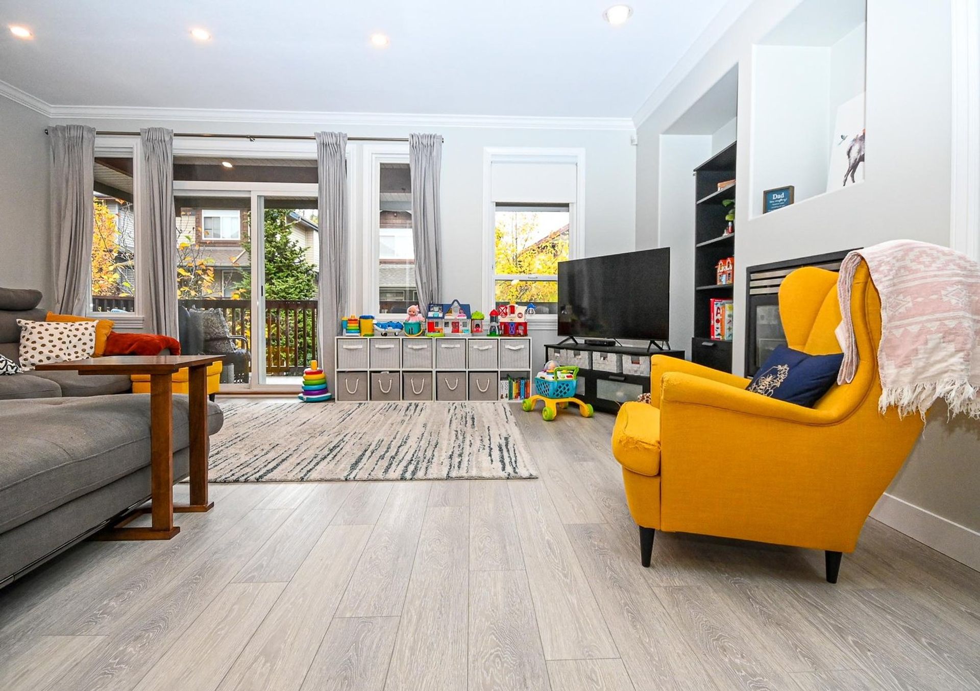 The dining room has wainscotting and a lovely accent wall; it is open to both the kitchen and the living room. With a gas fireplace, glass sliding doors to a large front covered deck (with enough space for a full year-round patio setup), a recessed storage area, and new lighting; the living room is ready to serve all your entertaining needs. The main level also has crown moulding throughout, and new vinyl plank flooring (the floor was leveled before installed). For convenience, there is also an updated two-piece powder room on the main.