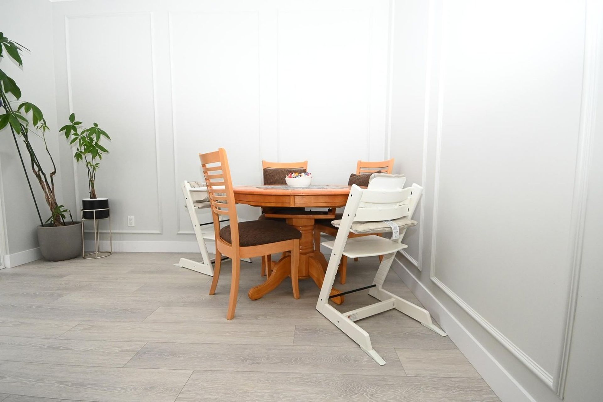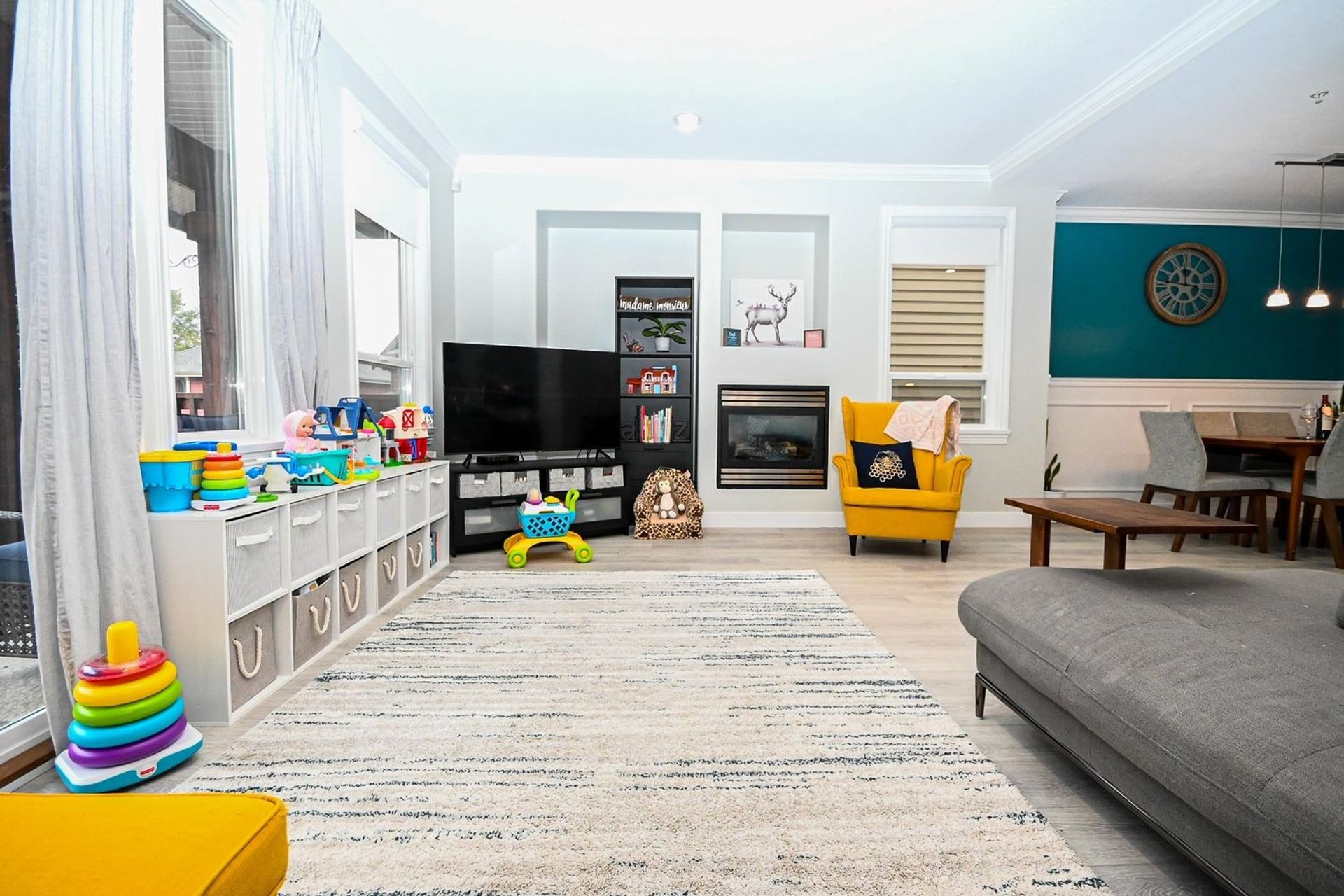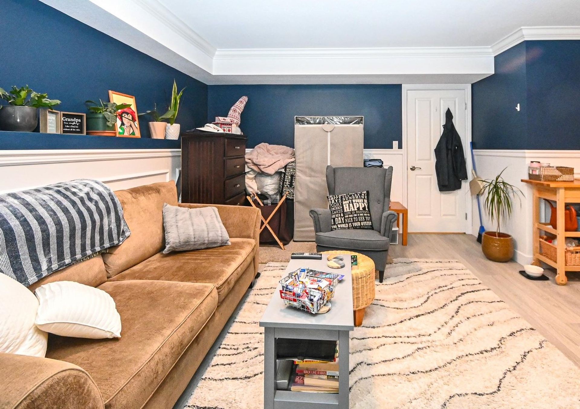 The dining room has wainscotting and a lovely accent wall; it is open to both the kitchen and the living room. With a gas fireplace, glass sliding doors to a large front covered deck (with enough space for a full year-round patio setup), a recessed storage area, and new lighting; the living room is ready to serve all your entertaining needs. The main level also has crown moulding throughout, and new vinyl plank flooring (the floor was leveled before installed). For convenience, there is also an updated two-piece powder room on the main.