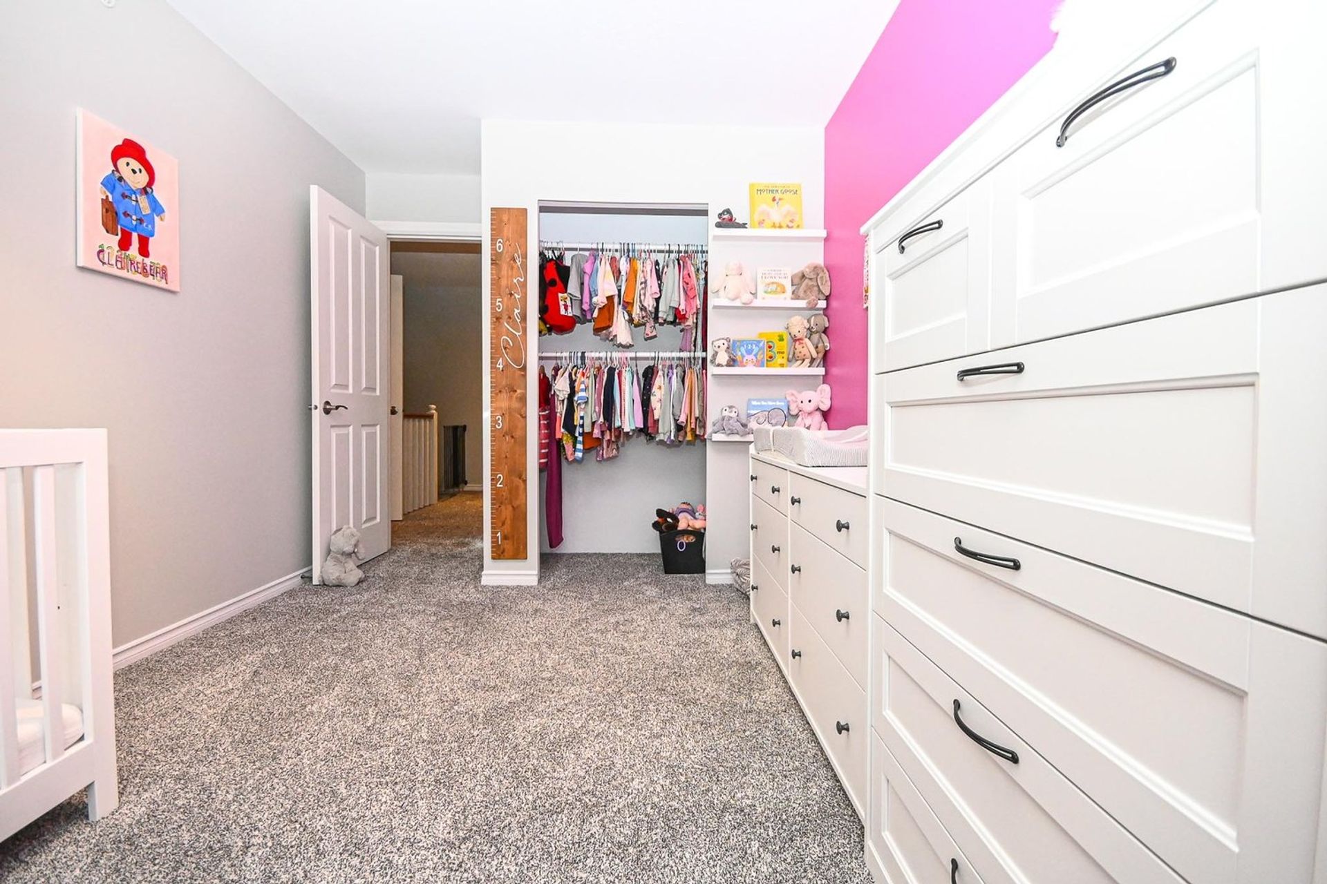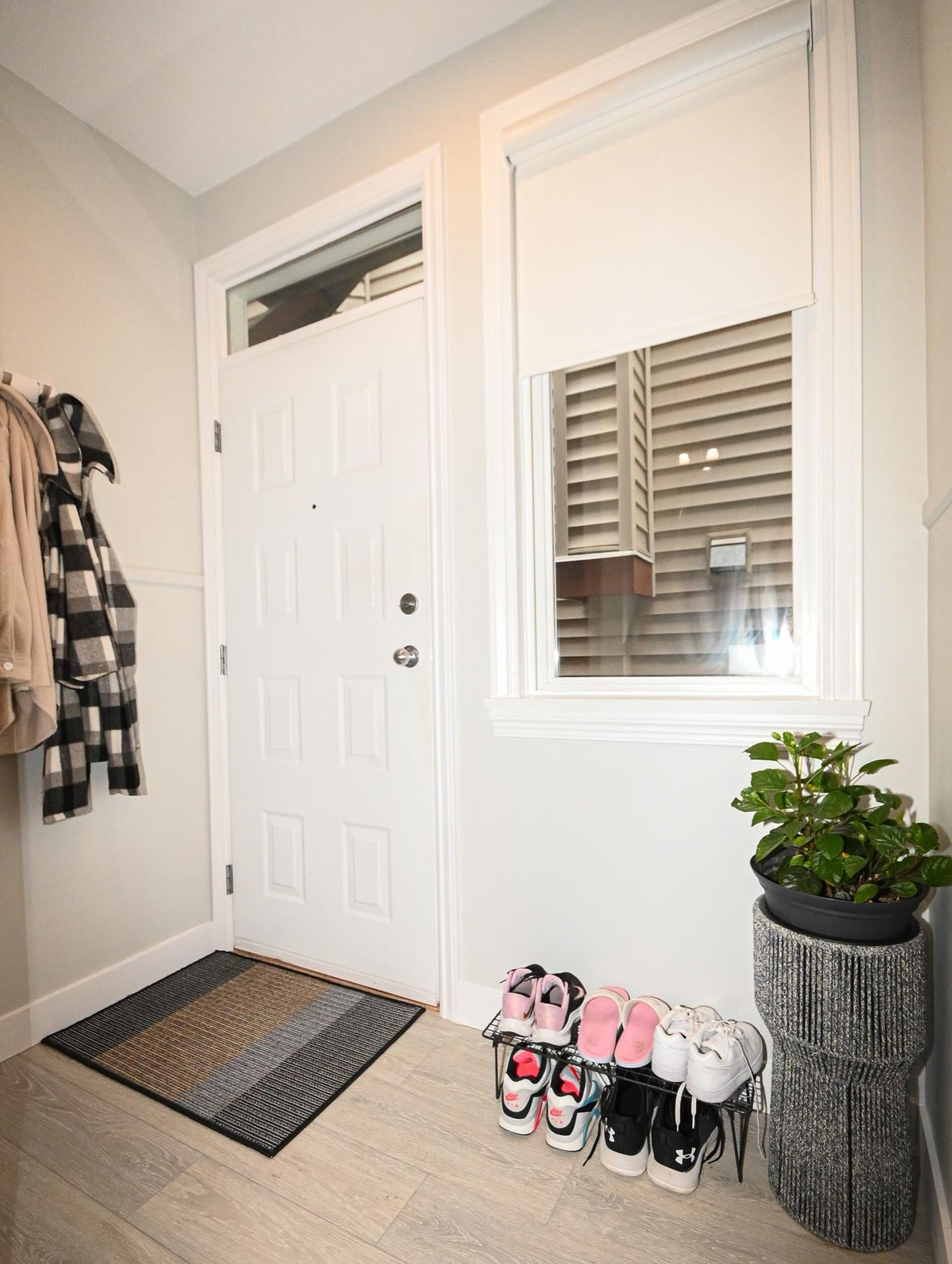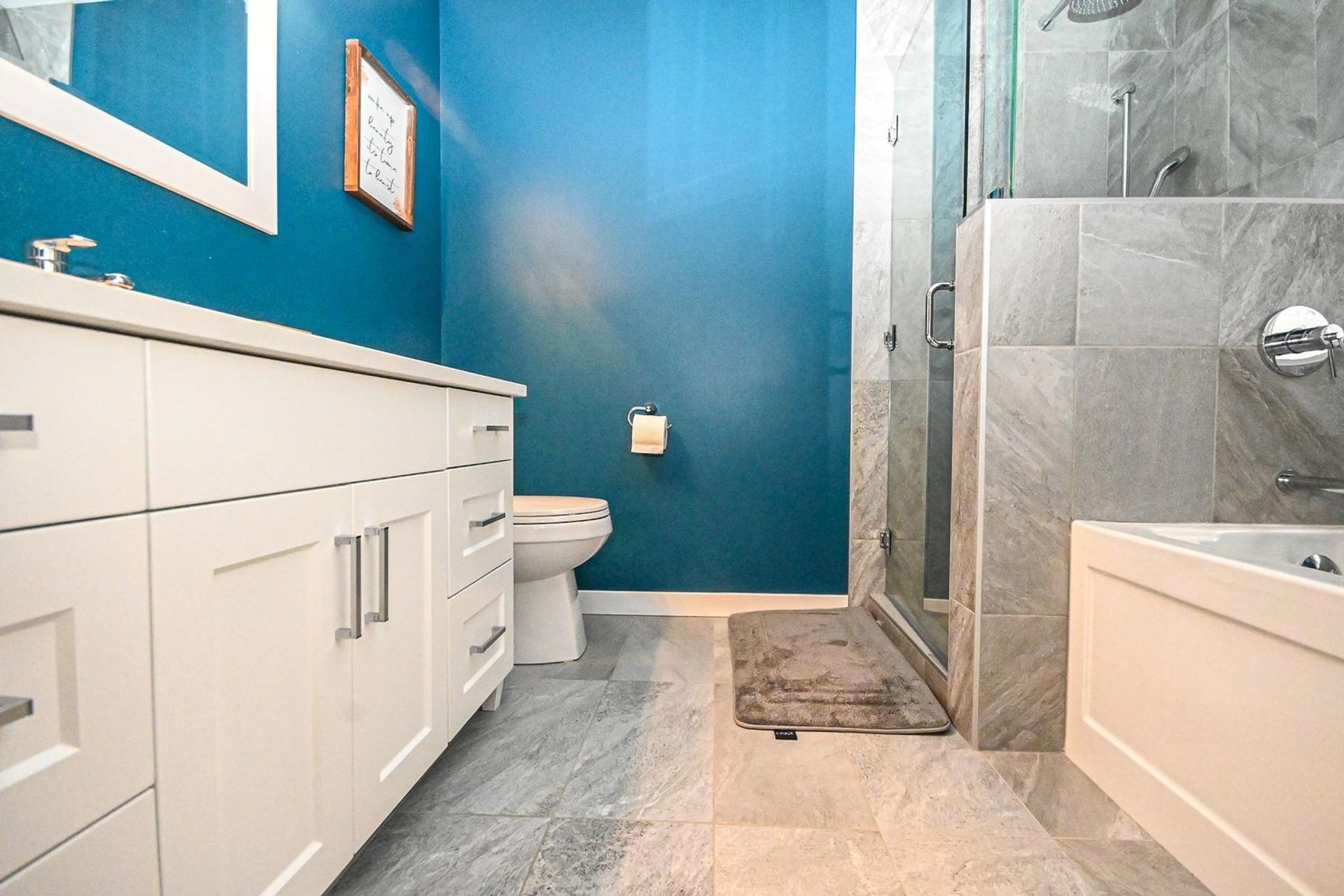 As you progress to the upper level there is a mid way landing featuring a custom built-in organizer meant to maximize the home's storage space. There are three bedrooms, two bathrooms, and updated carpeting (also on the stairs) on the upper floor. The primary bedroom is oversized with a walk-in closet, a new built-in organizer, and a stunning ensuite. Ensuite updates include: custom vanity with White Shimmer granite counters, soft close cabinets and floor lighting, a tiled shower with custom glass & Riobel Chrome Kit hand held sprayer/rain shower head, a new soaker tub, toilet, & updated subway tile flooring with radiant heating. There are new cordless roller shades throughout the entire home, and in the primary bedroom there is a specialty dual blind system with Tender Pewter blackout blinds layered under a fir 7% white blind designed to maintain light in the room while ensuring privacy.