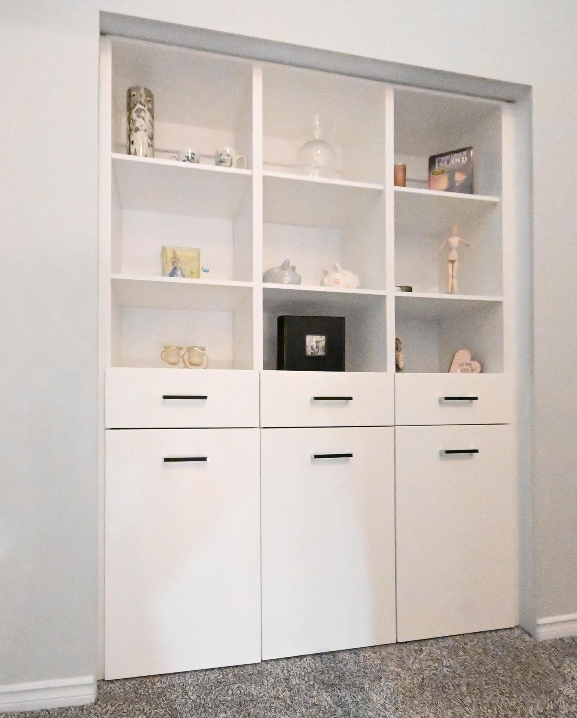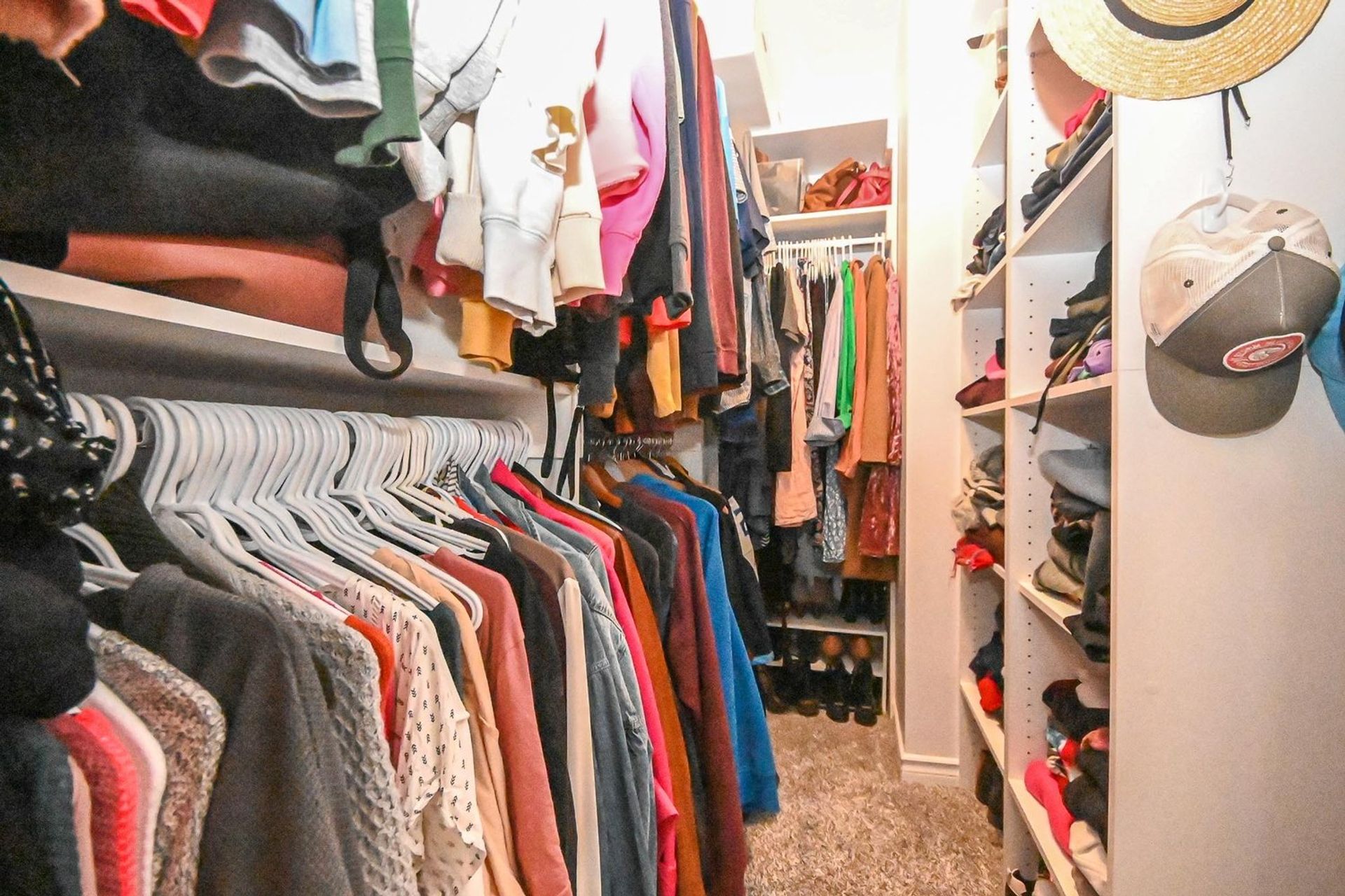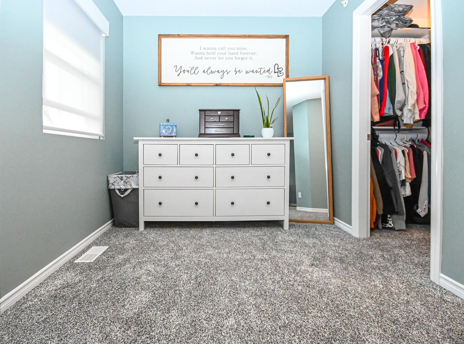 As you progress to the upper level there is a mid way landing featuring a custom built-in organizer meant to maximize the home's storage space. There are three bedrooms, two bathrooms, and updated carpeting (also on the stairs) on the upper floor. The primary bedroom is oversized with a walk-in closet, a new built-in organizer, and a stunning ensuite. Ensuite updates include: custom vanity with White Shimmer granite counters, soft close cabinets and floor lighting, a tiled shower with custom glass & Riobel Chrome Kit hand held sprayer/rain shower head, a new soaker tub, toilet, & updated subway tile flooring with radiant heating. There are new cordless roller shades throughout the entire home, and in the primary bedroom there is a specialty dual blind system with Tender Pewter blackout blinds layered under a fir 7% white blind designed to maintain light in the room while ensuring privacy.