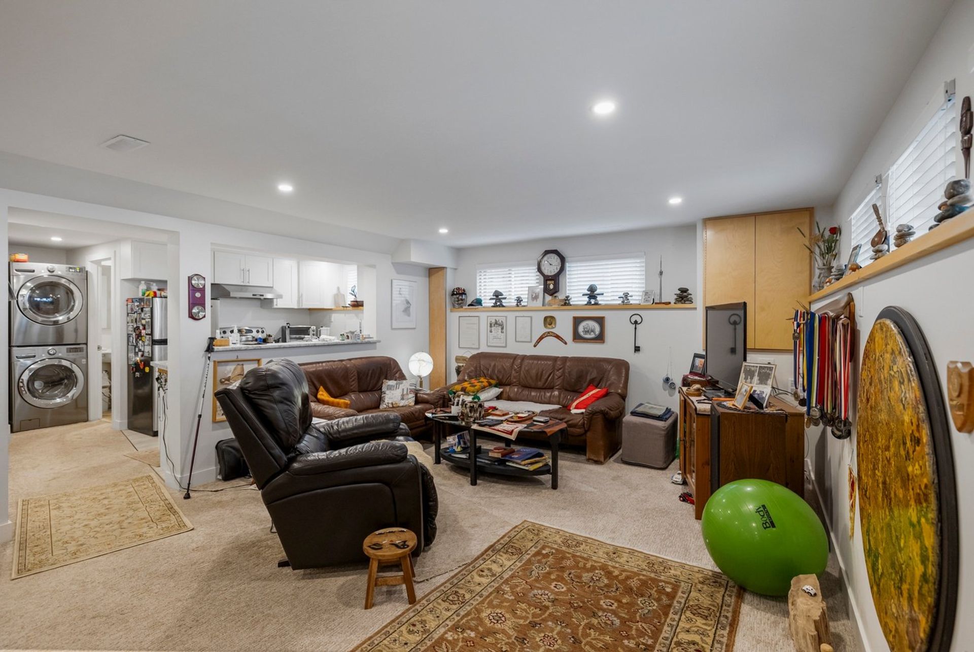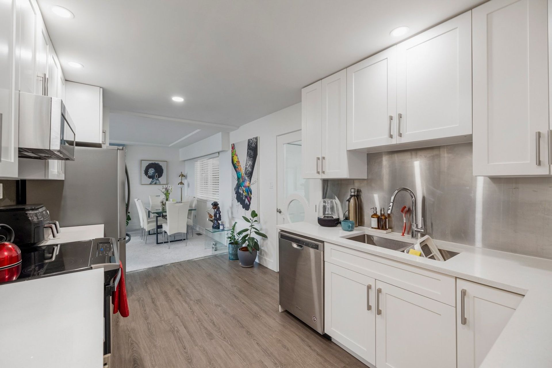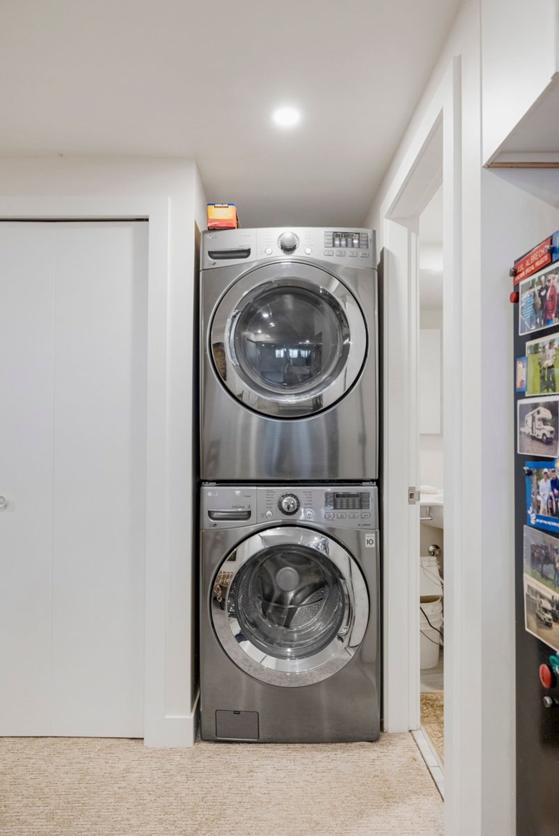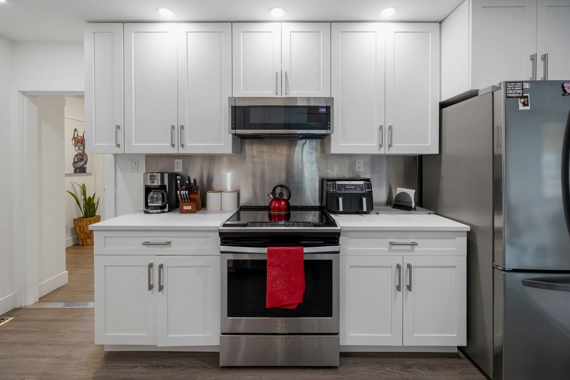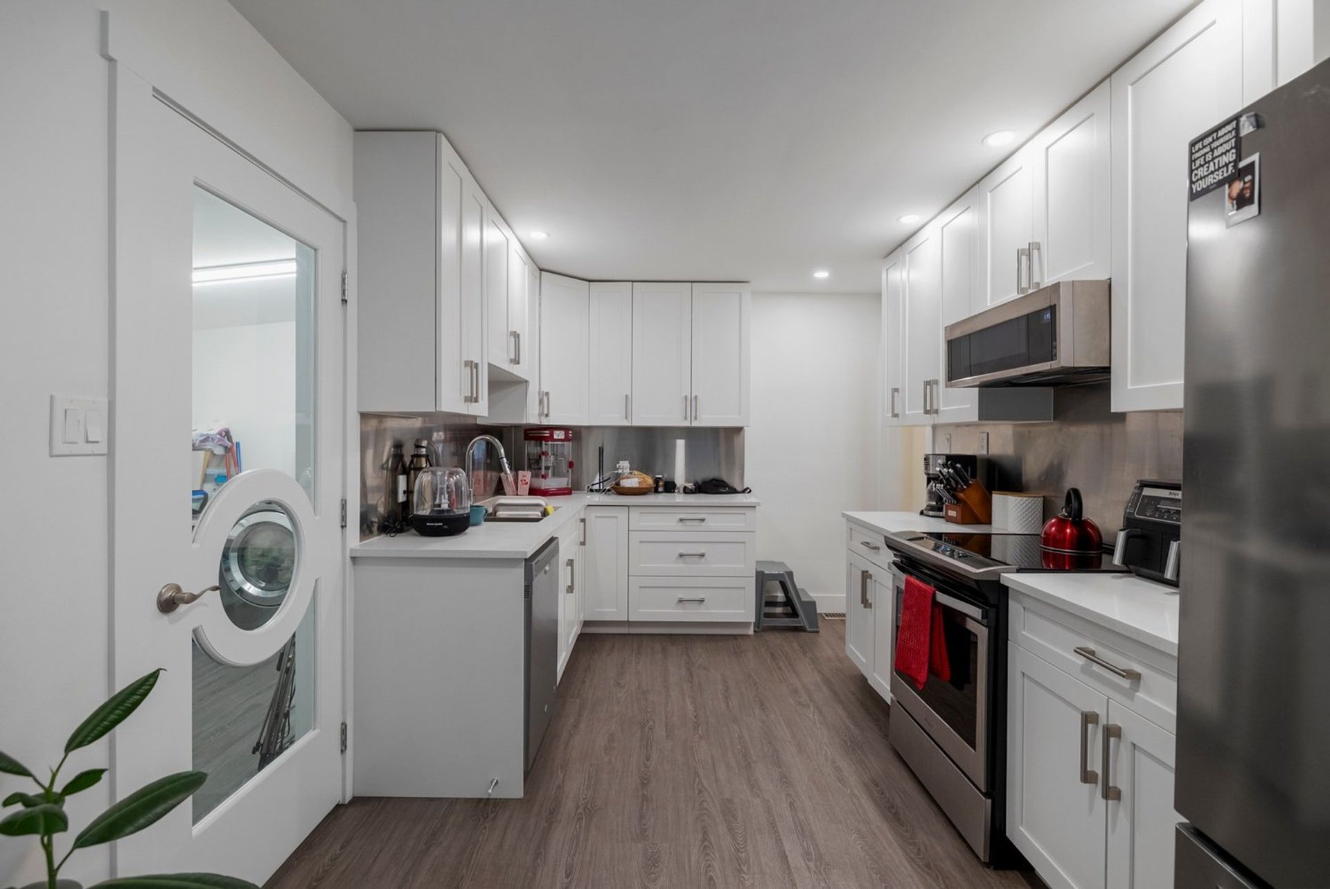 Although it is partially underground the lower two-bedroom unit has fantastic light with numerous windows in almost every room. The kitchen has been updated in a similar fashion to upstairs; stainless steel appliances, a dual oven, 3/4 sink with low divide, soft close cabinetry, and tile flooring. The kitchen has been partially opened creating a communal entertainment ready connection with the living room. The primary bedroom has a deep walk-in closet, the main bathroom is a four-piece with a deep soaker tub, and there is a full-size stacked washer/dryer tucked away in a closet. There is a partially covered driveway in the front affording enough room to park two cars.