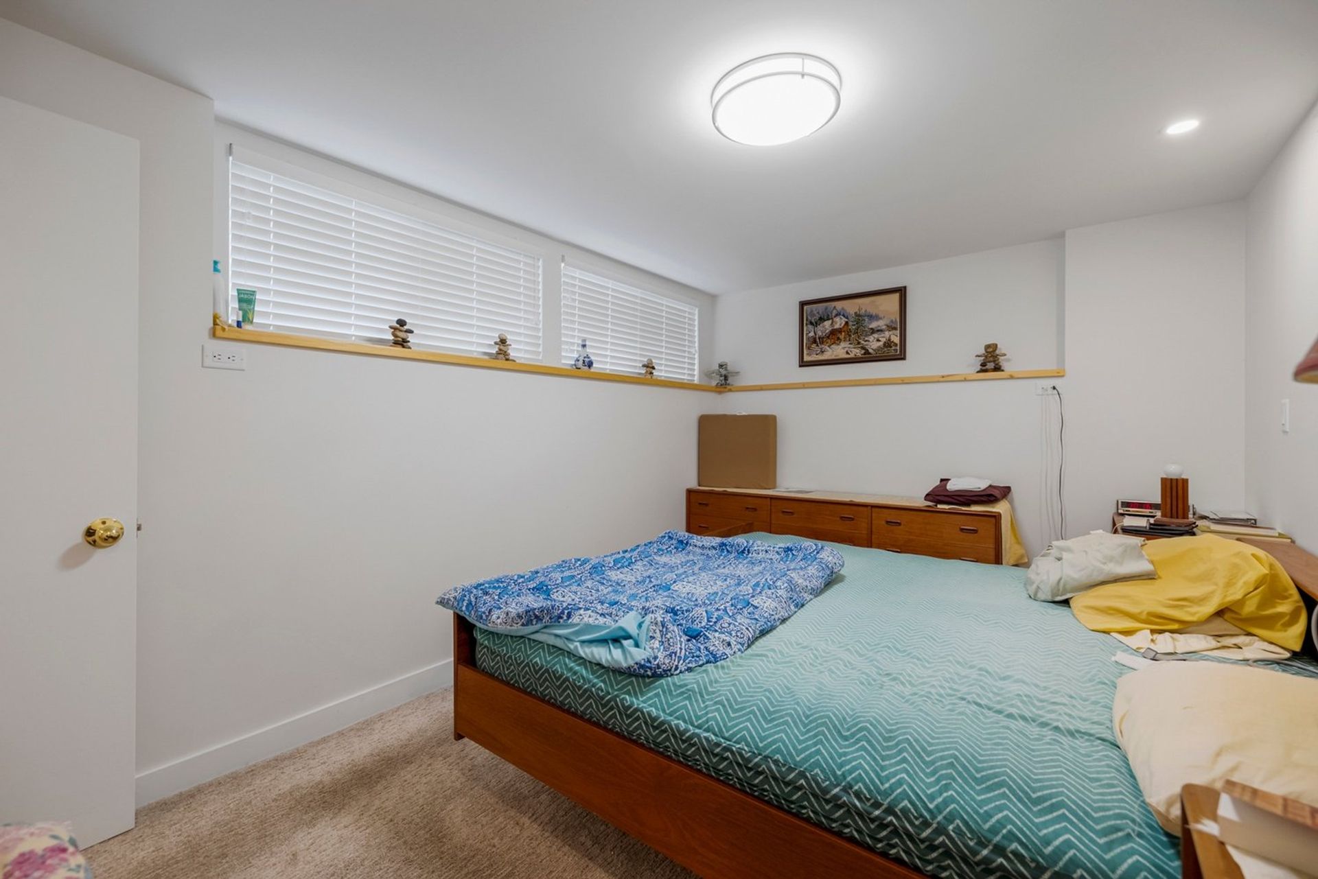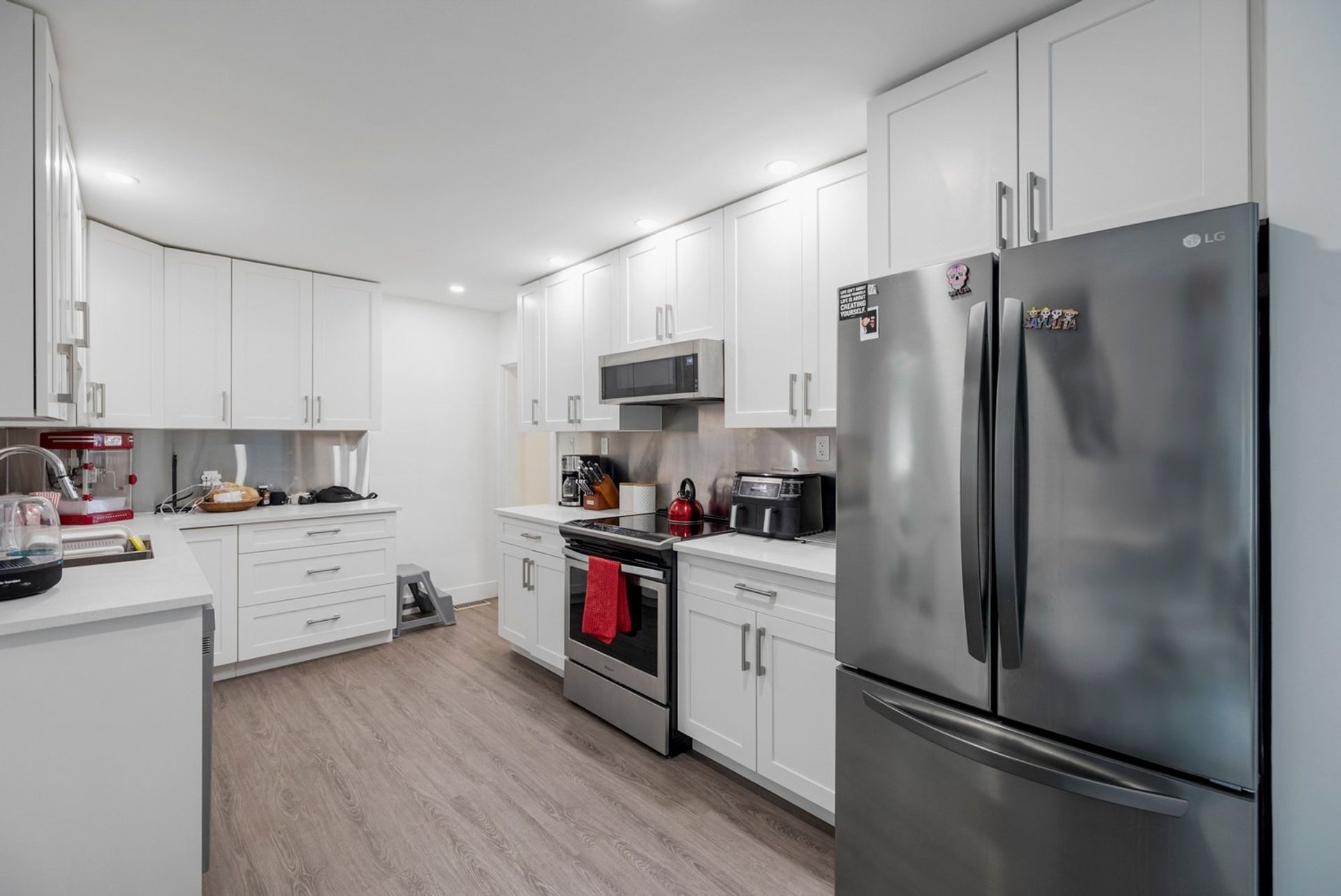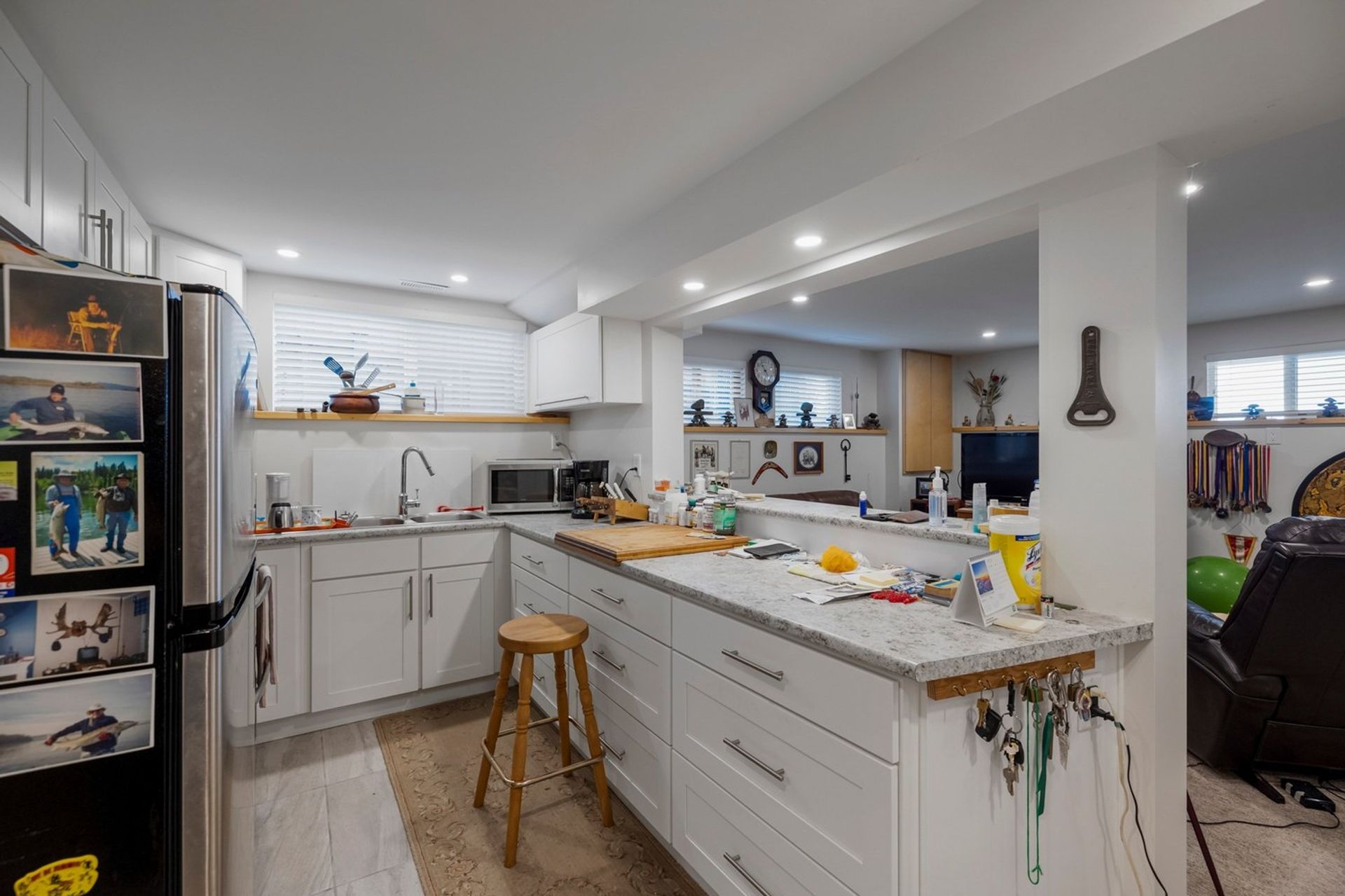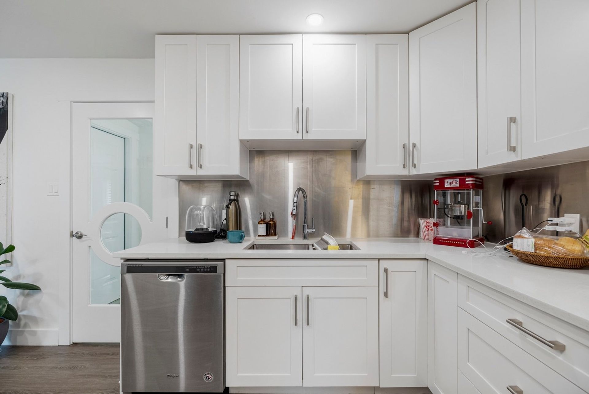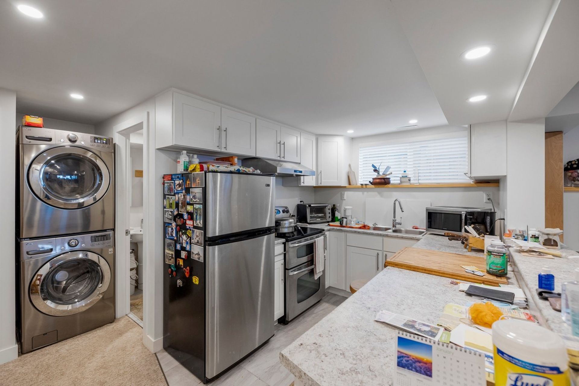 Although it is partially underground the lower two-bedroom unit has fantastic light with numerous windows in almost every room. The kitchen has been updated in a similar fashion to upstairs; stainless steel appliances, a dual oven, 3/4 sink with low divide, soft close cabinetry, and tile flooring. The kitchen has been partially opened creating a communal entertainment ready connection with the living room. The primary bedroom has a deep walk-in closet, the main bathroom is a four-piece with a deep soaker tub, and there is a full-size stacked washer/dryer tucked away in a closet. There is a partially covered driveway in the front affording enough room to park two cars.
