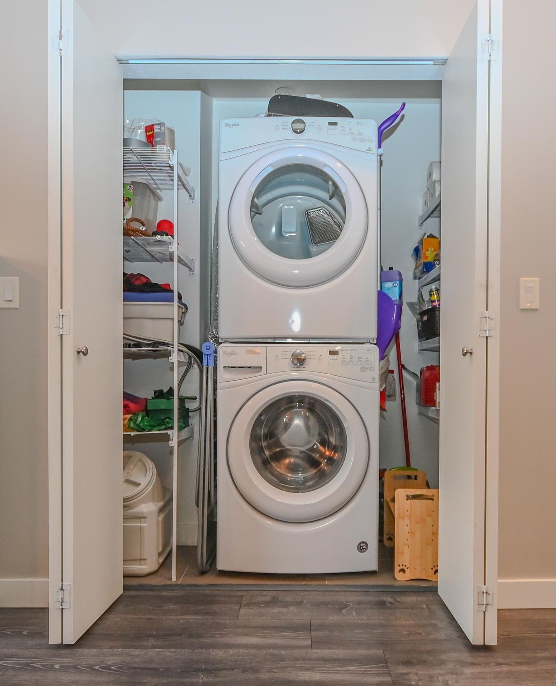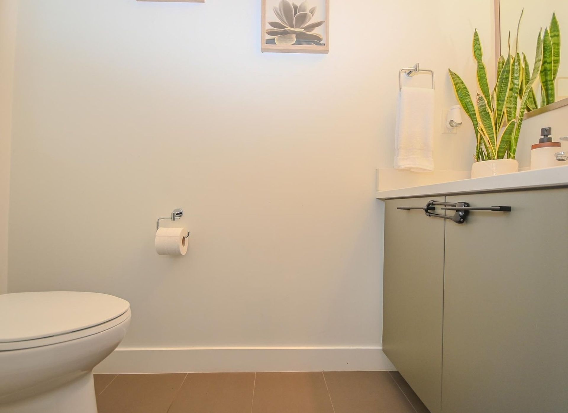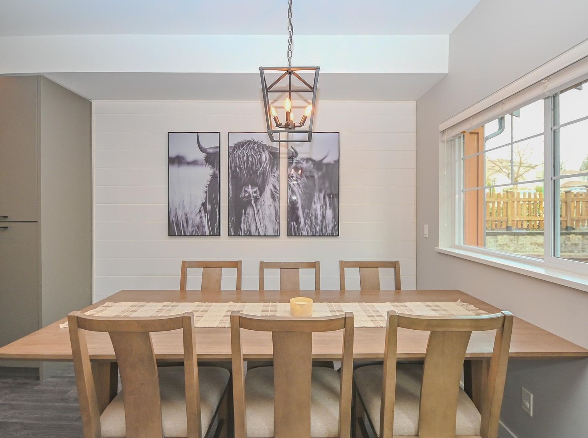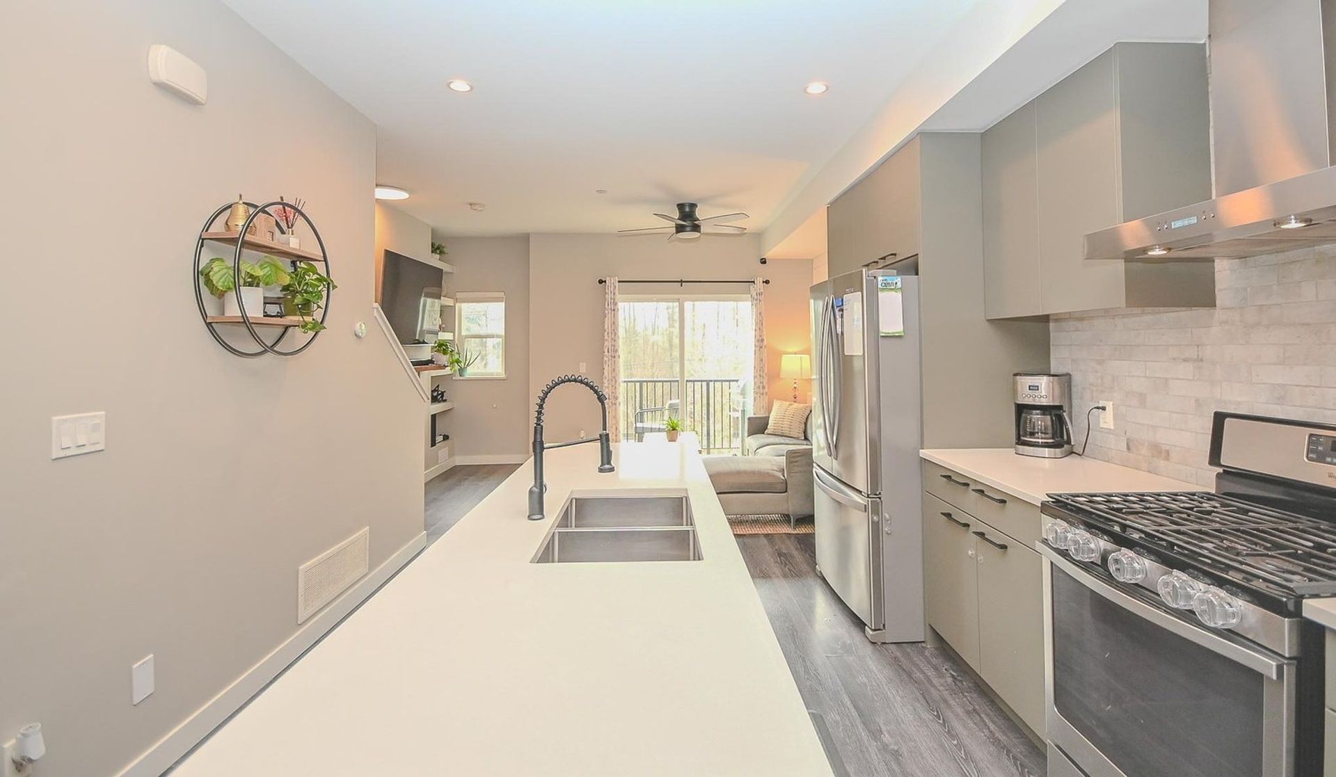 The home’s kitchen is gourmet inspired with a five-burner gas range, an extra wide French door fridge, a built-in microwave, quartz counters, a large island creating fantastic meal preparation space, all soft close cabinetry including two large pantry cupboards, a dual sink, and a tiled backsplash. The dining room features a shiplap accent wall (as does the living room) and is spacious enough for a full formal dining room table set up. The area has a large window overlooking the home's fully fenced backyard complete with planters housing new cedars, a partially covered patio, and a grass area; it is crisp, clean, easy to maintain, and ideal for both kids and pets in the upcoming warmer months. The open concept common area is complete with a living room with custom built-in shelves and a glass sliding door onto the home's front deck, with enough space for a BBQ and table/chair set. There is also a two-piece powder room and a closeted stacked washer and dryer with ample storage/pantry style space on the main floor.