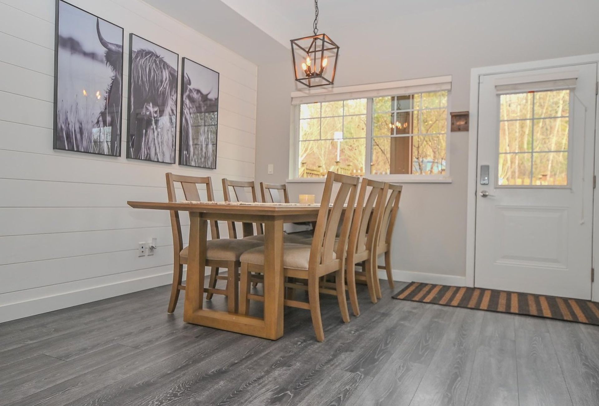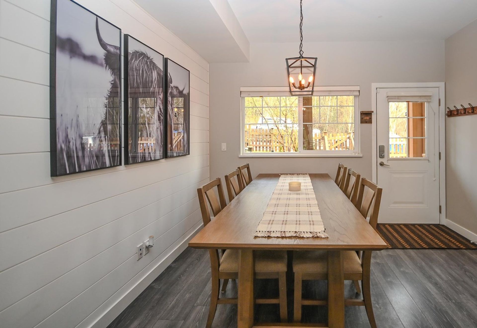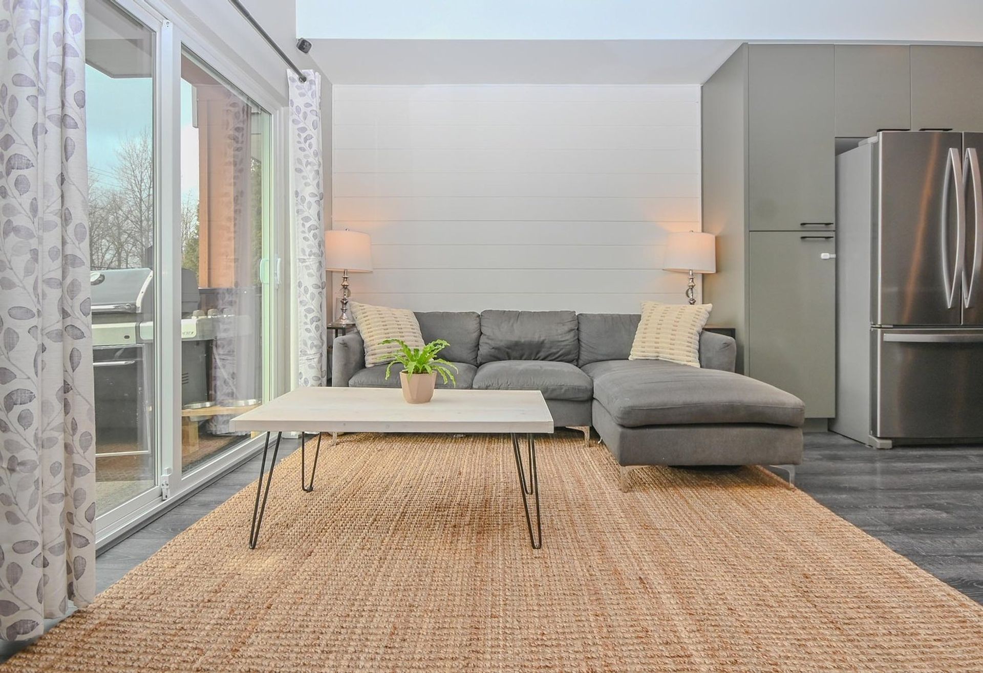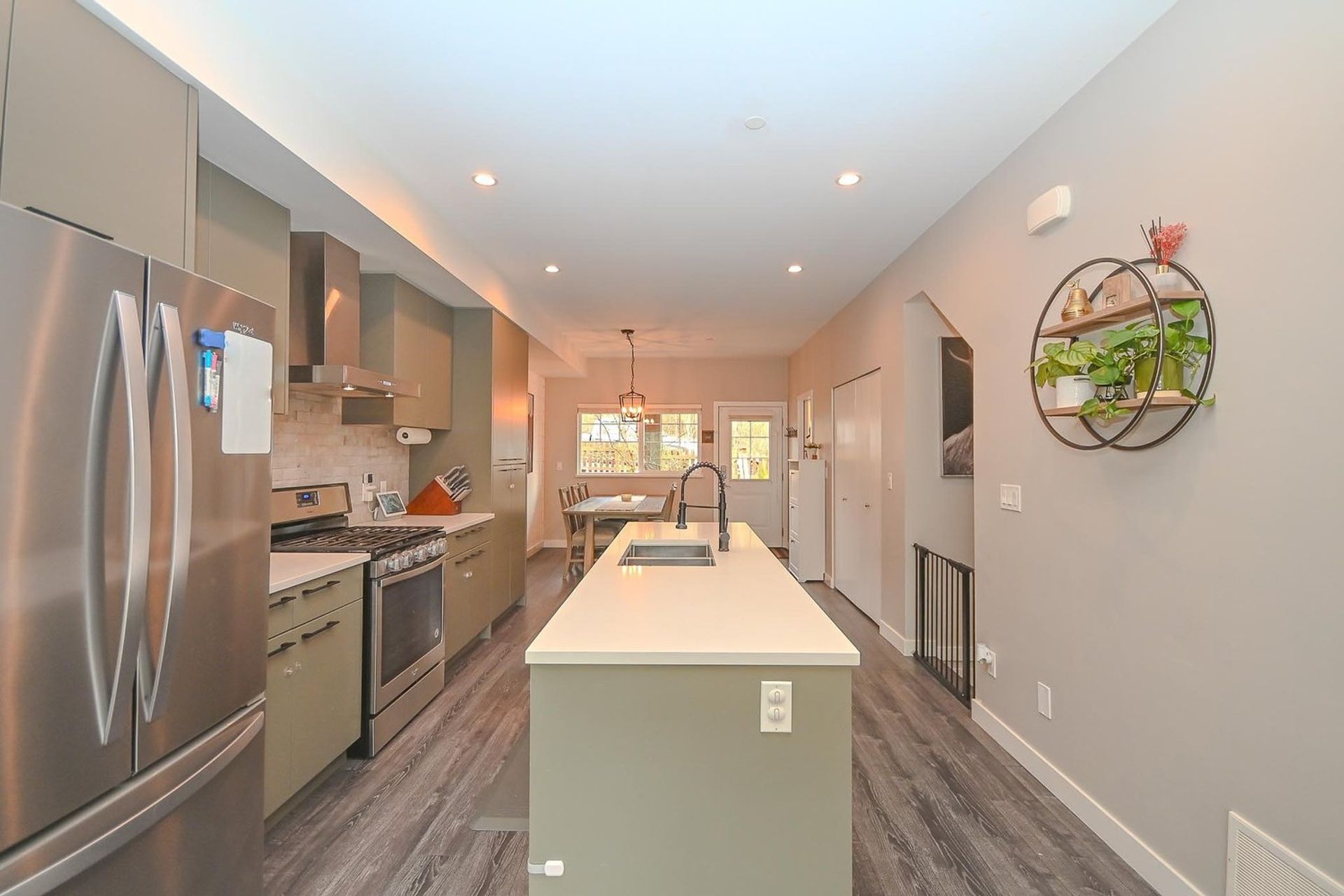 The home’s kitchen is gourmet inspired with a five-burner gas range, an extra wide French door fridge, a built-in microwave, quartz counters, a large island creating fantastic meal preparation space, all soft close cabinetry including two large pantry cupboards, a dual sink, and a tiled backsplash. The dining room features a shiplap accent wall (as does the living room) and is spacious enough for a full formal dining room table set up. The area has a large window overlooking the home's fully fenced backyard complete with planters housing new cedars, a partially covered patio, and a grass area; it is crisp, clean, easy to maintain, and ideal for both kids and pets in the upcoming warmer months. The open concept common area is complete with a living room with custom built-in shelves and a glass sliding door onto the home's front deck, with enough space for a BBQ and table/chair set. There is also a two-piece powder room and a closeted stacked washer and dryer with ample storage/pantry style space on the main floor.