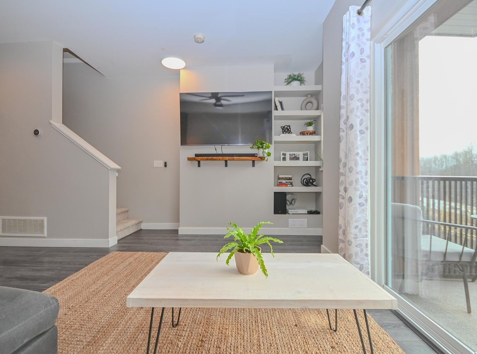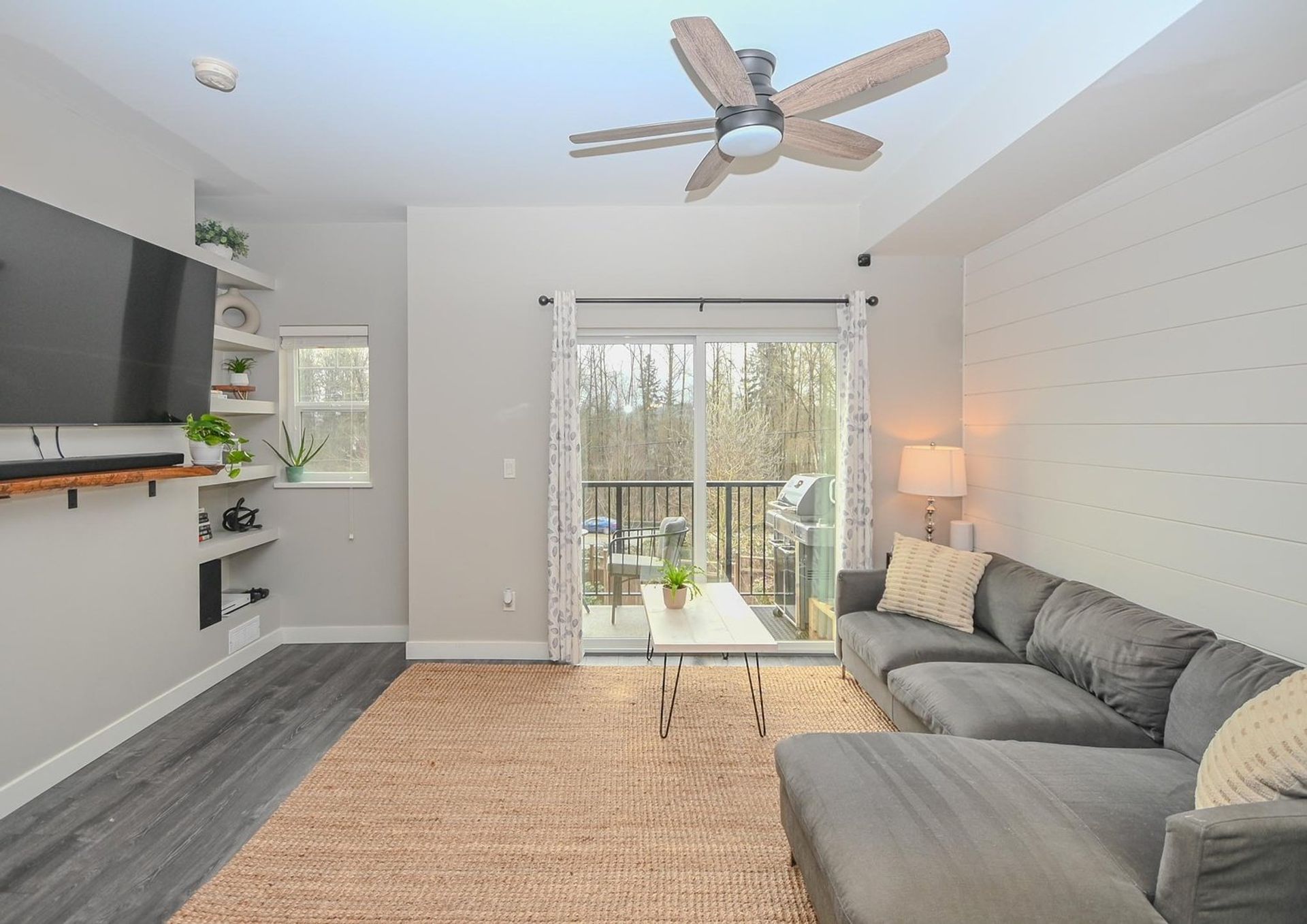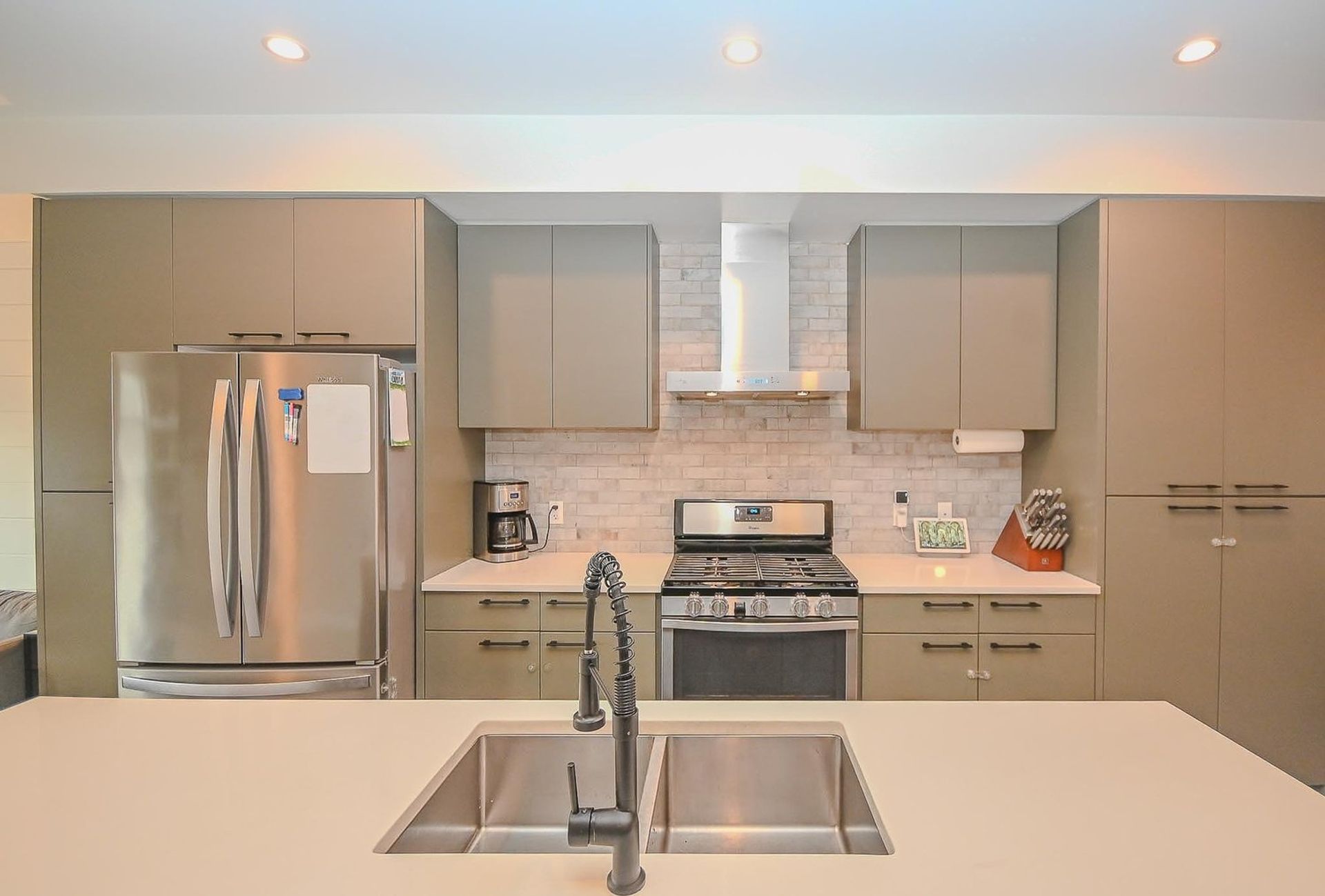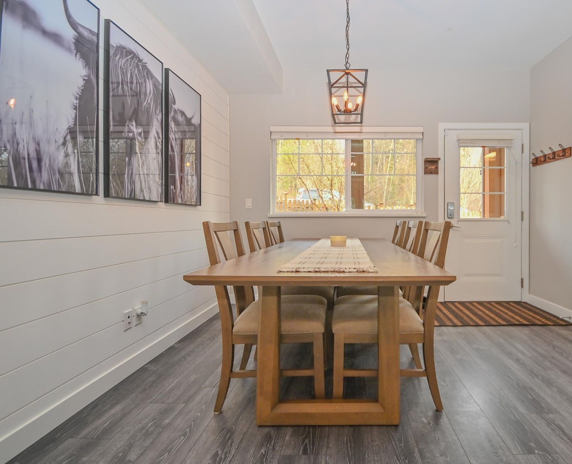 The home’s kitchen is gourmet inspired with a five-burner gas range, an extra wide French door fridge, a built-in microwave, quartz counters, a large island creating fantastic meal preparation space, all soft close cabinetry including two large pantry cupboards, a dual sink, and a tiled backsplash. The dining room features a shiplap accent wall (as does the living room) and is spacious enough for a full formal dining room table set up. The area has a large window overlooking the home's fully fenced backyard complete with planters housing new cedars, a partially covered patio, and a grass area; it is crisp, clean, easy to maintain, and ideal for both kids and pets in the upcoming warmer months. The open concept common area is complete with a living room with custom built-in shelves and a glass sliding door onto the home's front deck, with enough space for a BBQ and table/chair set. There is also a two-piece powder room and a closeted stacked washer and dryer with ample storage/pantry style space on the main floor.