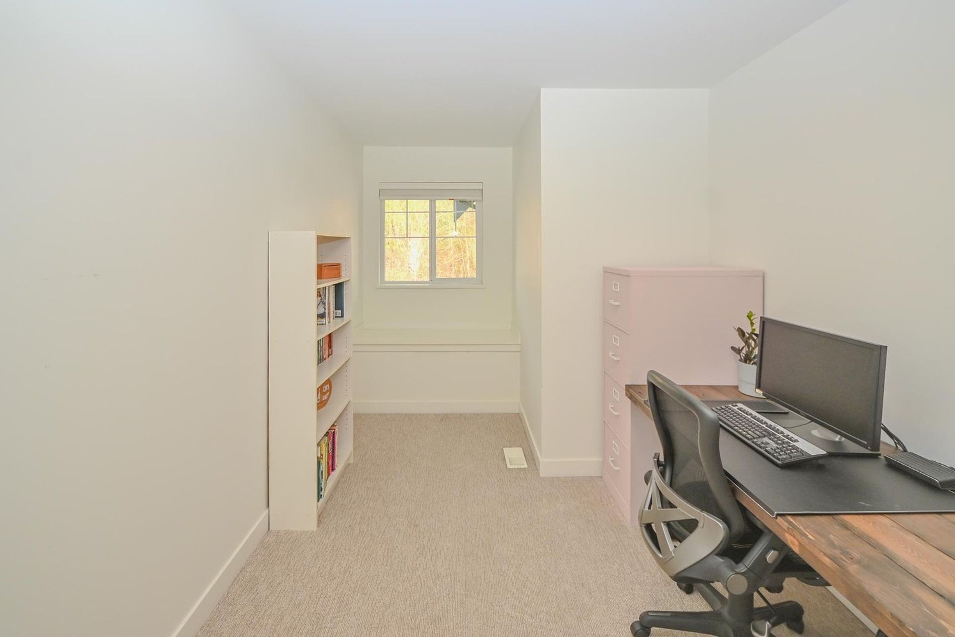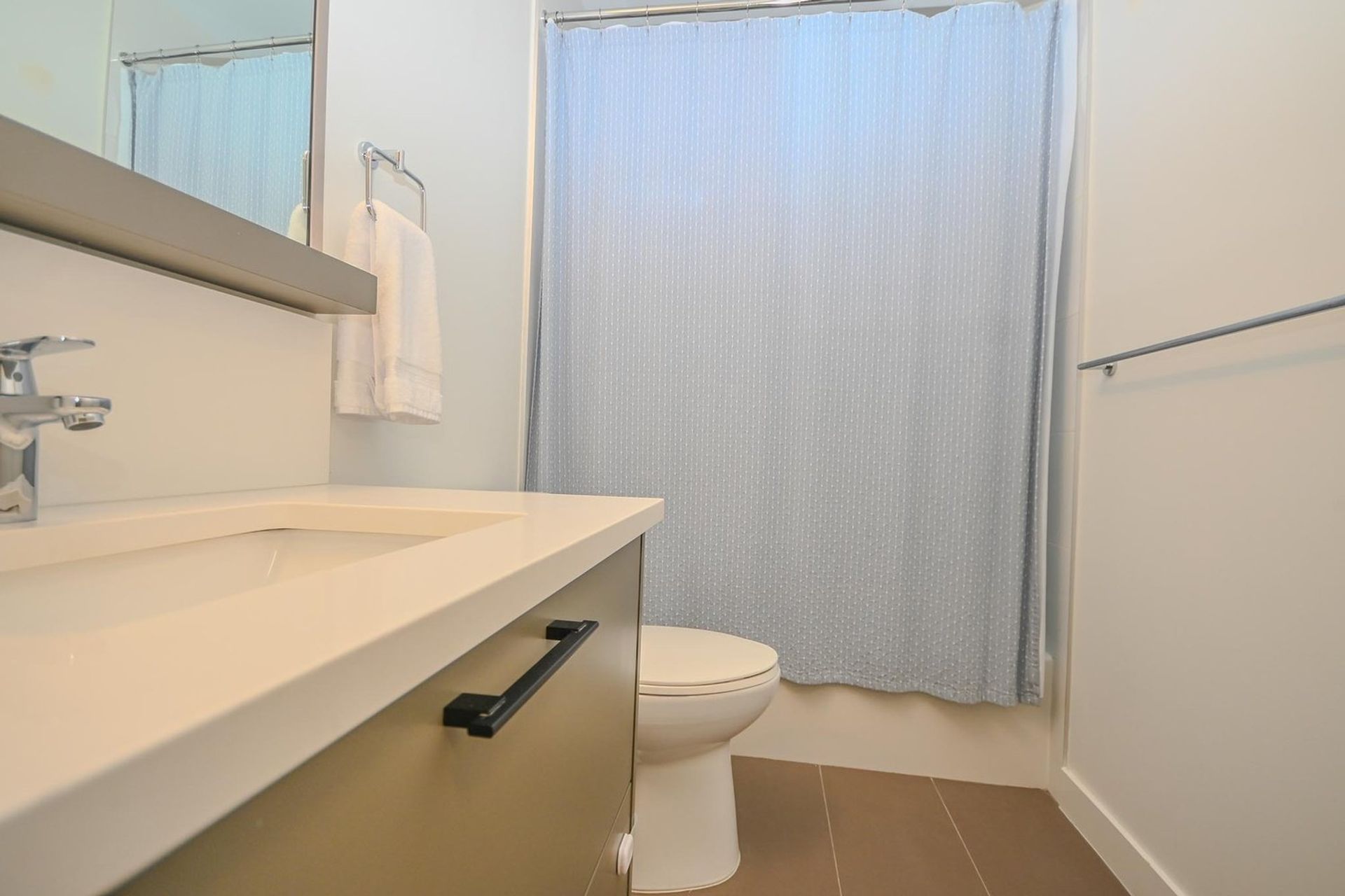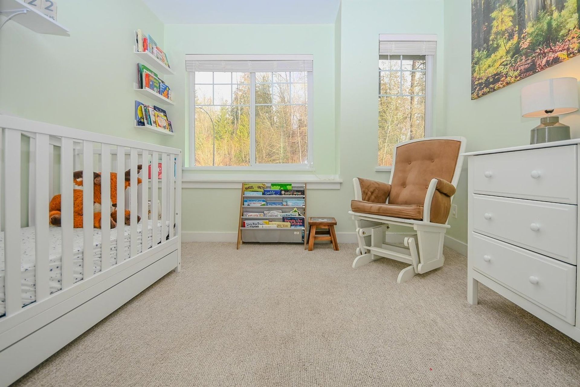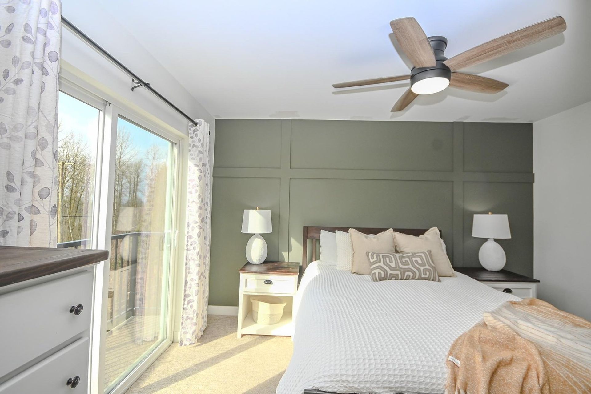 On the upper floor, there are three bedrooms including two with window benches showcasing a view of green space. The primary bedroom has a private balcony with a seasonal peekaboo Fraser River view, a wainscoting feature wall, an extra deep closet, and a three-piece ensuite with tiled shower. The main bathroom on the upper floor is a four-piece with quartz counters and subway tiling; all three of the home’s bathrooms have matching features.