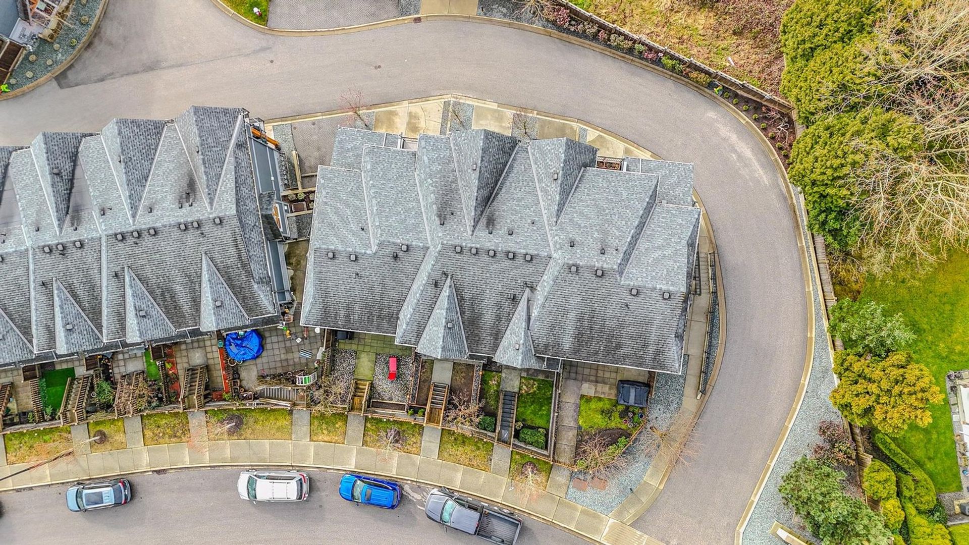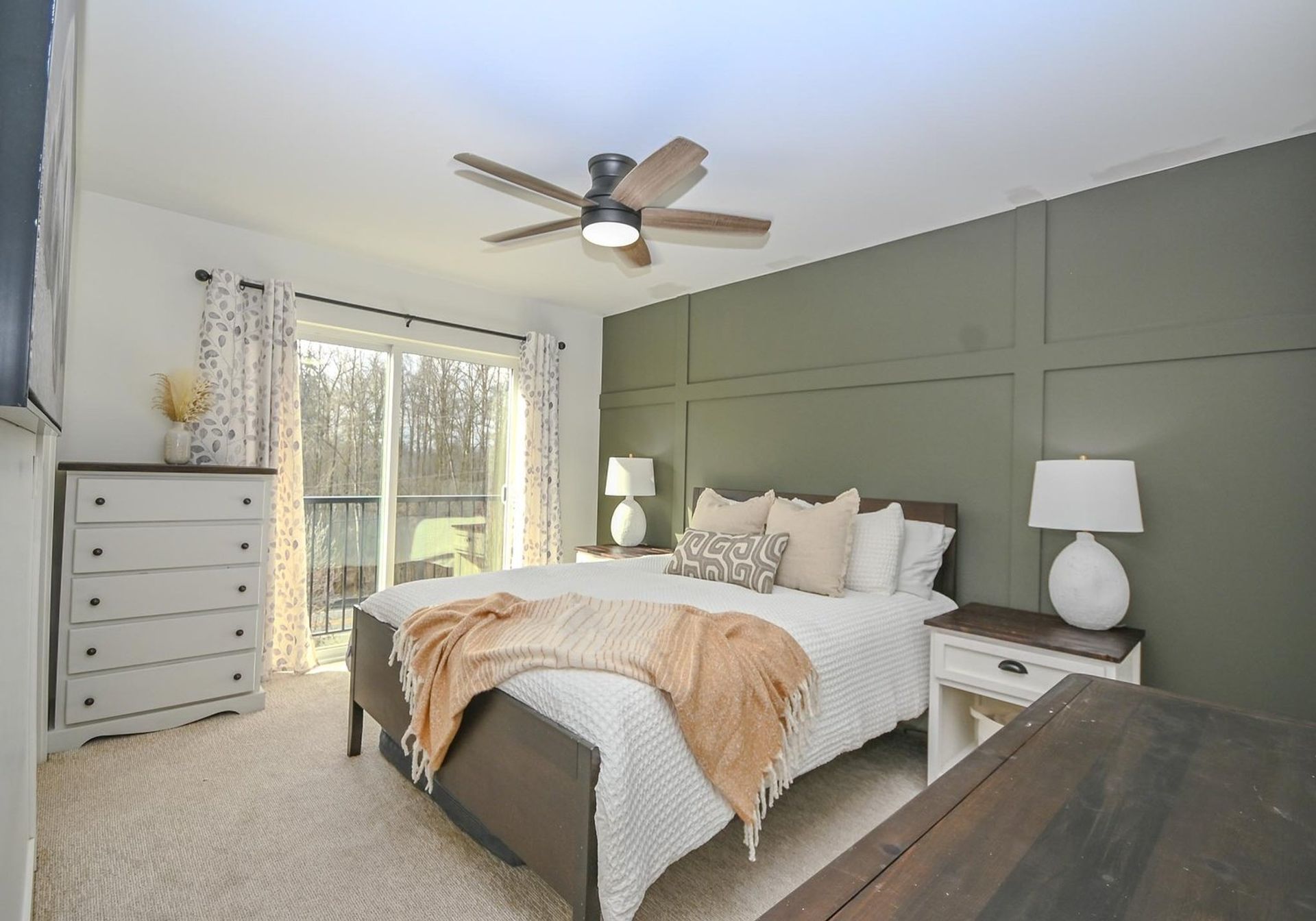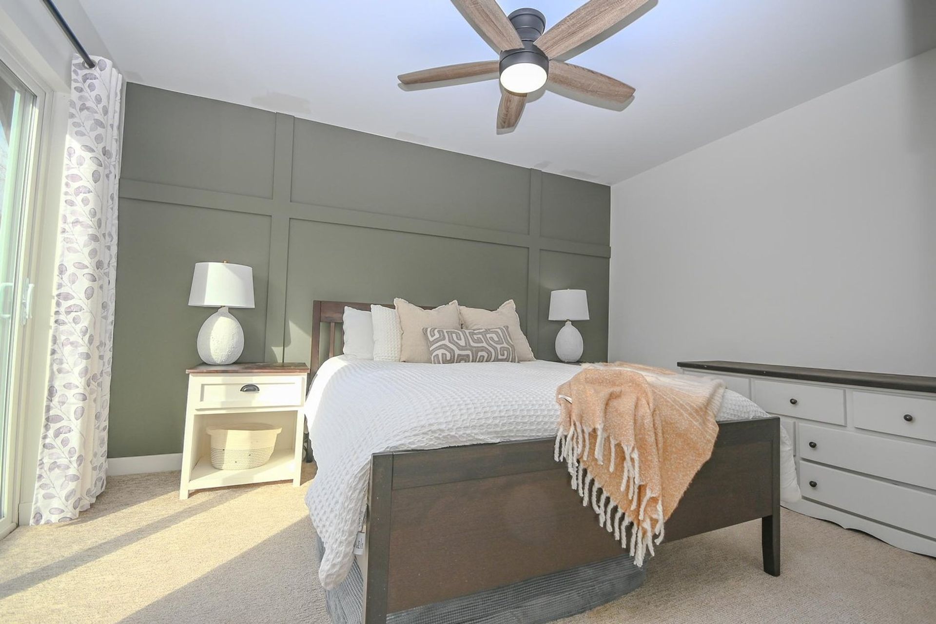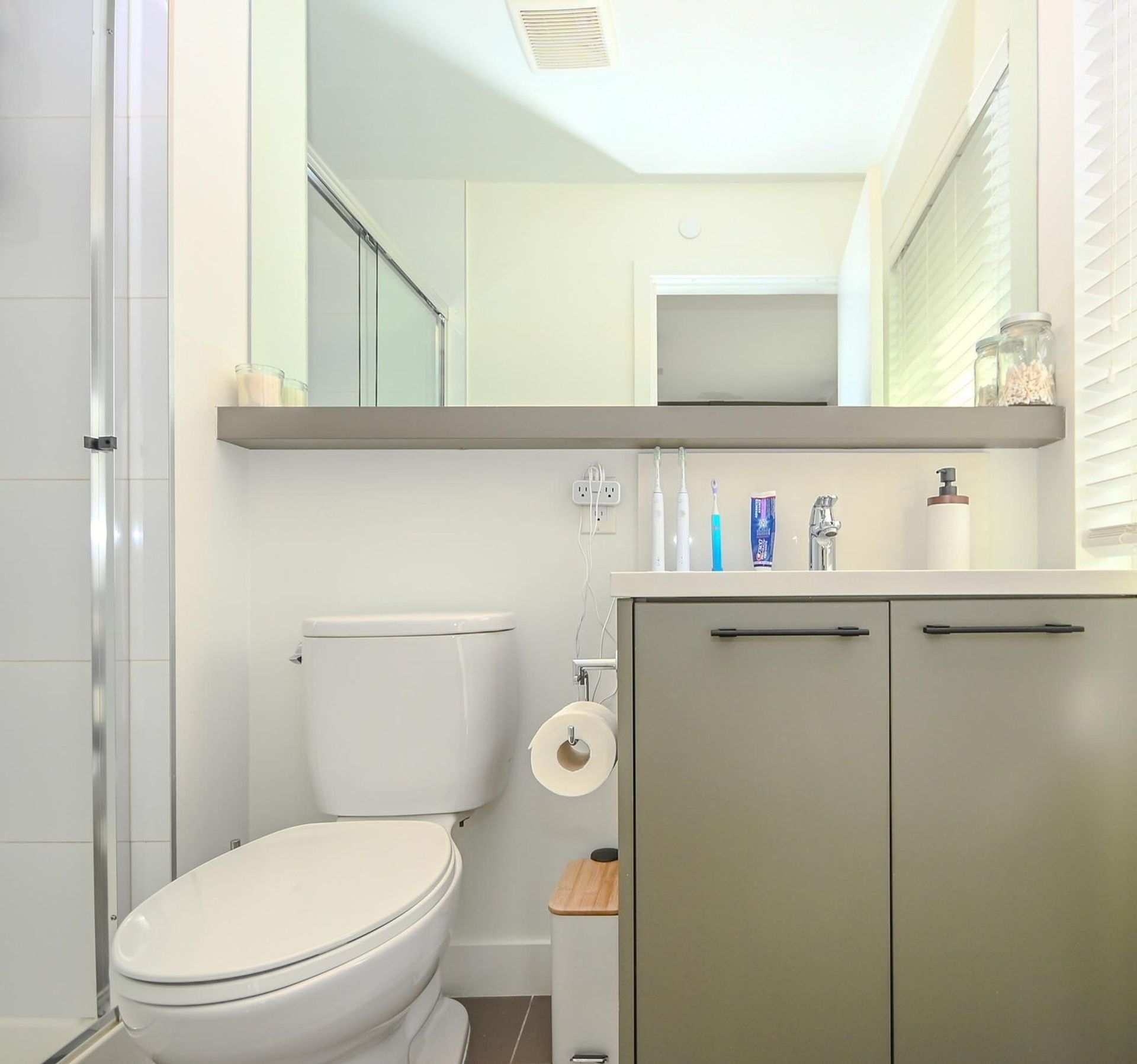 On the upper floor, there are three bedrooms including two with window benches showcasing a view of green space. The primary bedroom has a private balcony with a seasonal peekaboo Fraser River view, a wainscoting feature wall, an extra deep closet, and a three-piece ensuite with tiled shower. The main bathroom on the upper floor is a four-piece with quartz counters and subway tiling; all three of the home’s bathrooms have matching features.
