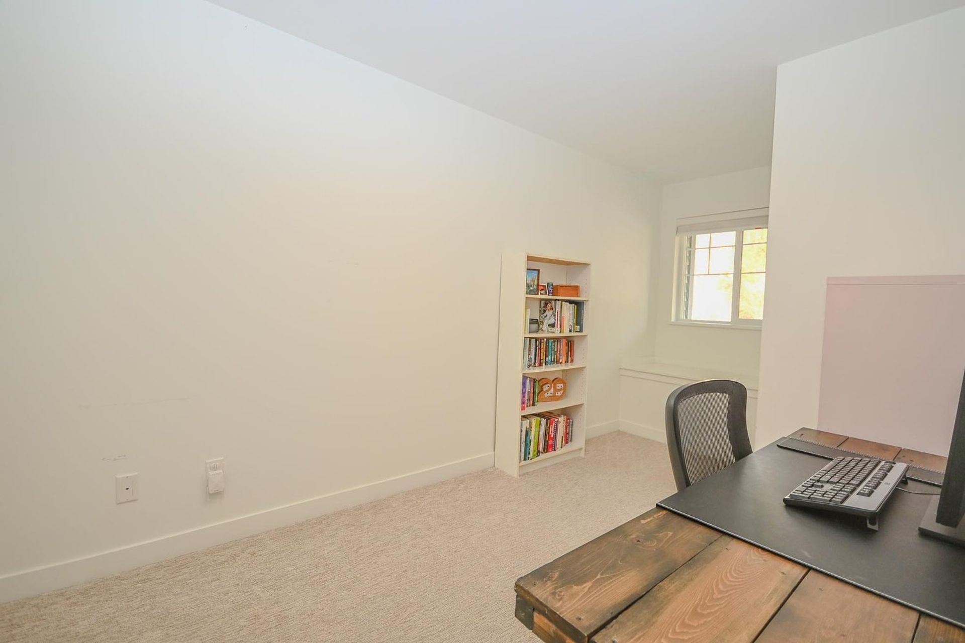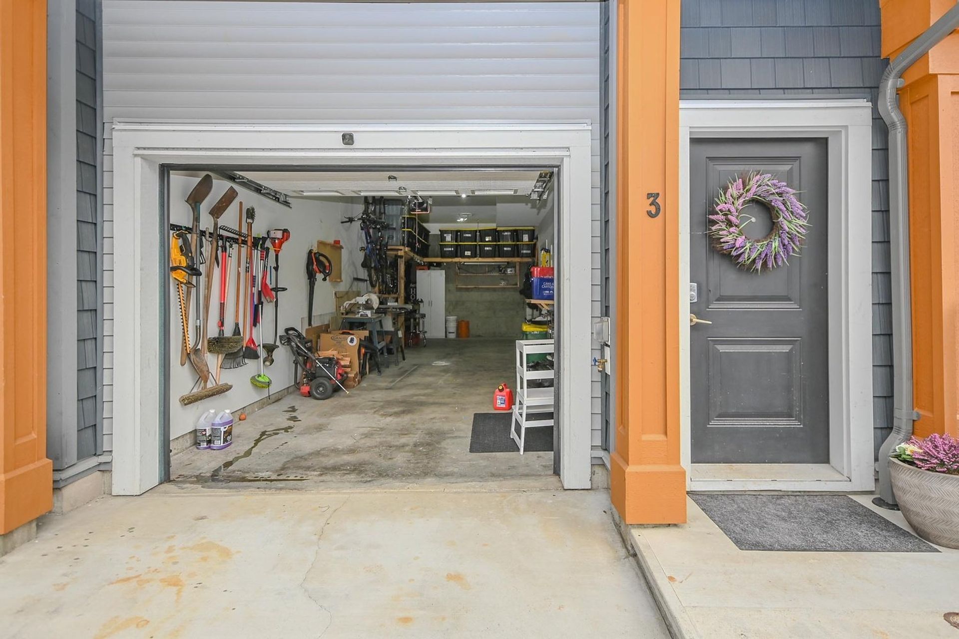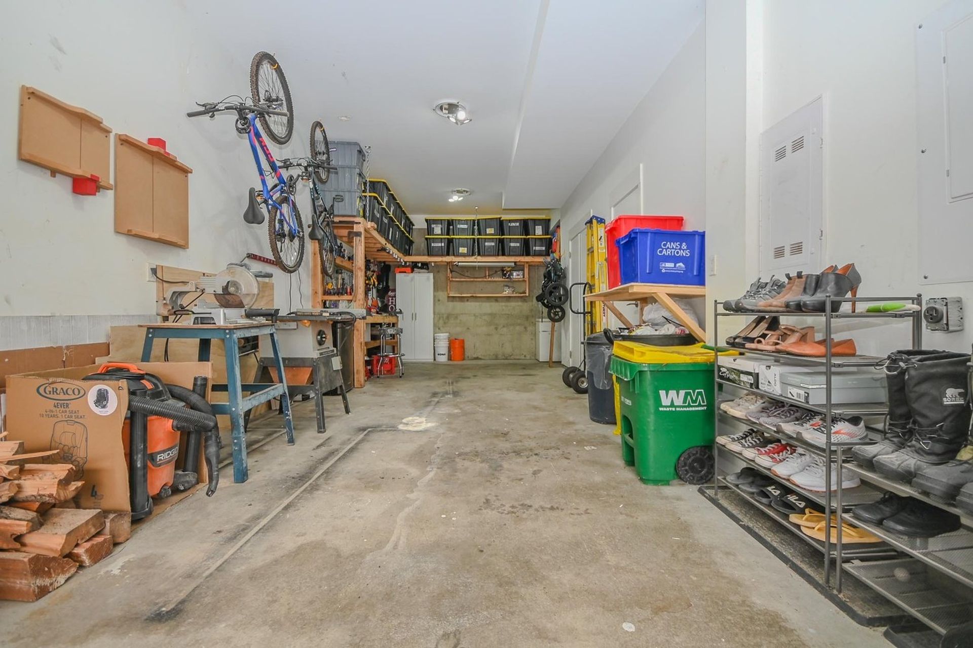 The lower level of the home has a dedicated foyer area off the tandem garage. Combined, there is enough space to park three cars: two within the garage and one on the driveway. There is also street parking in front of the home’s fenced yard. The garage itself has ultra high ceilings with built-in storage racks sitting well above regular car clearance. There is also a substantial under-stair storage area; part of the tandem is currently being used as a workshop.