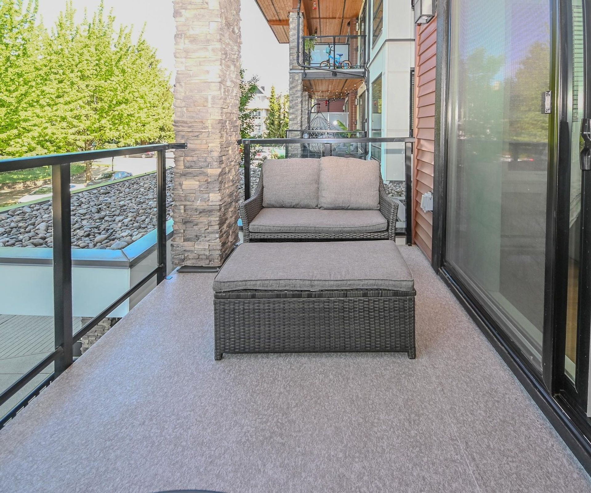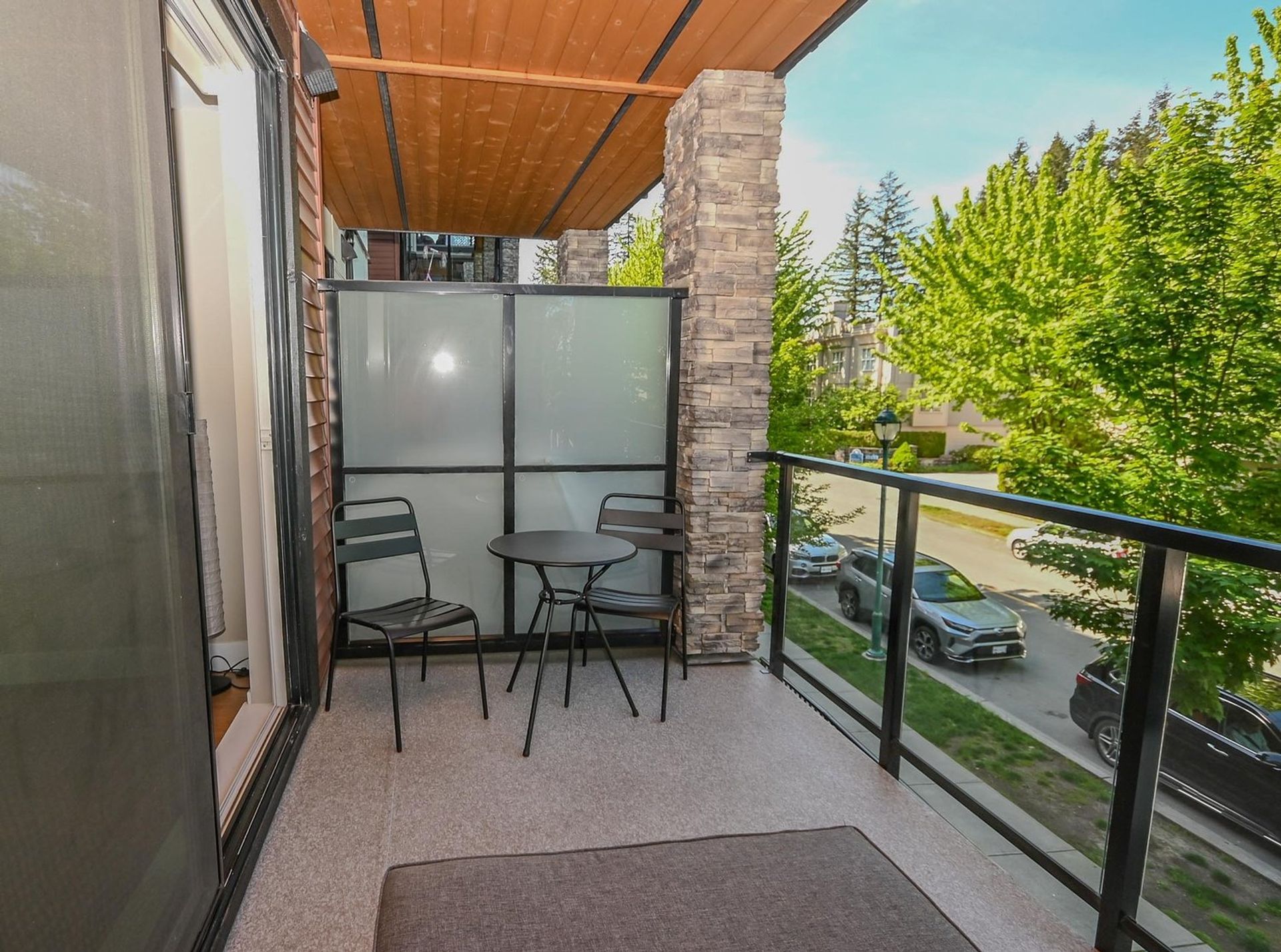 The living room includes a presentation electric fireplace and a sliding glass door onto a fully covered deck, overlooking brilliant greenery, with enough space for a BBQ and patio setup; you are now summer ready. The spacious bedroom has a functional alcove which would be ideal for a desk/sitting area & walk-in closet with built-in organizers. The main bathroom is a cheater ensuite. It is a stunning four piece with a deep soaker tub & marbled tile. This unit also includes a bonus den which is perfect as a storage area or a home office. There is a closeted stacked washer/dryer, and the complex features a peaceful garden courtyard with multiple sitting areas awaiting those looking for an easy nature break.