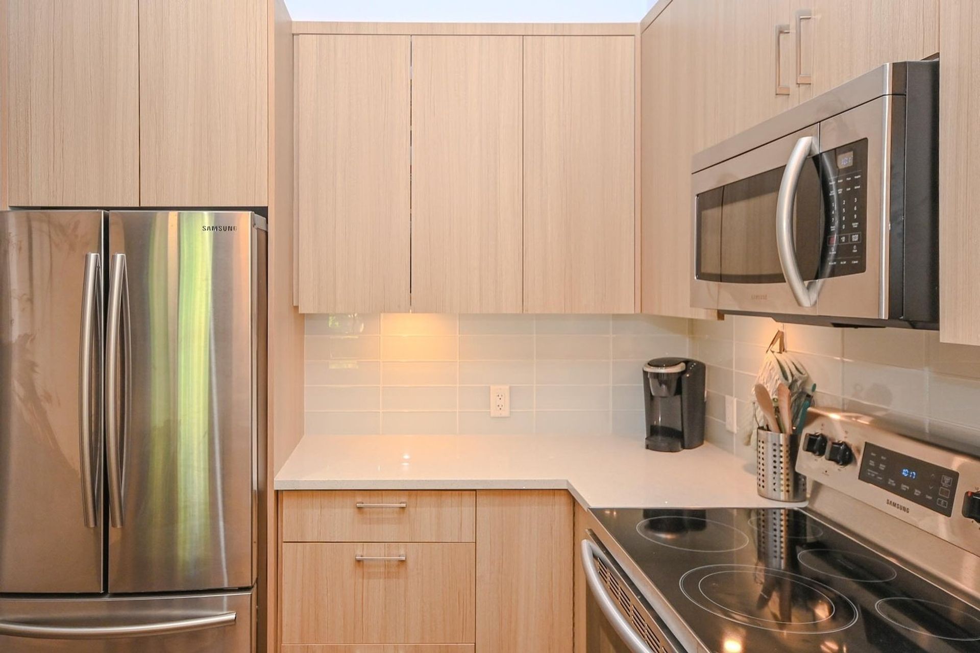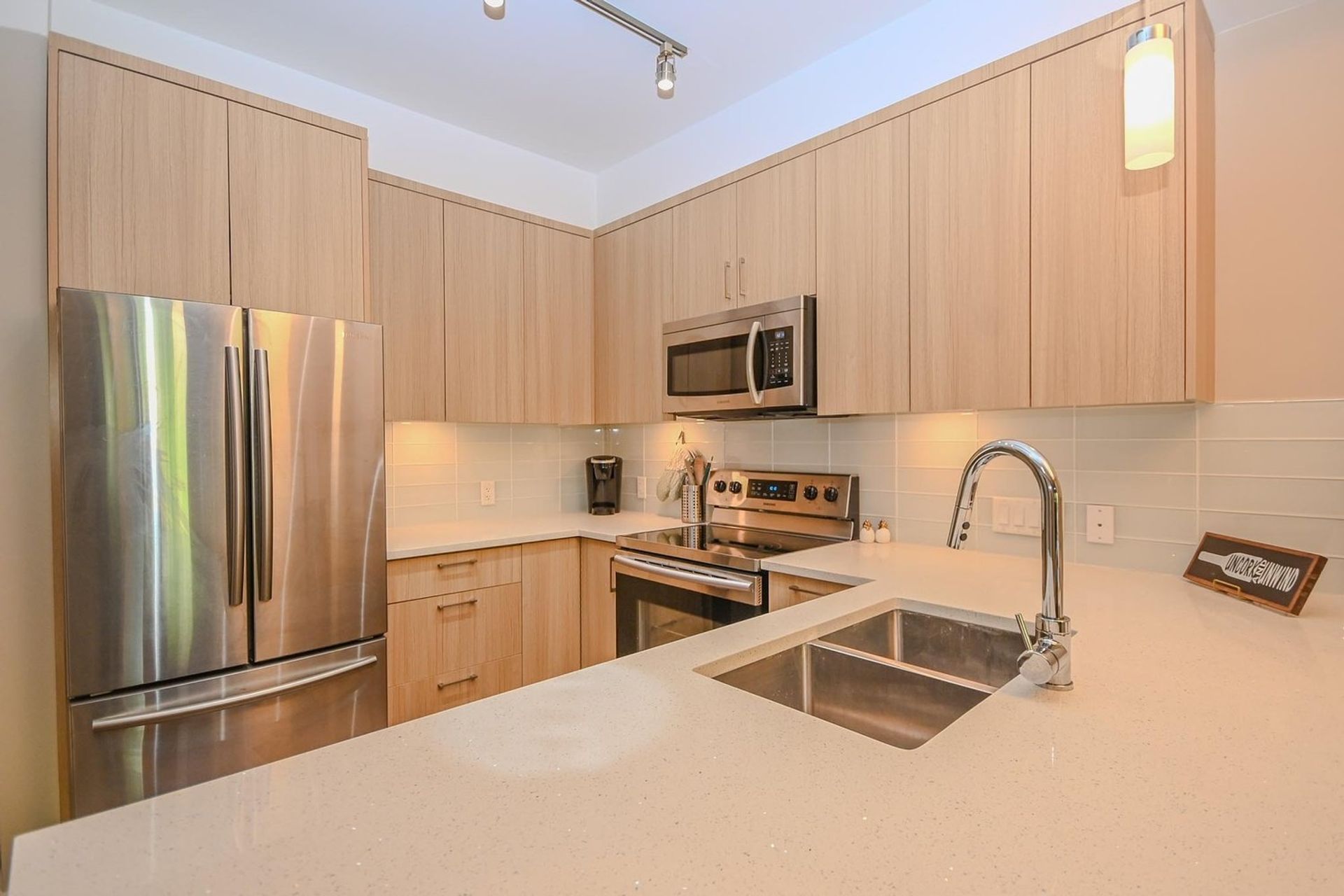 At six years young this home boosts a light color scheme keeping it bright and welcoming. The kitchen includes great cabinet space and all stainless-steel appliances, with a French door fridge, a built-in microwave, a deep double sink, shining quartz counters, a beautiful subway tile style backsplash, and accent lighting. An eating bar transitions to the dining room which is open to the living room.